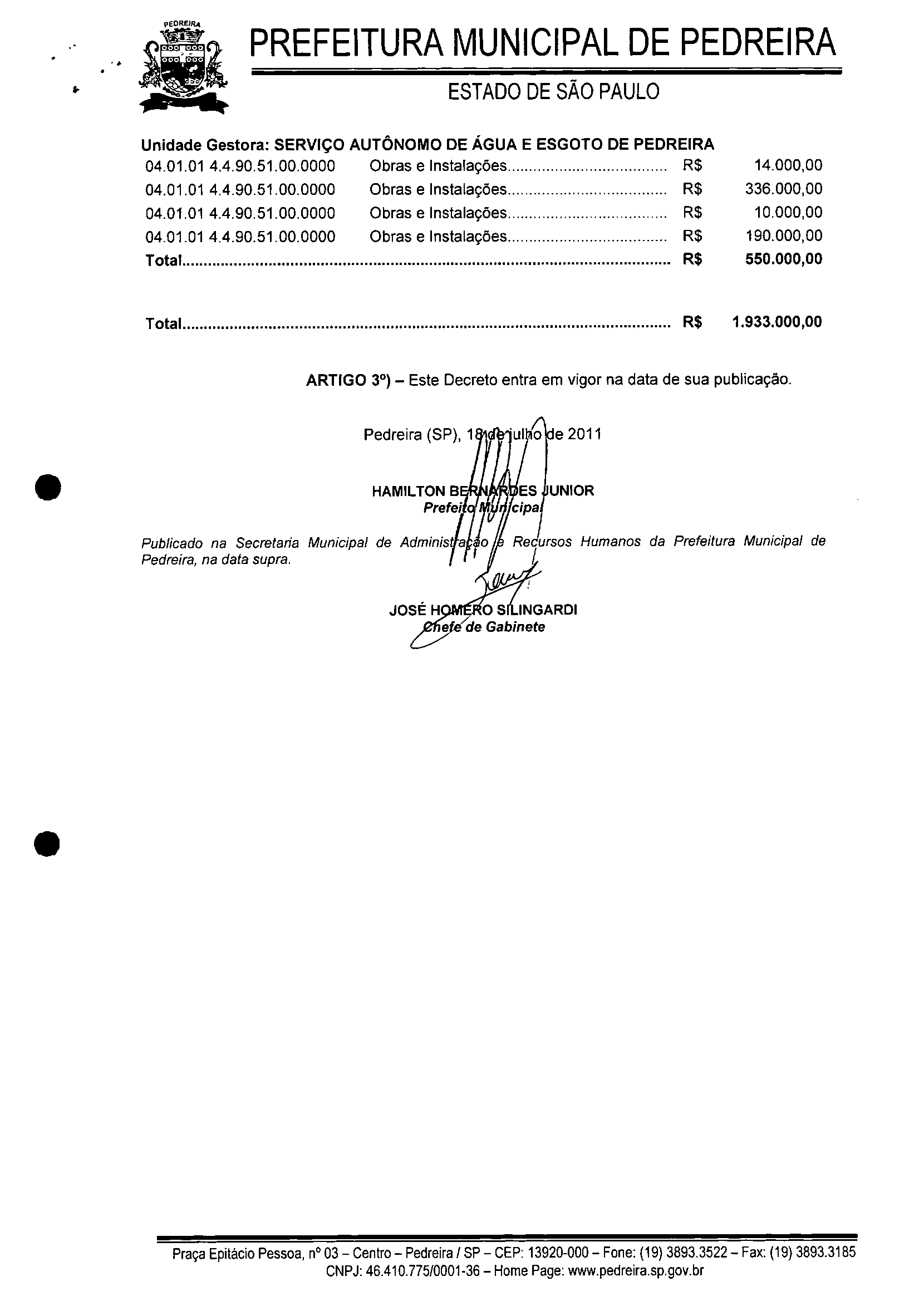 Ementa: Abre crédito adicional suplementar no valor de R$ 1.933.000,00 (um milhão, novecentos e trinta e três mil reais).