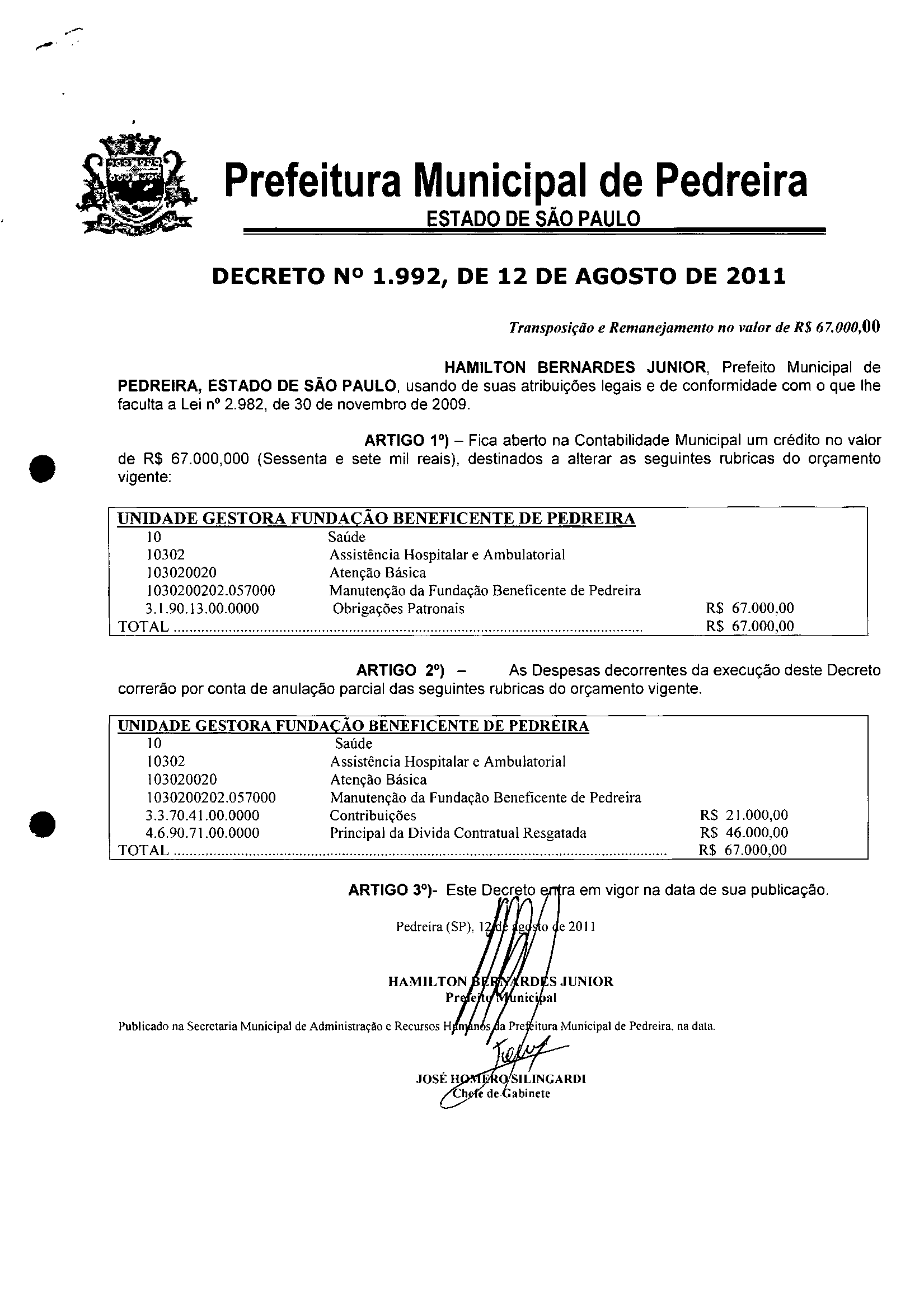 Ementa: Transposição e Remanejamento no valor de RS 67,000.00