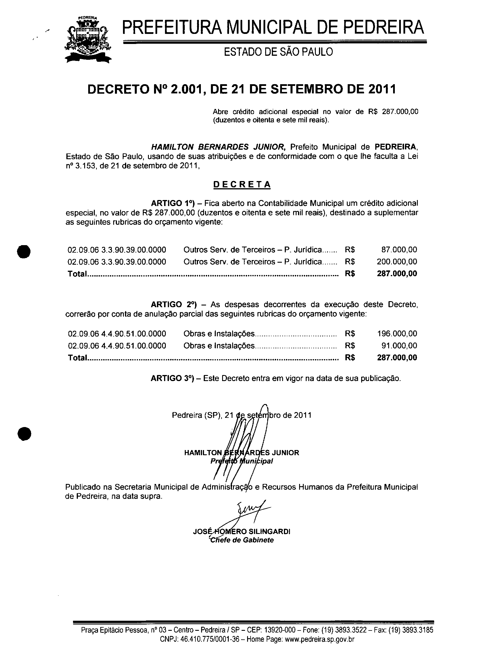 Ementa: Abre crédito adicional especial no valor de R$ 287.000,00 (duzentos e oitenta e sete mil reais).