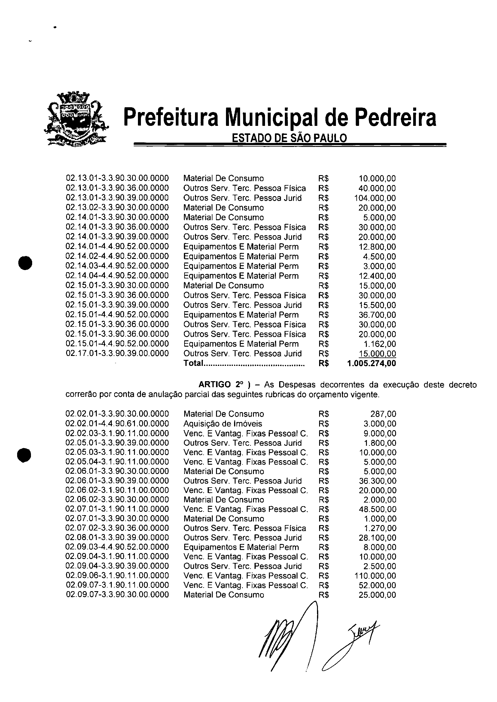 Ementa: Transposição e Remanejamento no valor RS 1.005.274,00