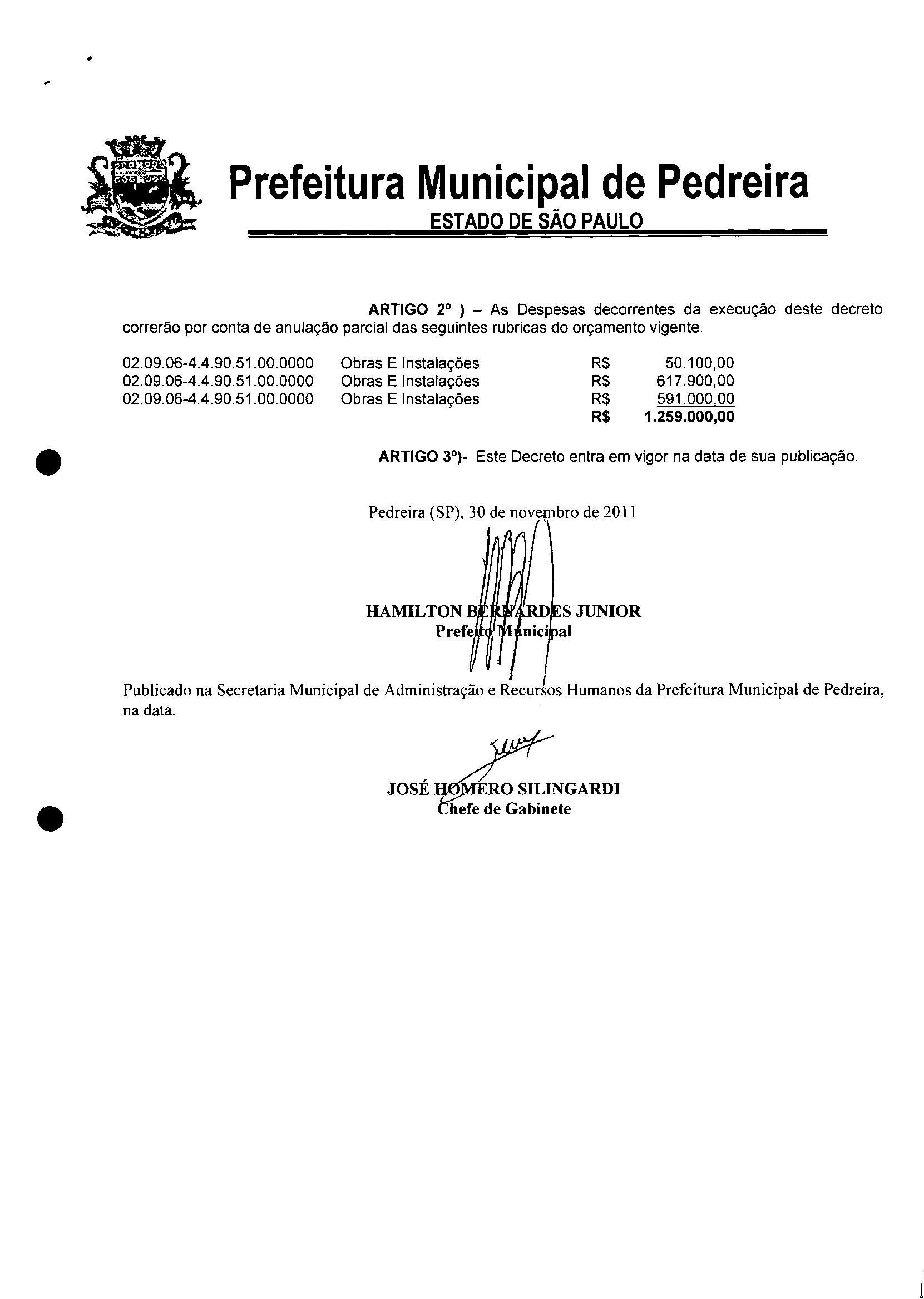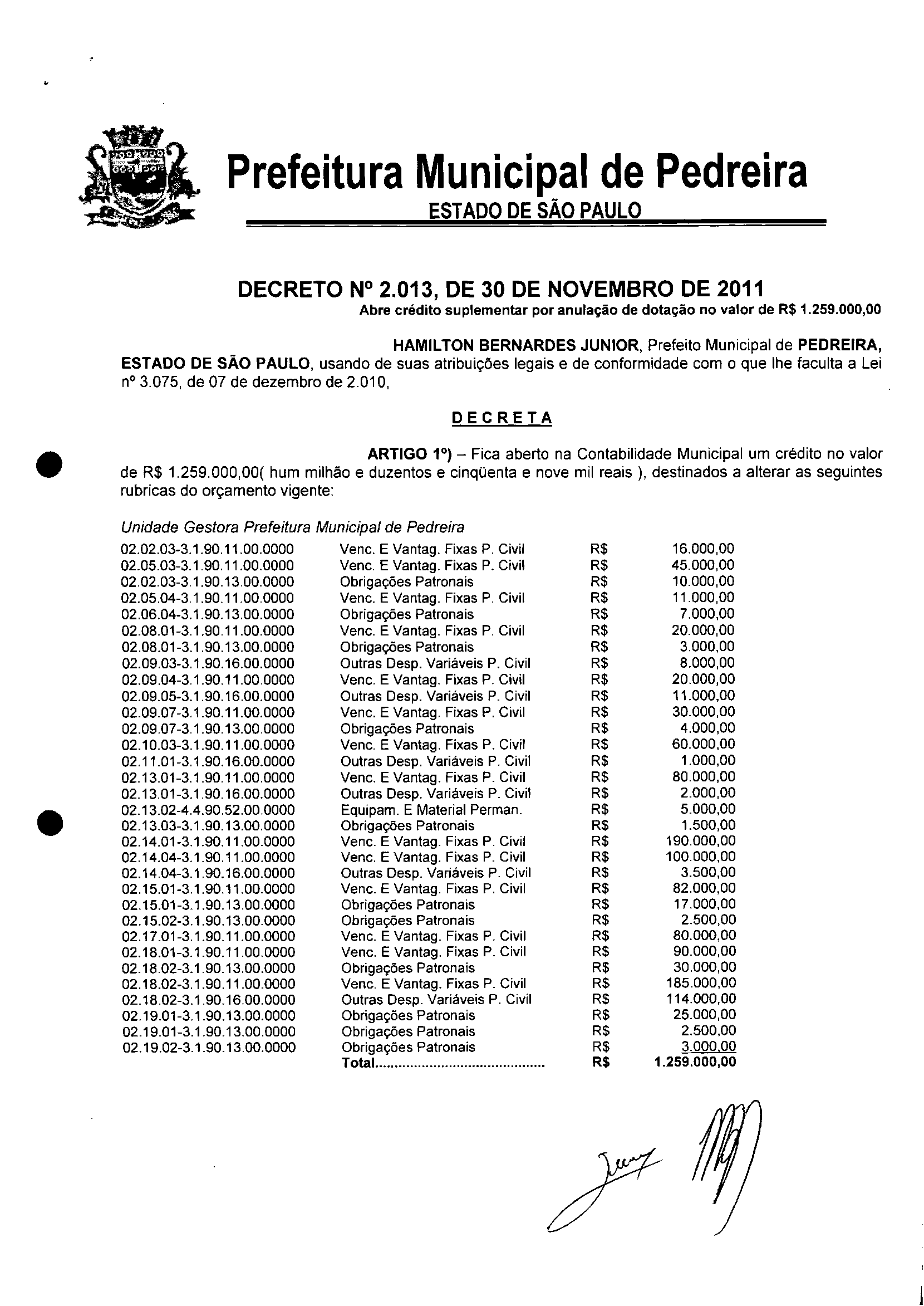 Ementa: Abre crédito suplementar por anulação de dotação no valor de R$ 1.259.000,00