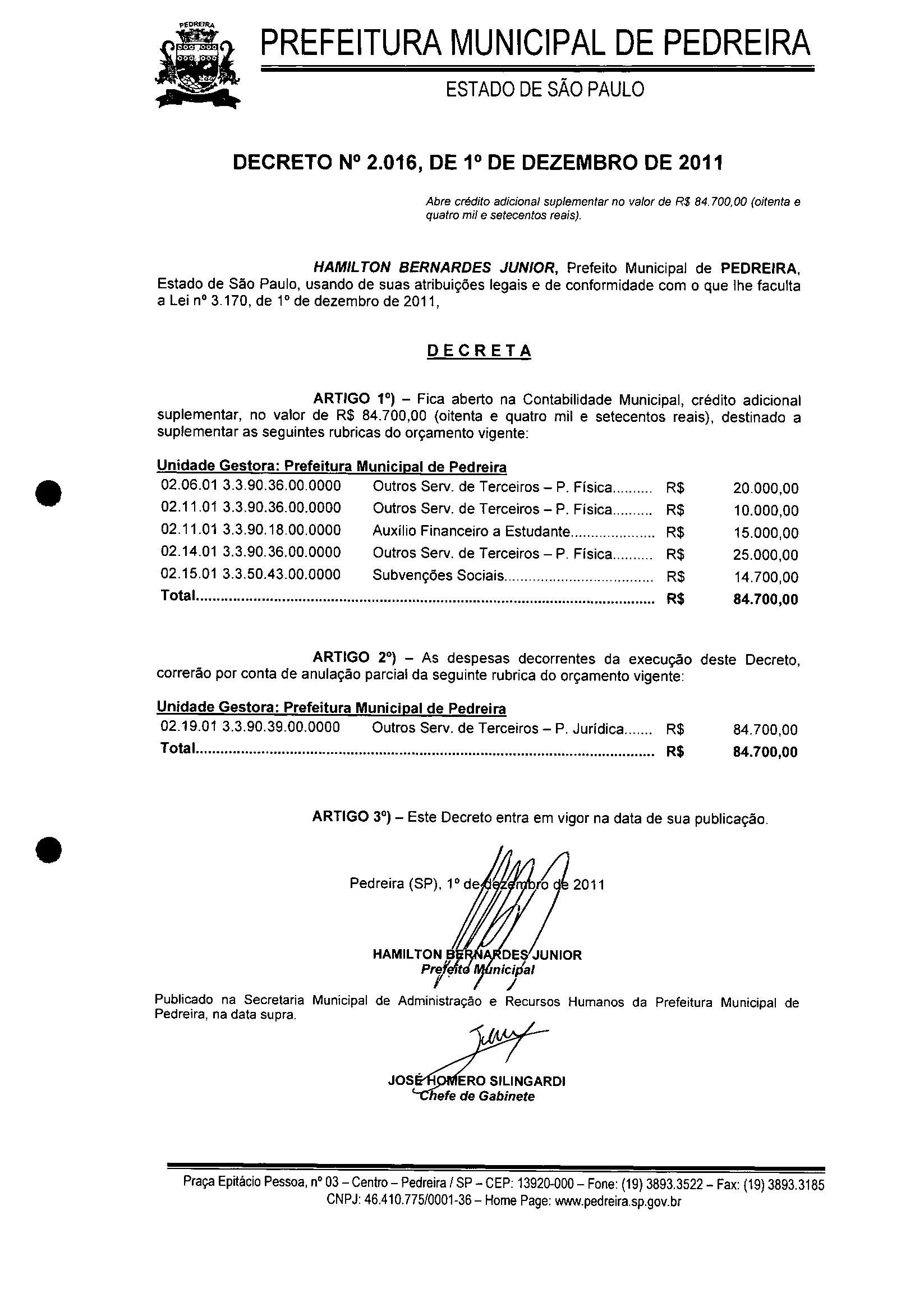 Decreto - N° 2016 de 01/12/2011