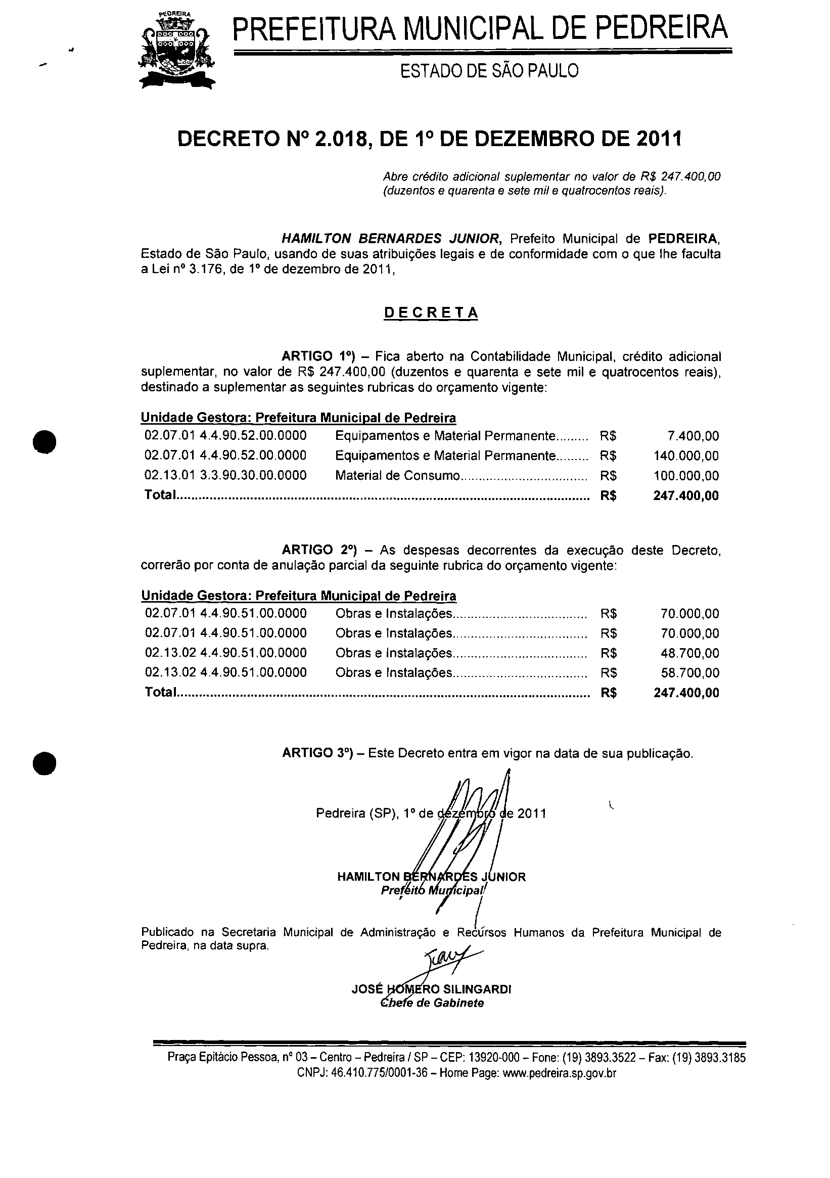 Ementa: Abre crédito adicional suplementar no valor de R$ 247.400,00 (duzentos e quarenta e sete mil e quatrocentos reais).