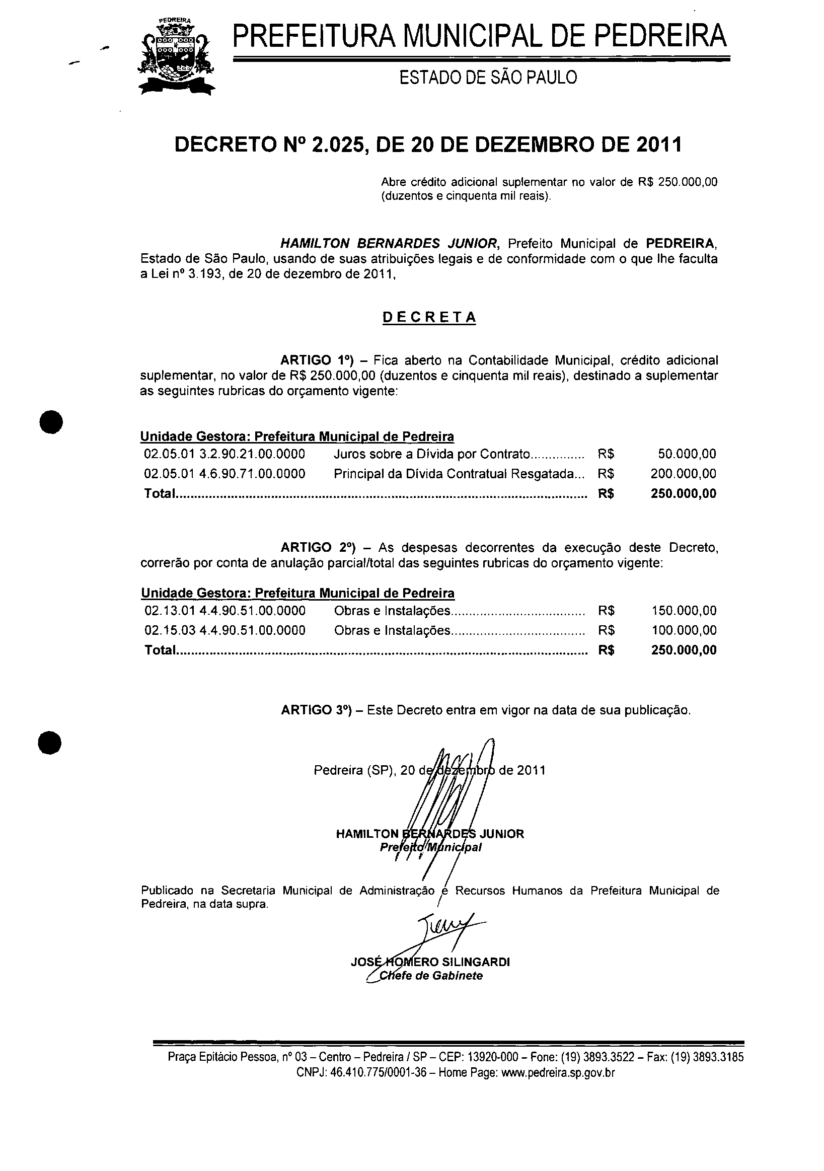 Ementa: Abre crédito adicional suplementar no valor de R$ 250.000,00 (duzentos e cinquenta mil reais),