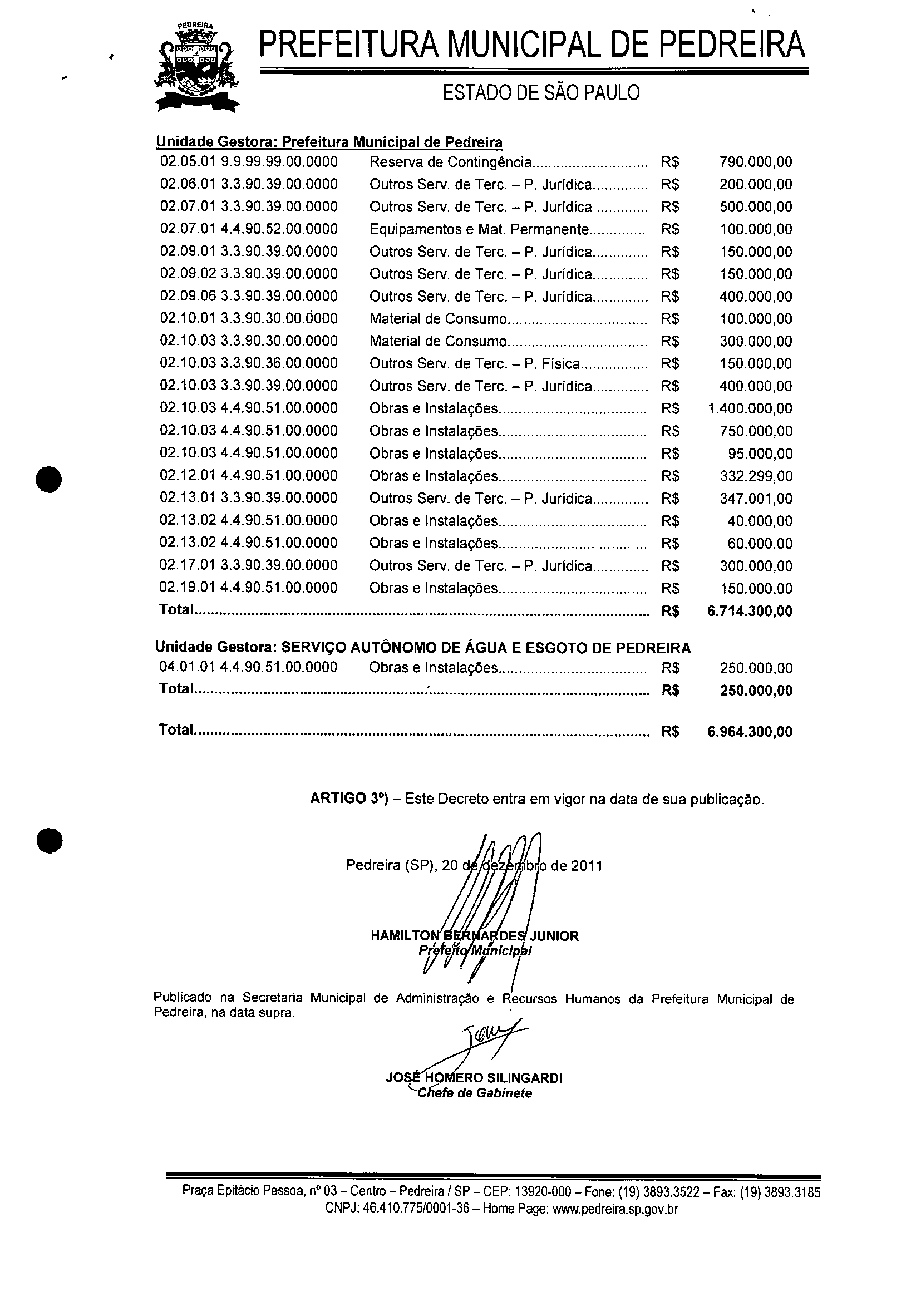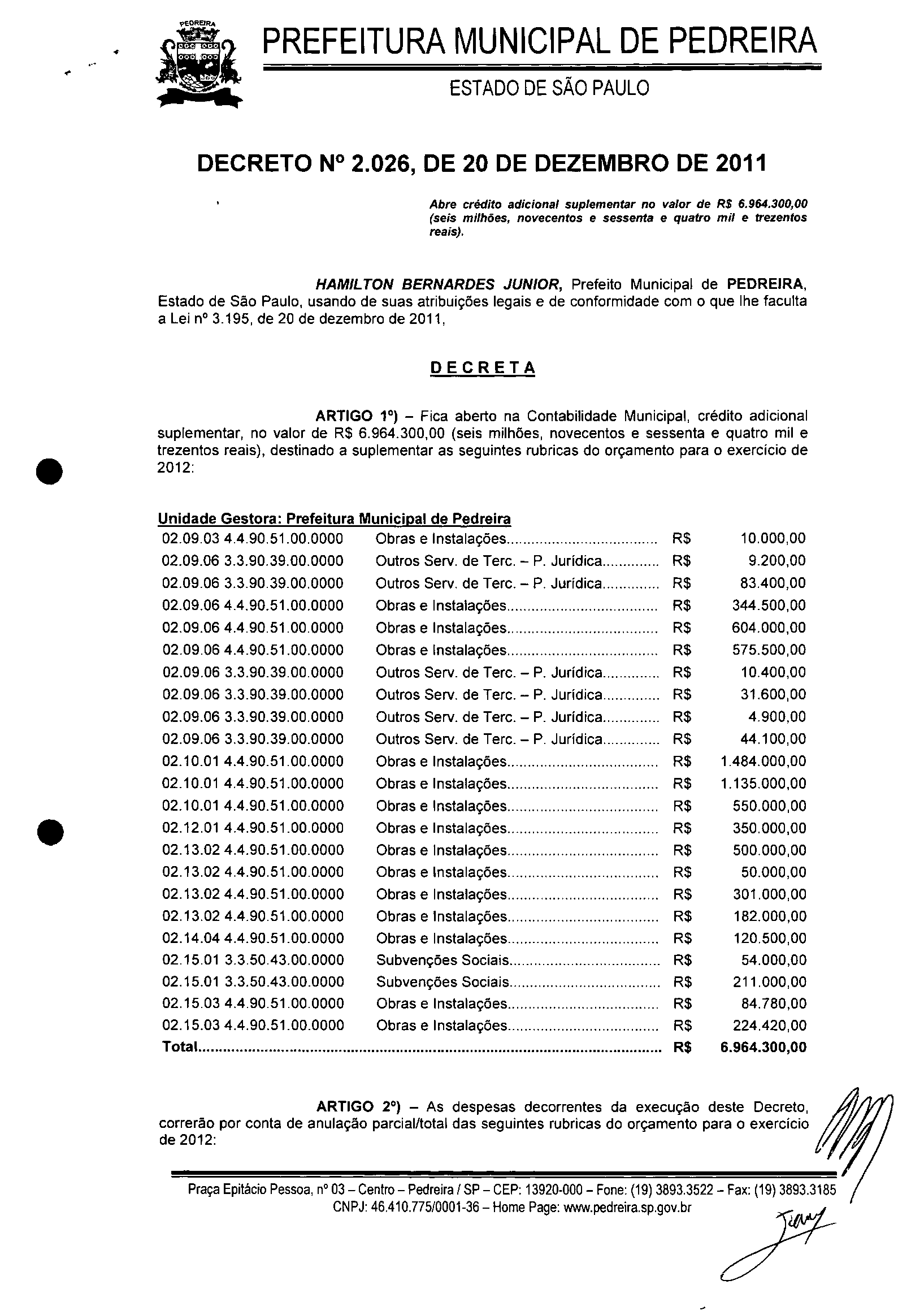 Ementa: Abre crédito adicional suplementar no valor de R$ 6.964,00 (seis milhões, novecentos e sessenta e quatro mil e trezentos reais),