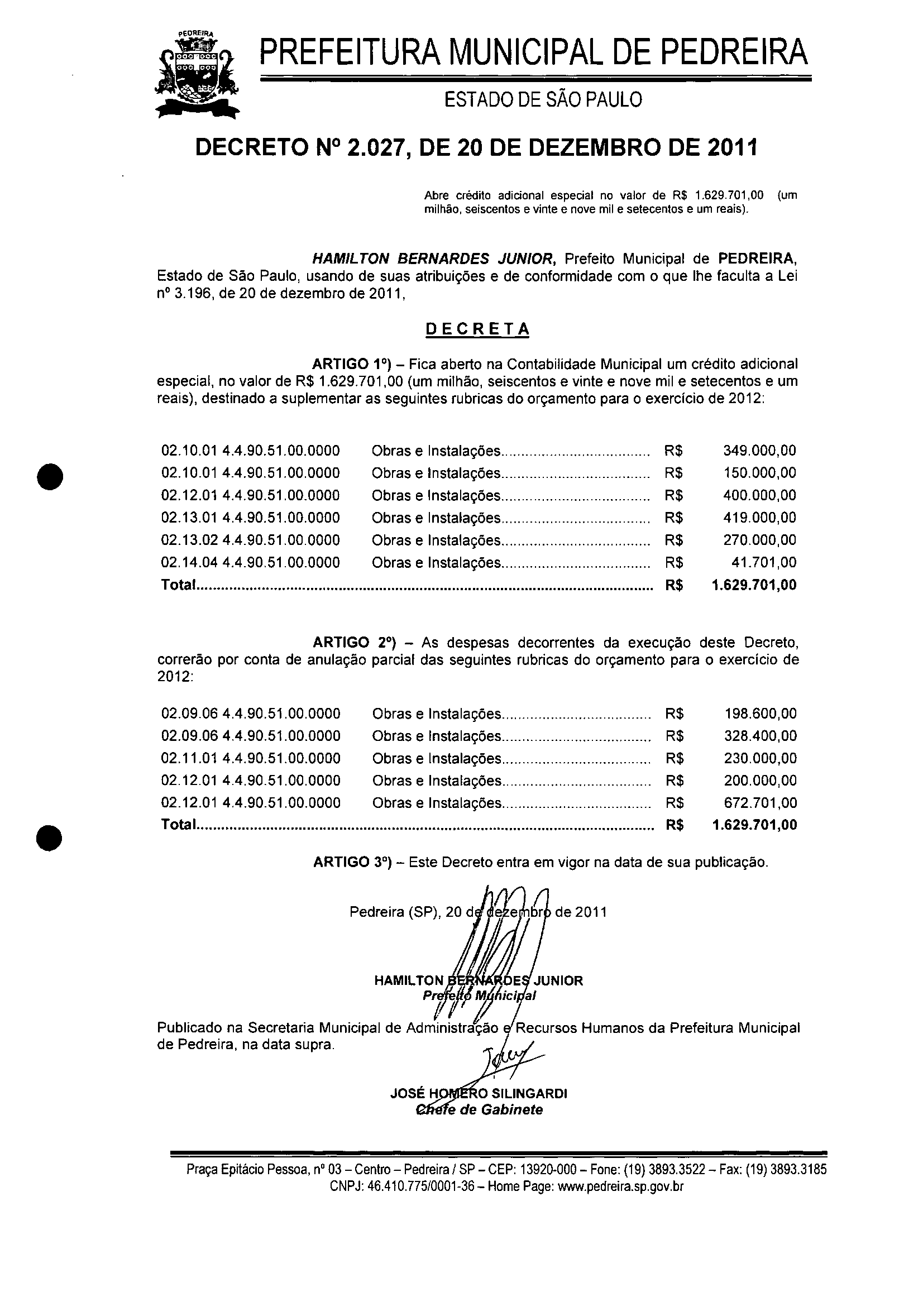 Ementa: Abre crédito adicional especial no valor de R$ 1.629.701,00 (um milhão, seiscentos e vinte e nove mil e setecentos e um reais).