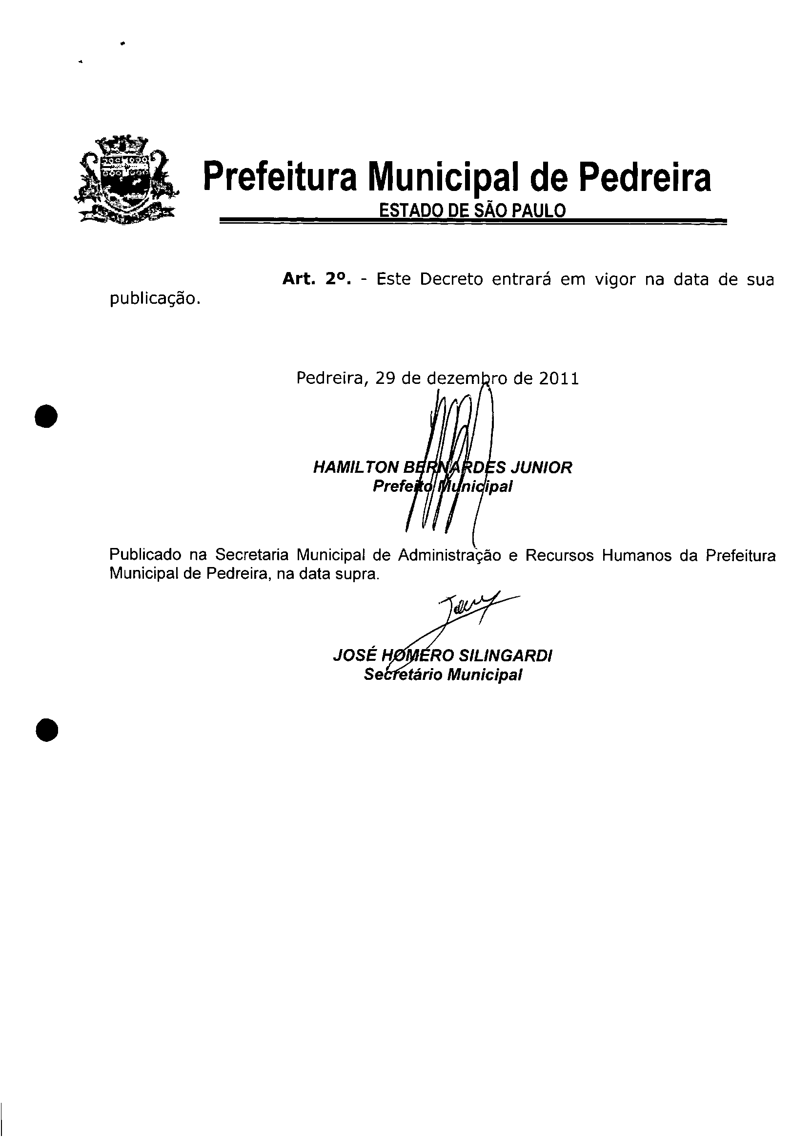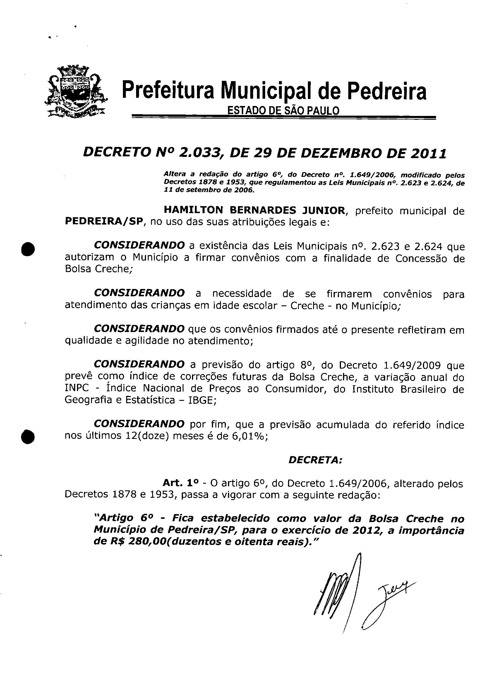 Ementa: Altera a redação do artigo 6°, do Decreto nº. 1.649/2006, modificado pelos Decretos 1878 e 1953, que regulamentou as Leis Municipais nº. 2.623 e 2.624, de 11 de setembro de 2006.