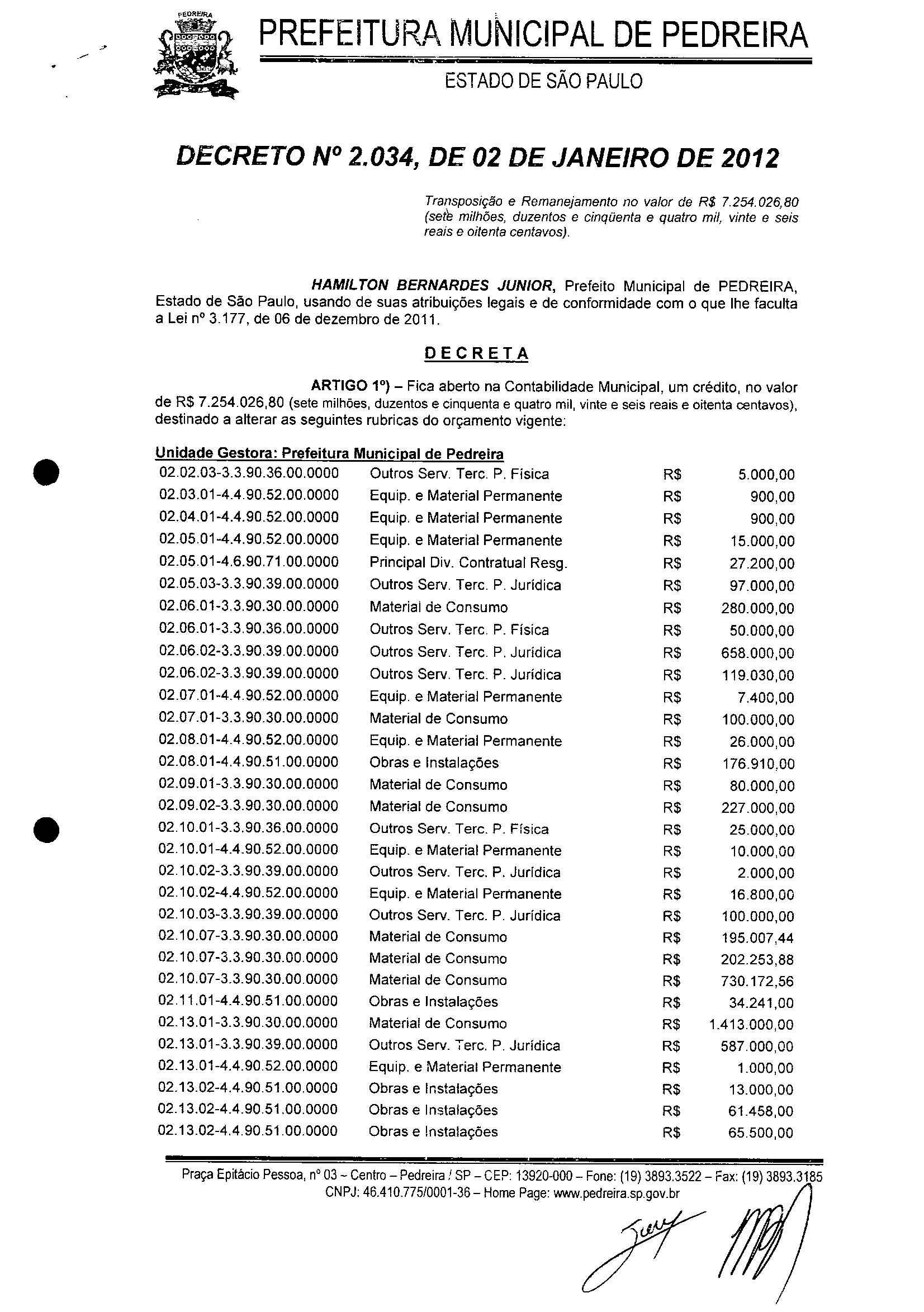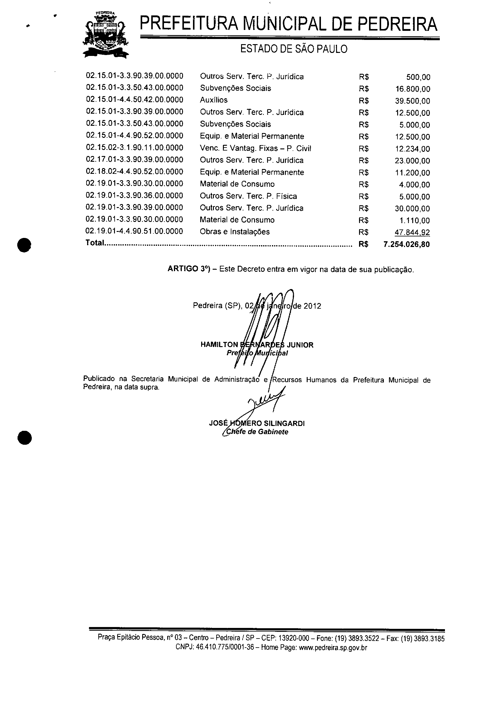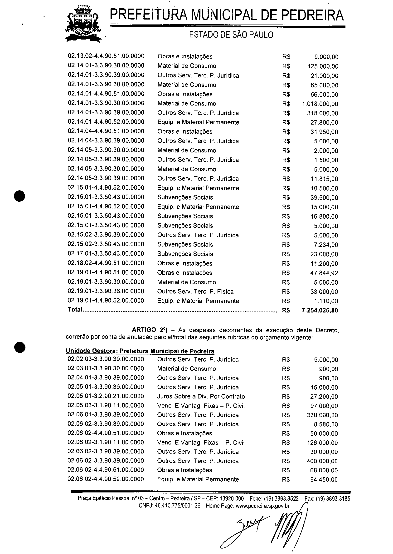Ementa: Transposição e Remanejamento no valor de R$ 7.254.026,80 (sete milhões, duzentos e cinqüenta e quatro mil, vinte e seis reais e oitenta centavos).