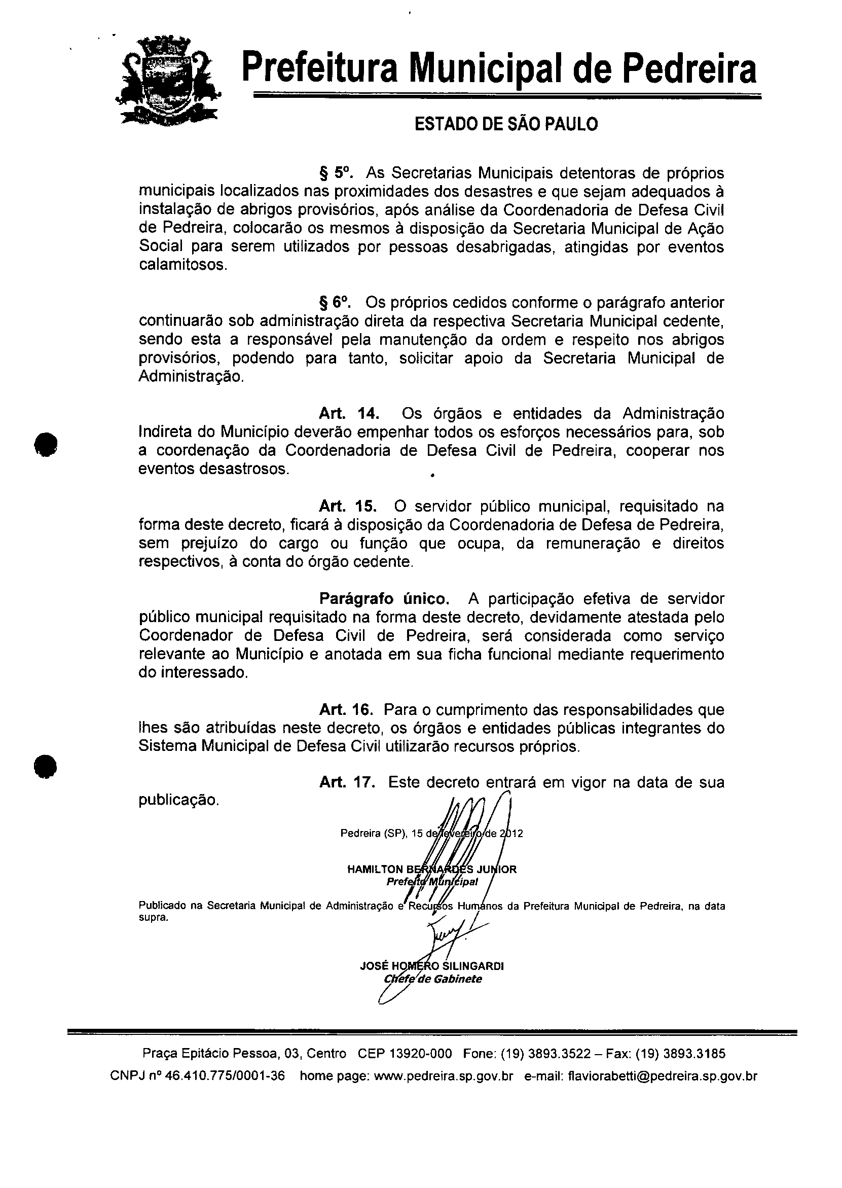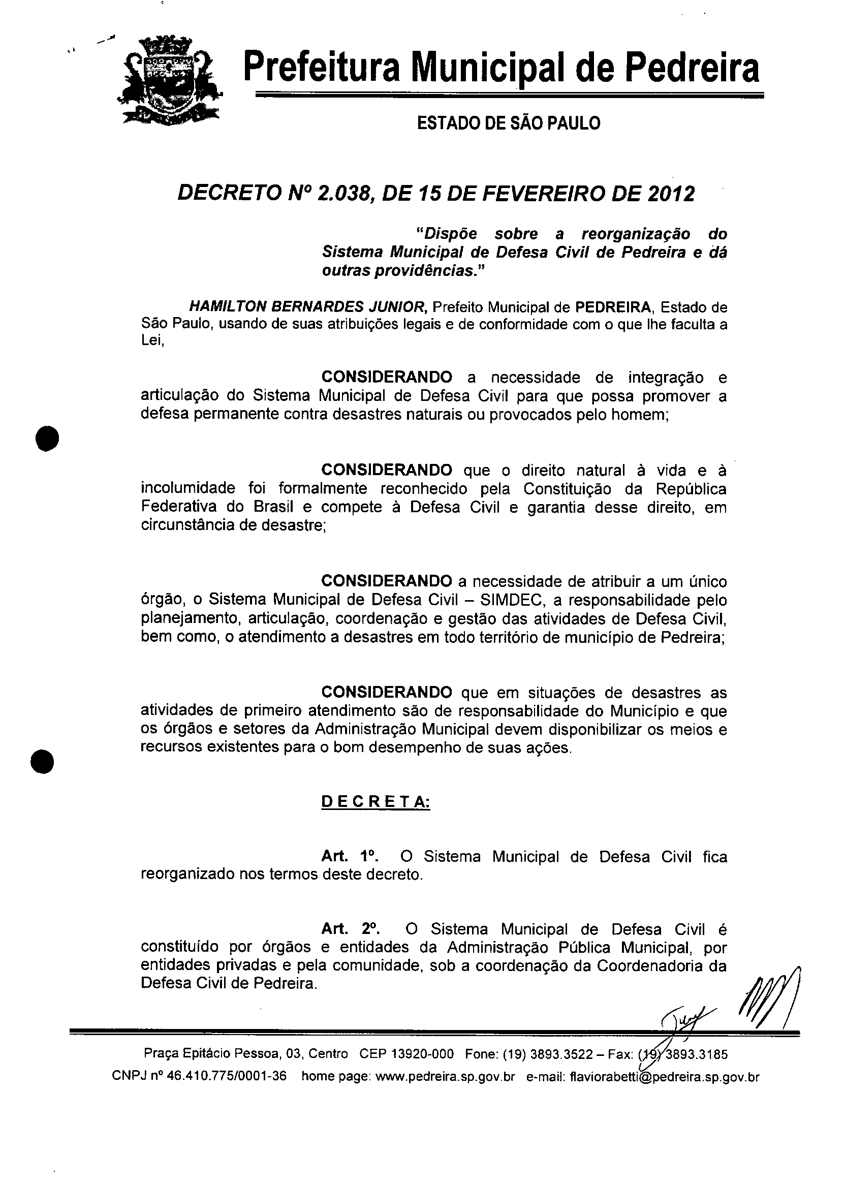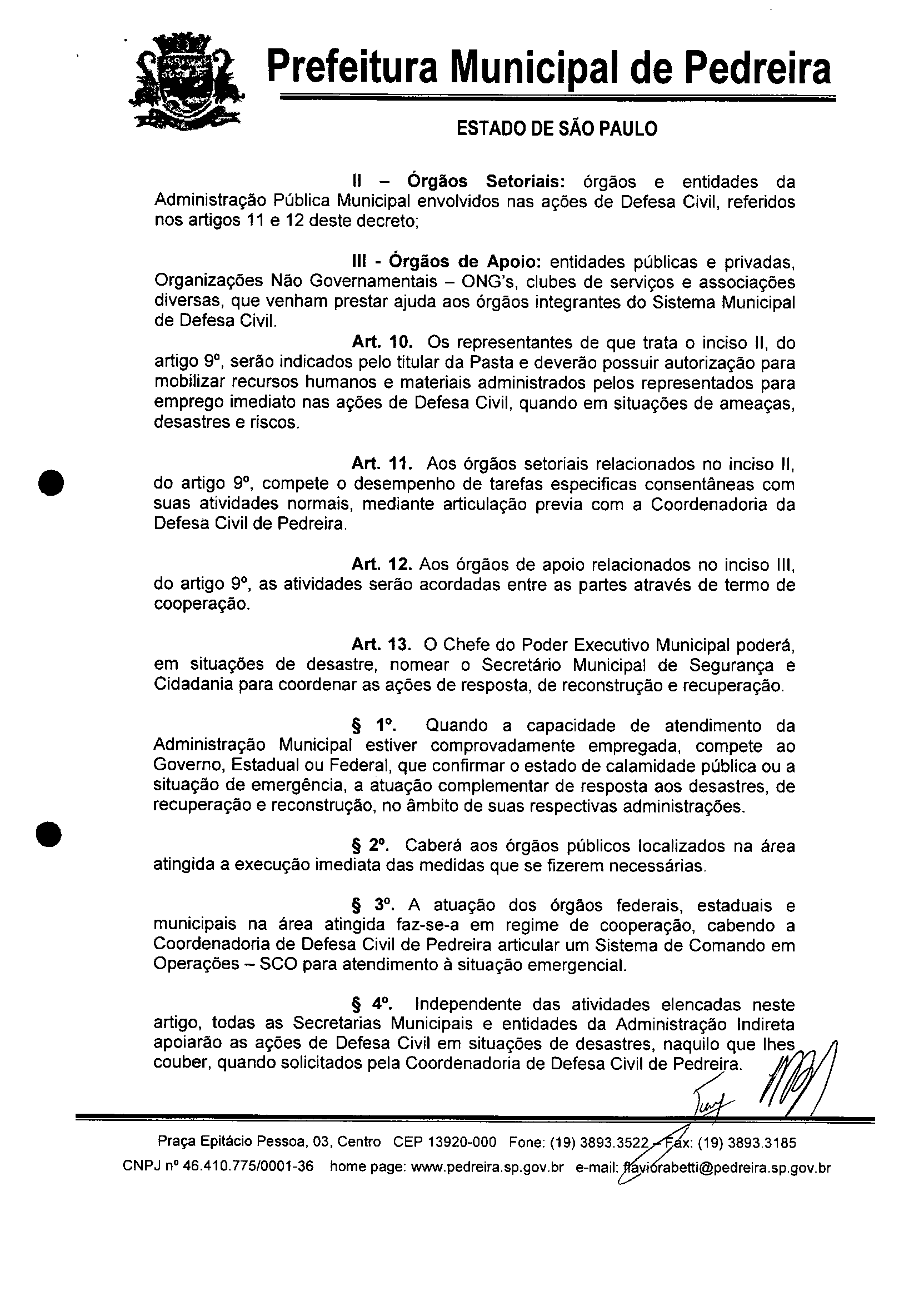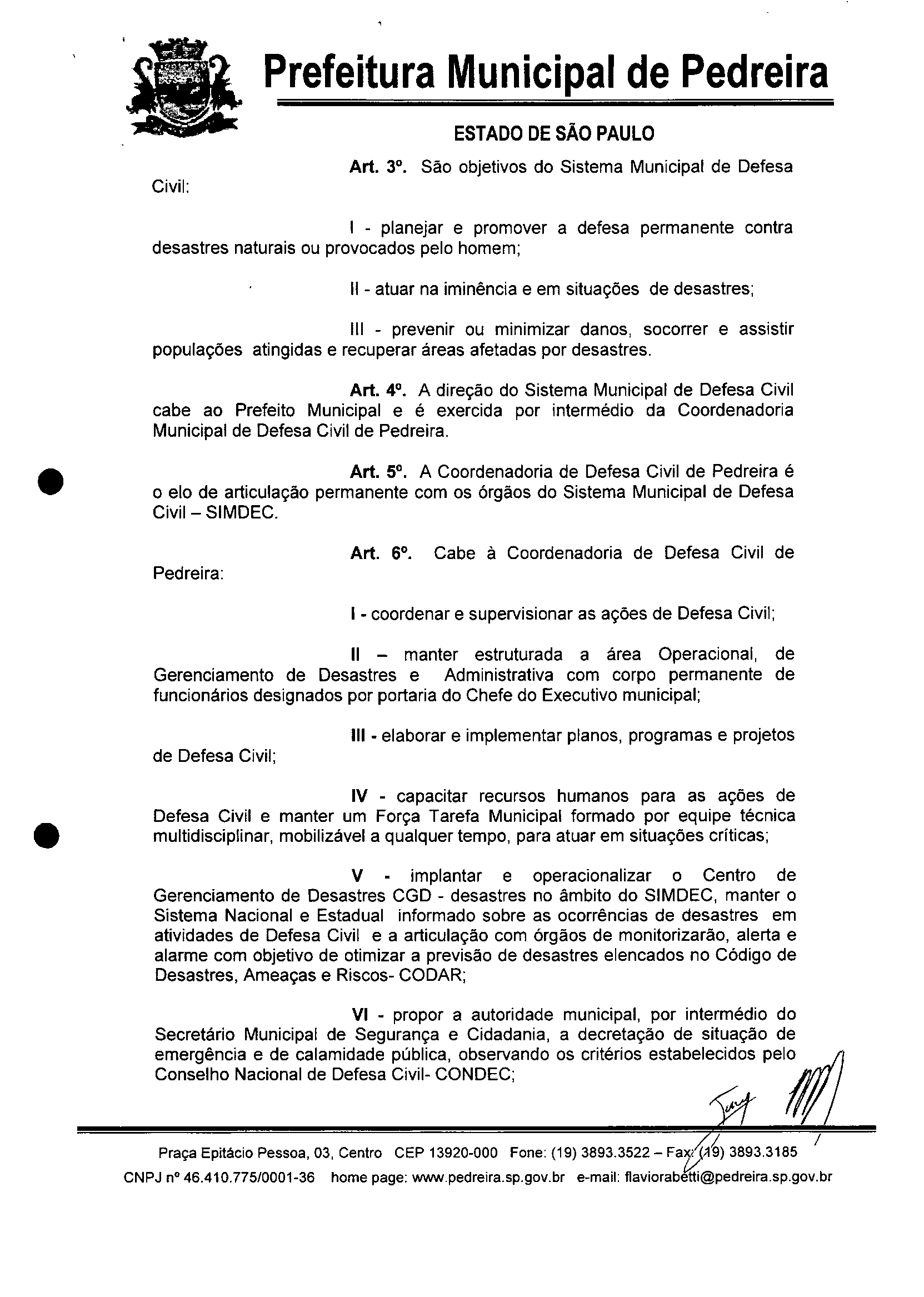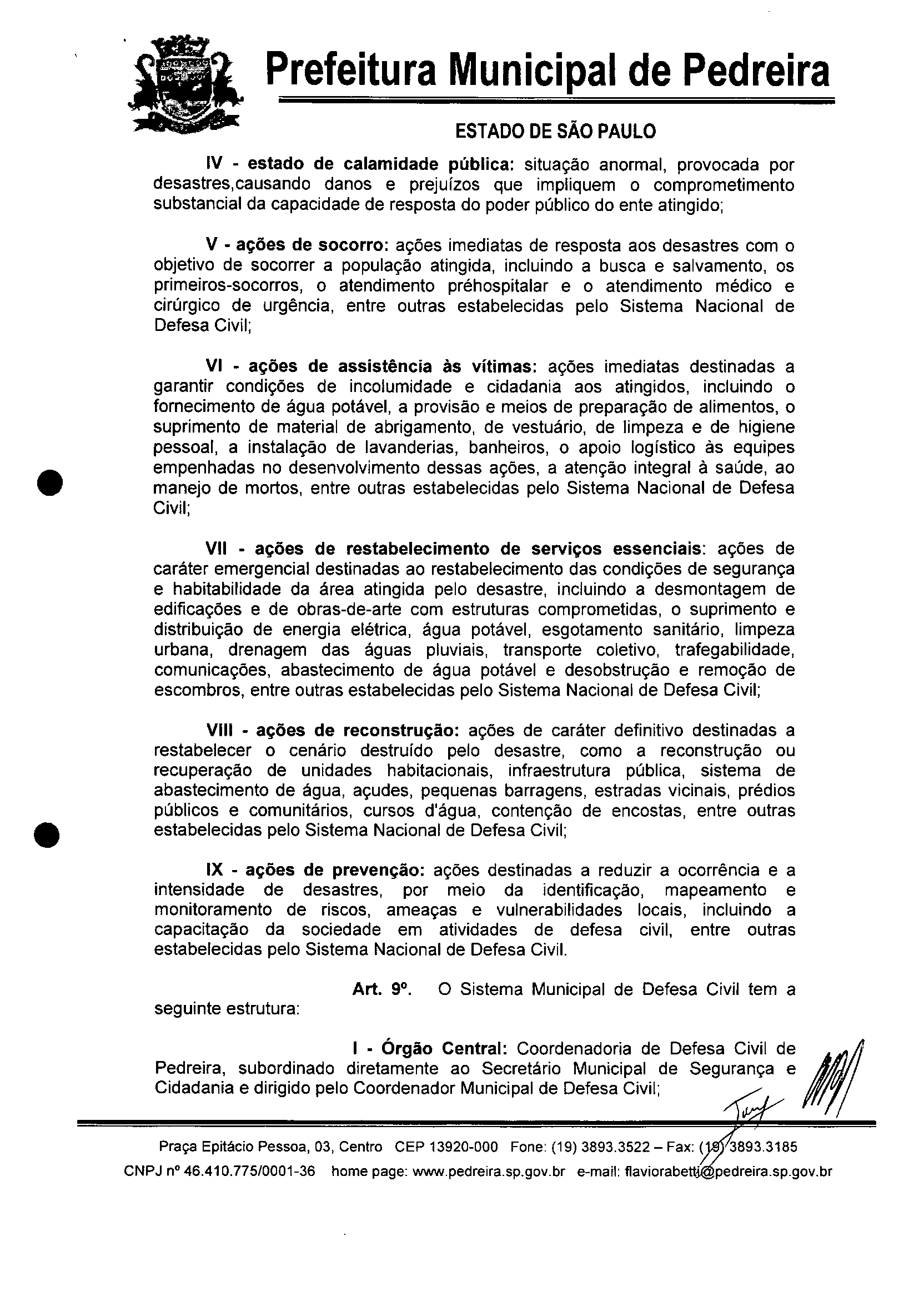 Ementa: "Dispõe sobre a reorganização do Sistema Municipal de Defesa Civil de Pedreira e dá outras providências."