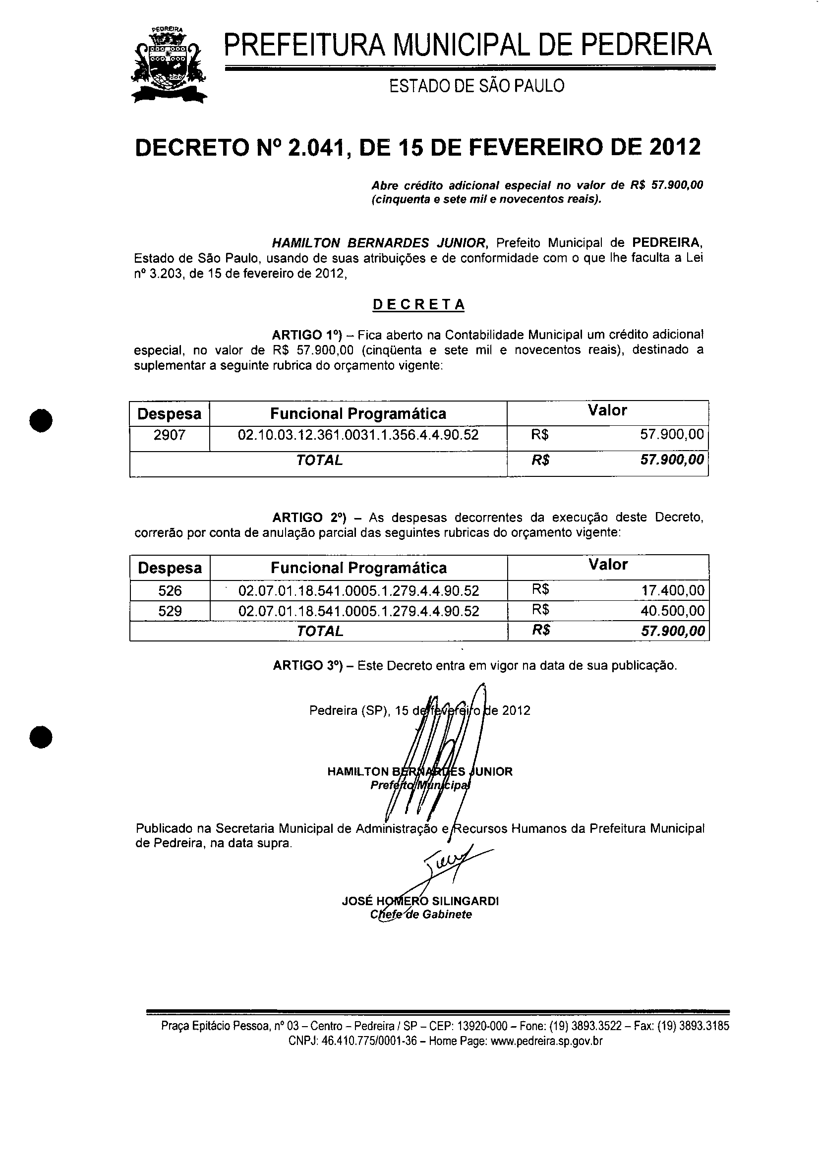 Ementa: Abre crédito adicional especial no valor de R$ 57.900,00 (cinquenta e sete mil e novecentos reais).