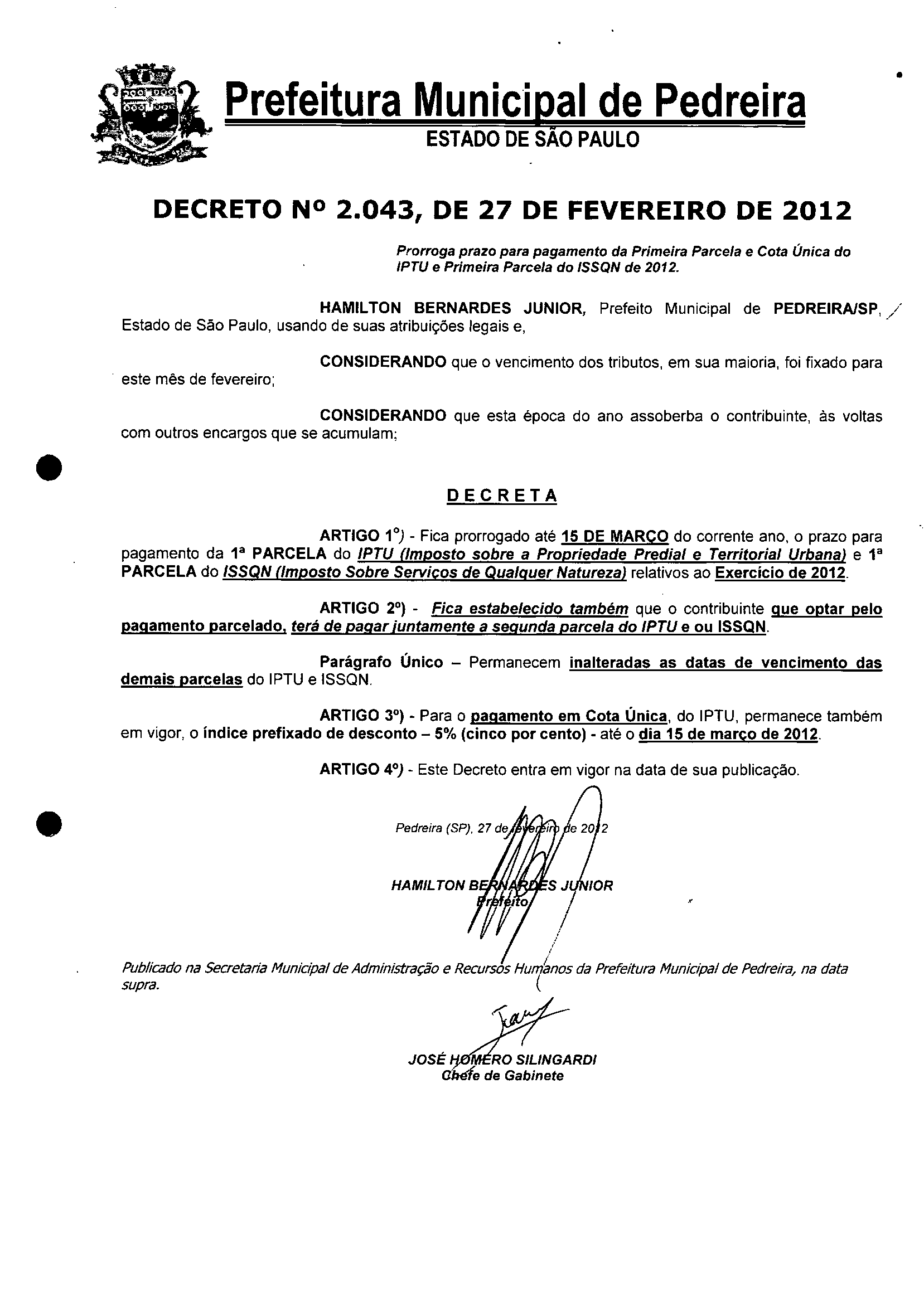 Ementa: Prorroga prazo para pagamento da Primeira Parcela e Cota Única do IPTU e Primeira Parcela do ISSQN de 2012.