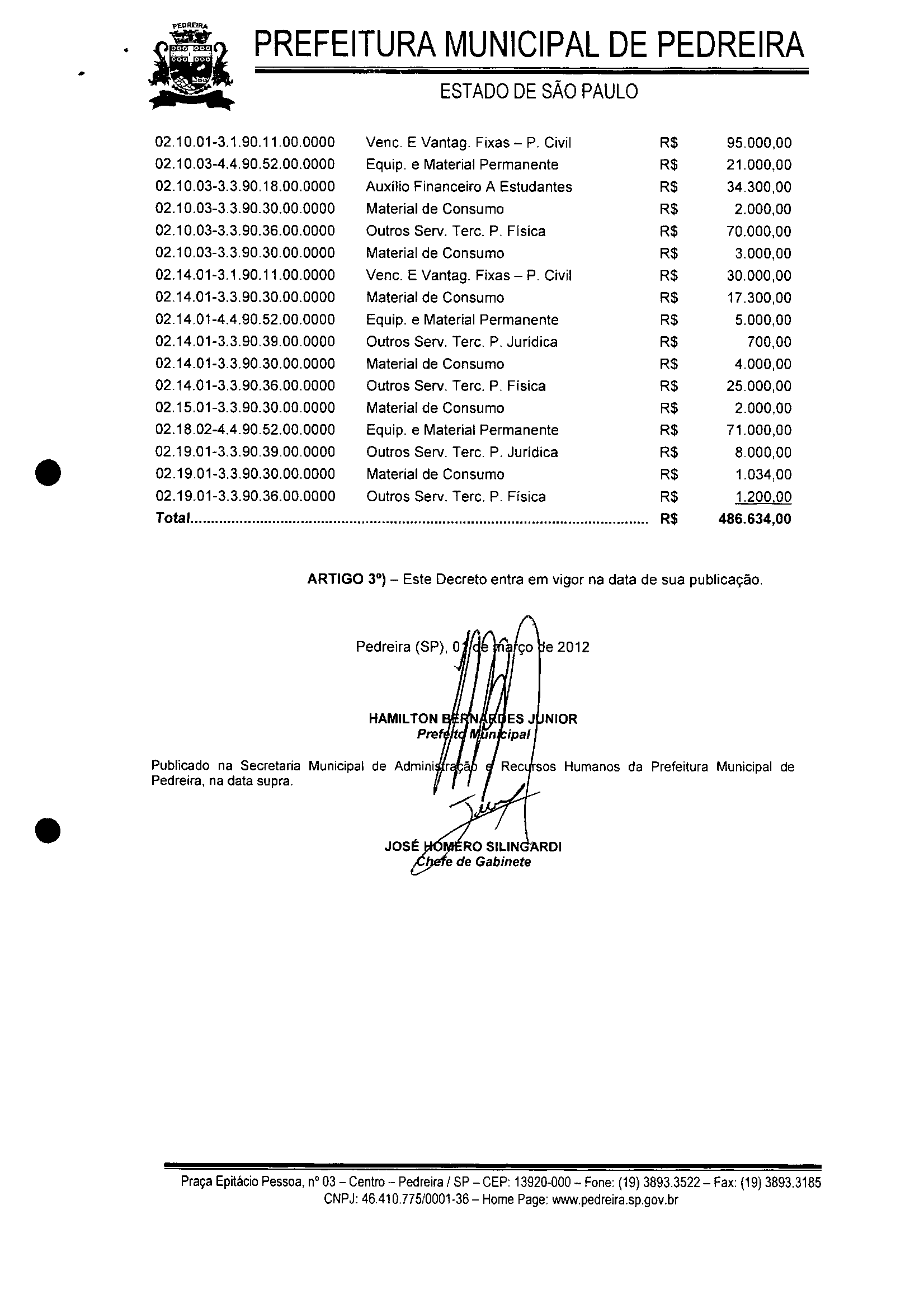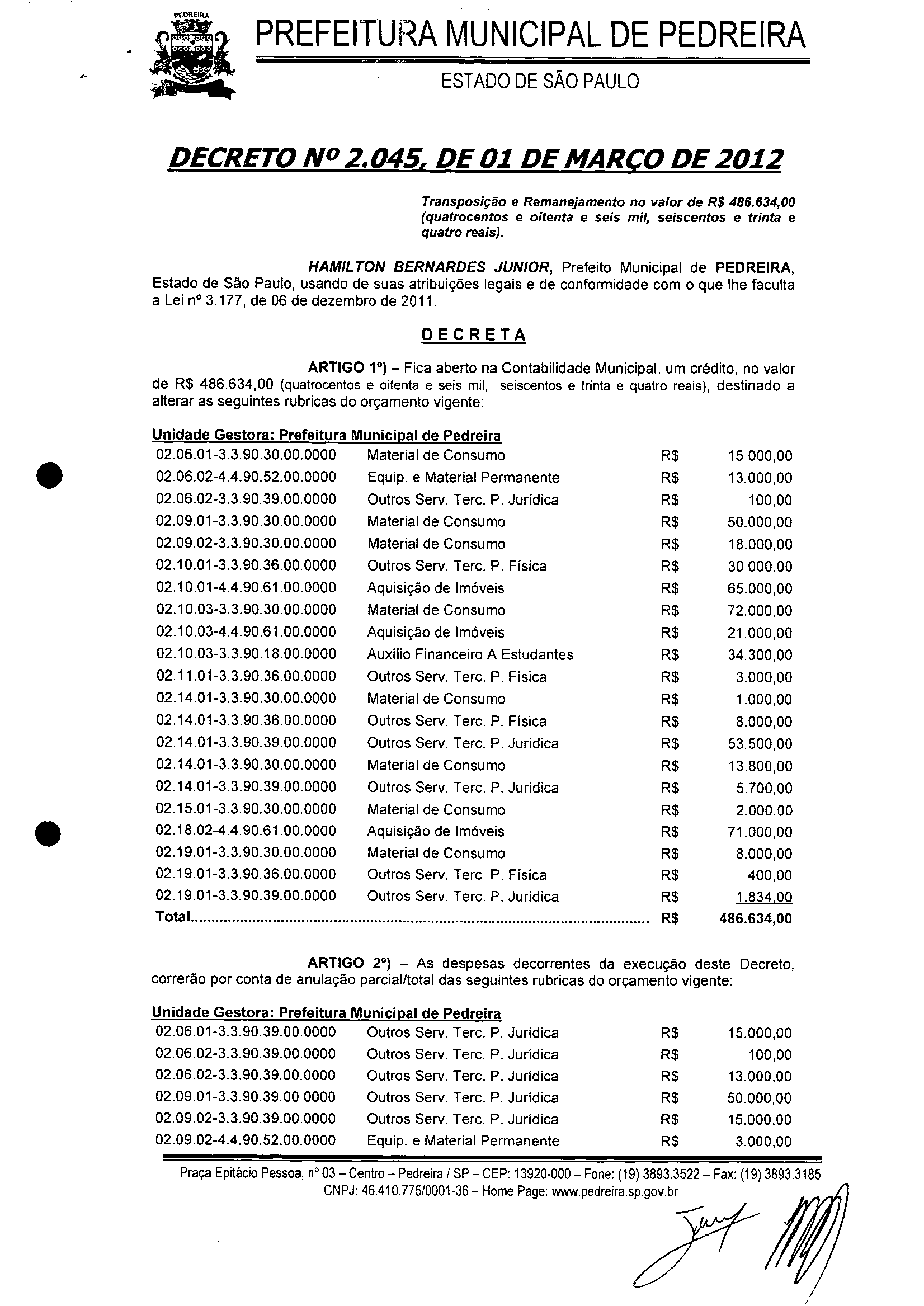 Ementa: Transposição e Remanejamento no valor de R$ 486.634.00 (quatrocentos e oitenta e seis mil, seiscentos e trinta e quatro reais).