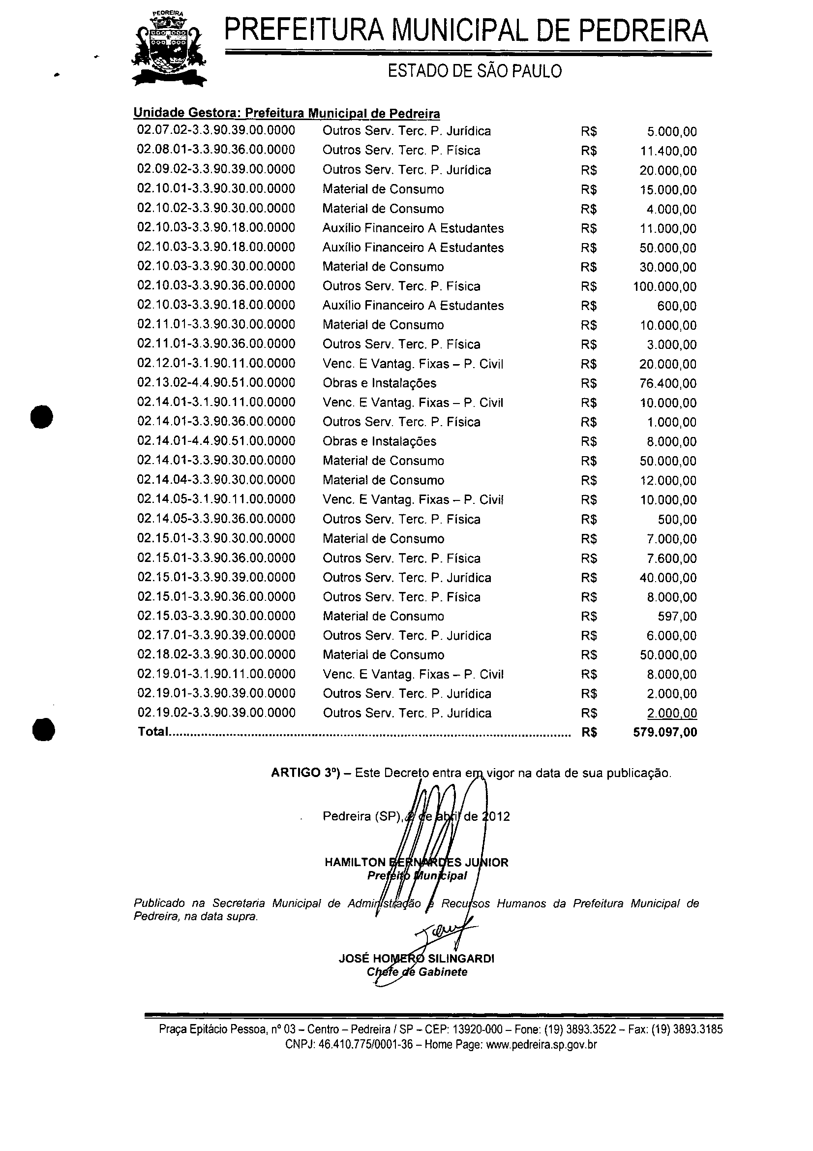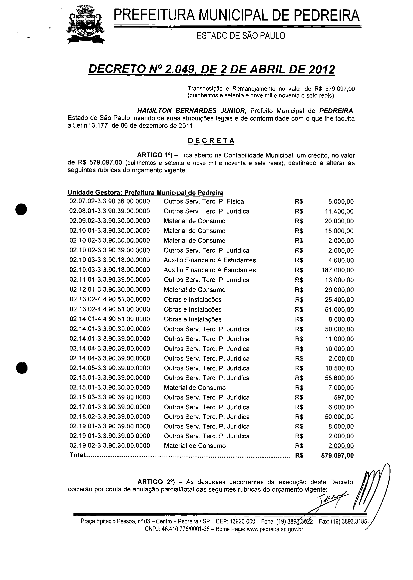 Ementa: Transposição e Remanejamento no valor de R$ 579.097,00 (quinhentos e setenta e nove mil e noventa e sete reais).