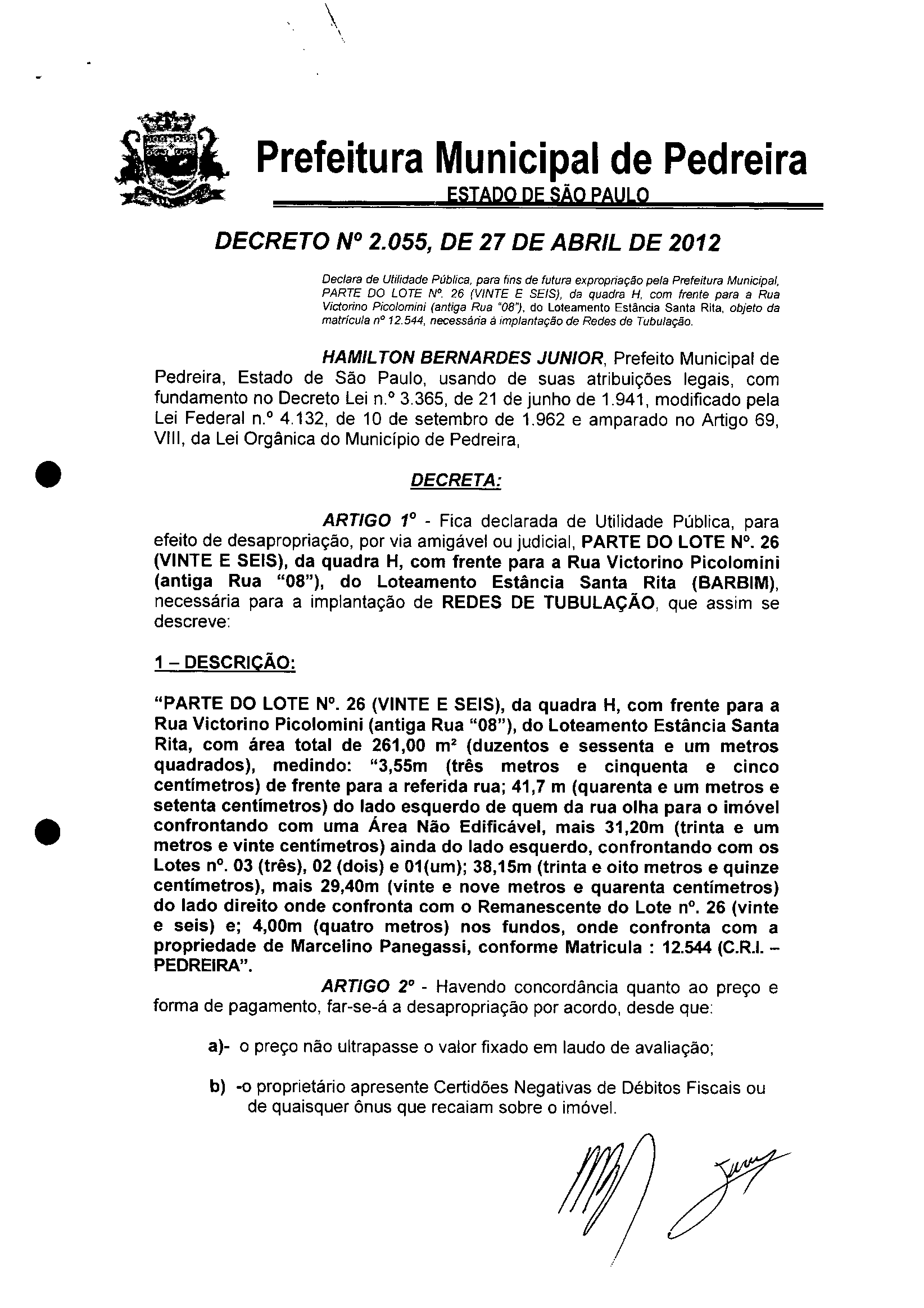Ementa: Declara de Utilidade Pública, para fins de futura expropriação pela Prefeitura Municipal, PARTE DO LOTE N°, 26 (VINTE E SEIS), da quadra H, com frente para a Rua Victorino Picolomini (antiga Rua "08"), do Loteamento Estância Santa Rita, objeto da matrícula nº 12.544, necessária a implantação de Redes de Tubulação.