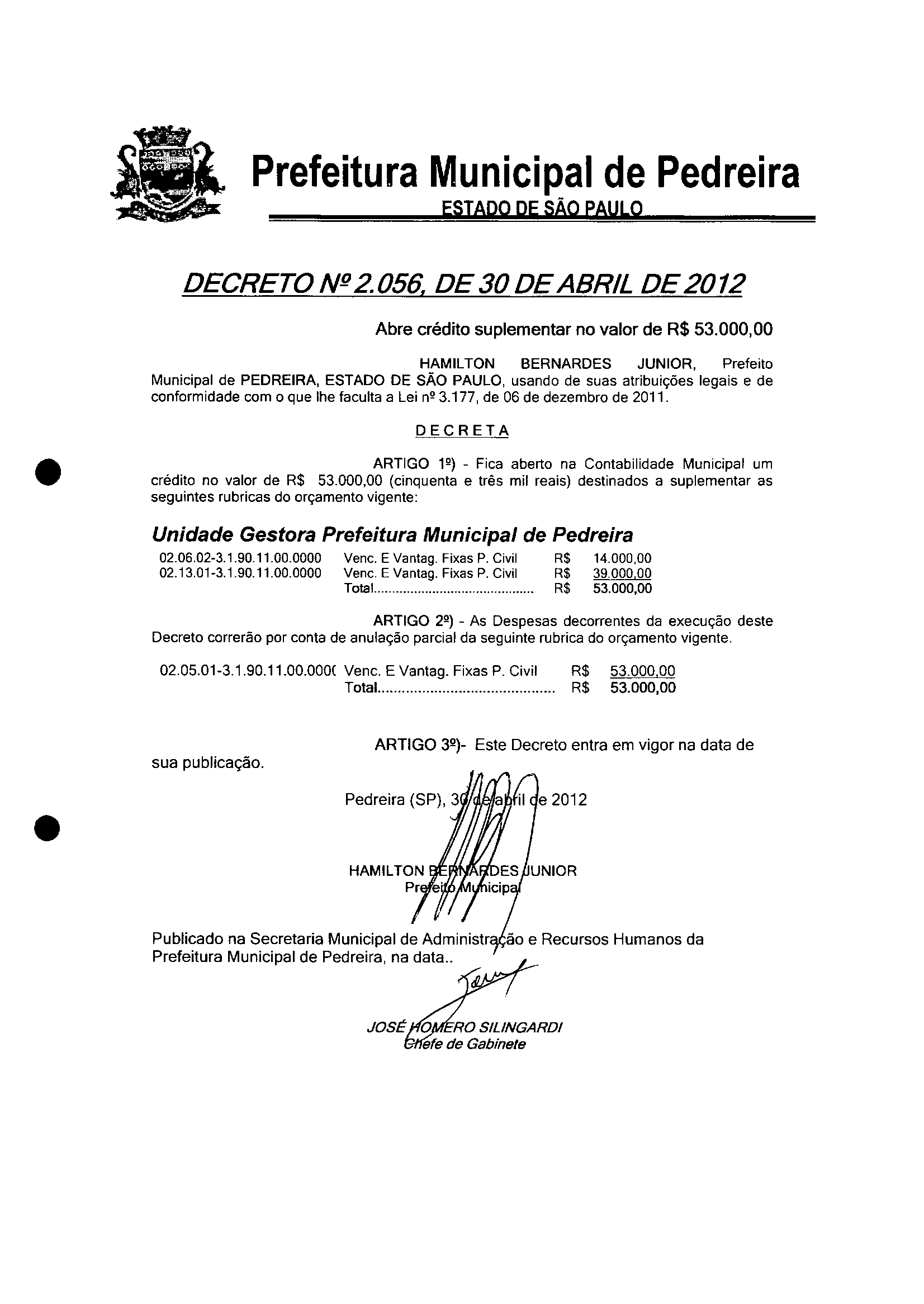Ementa: Abre crédito suplementar no valor de R$ 53.000,00