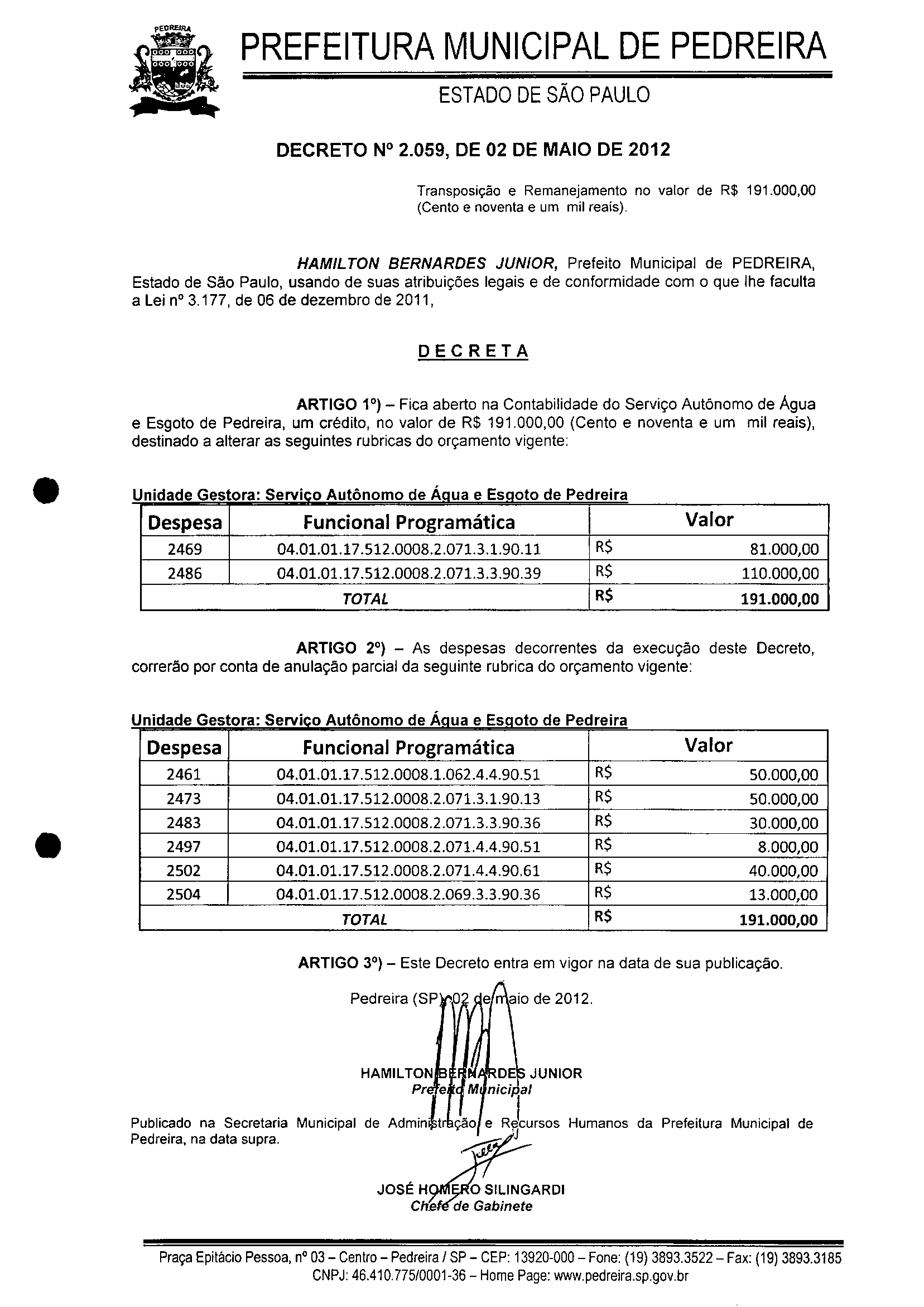 Ementa: Transposição e Remanejamento no valor de R$ 191.000,00 (Cento e noventa e um mil reais).