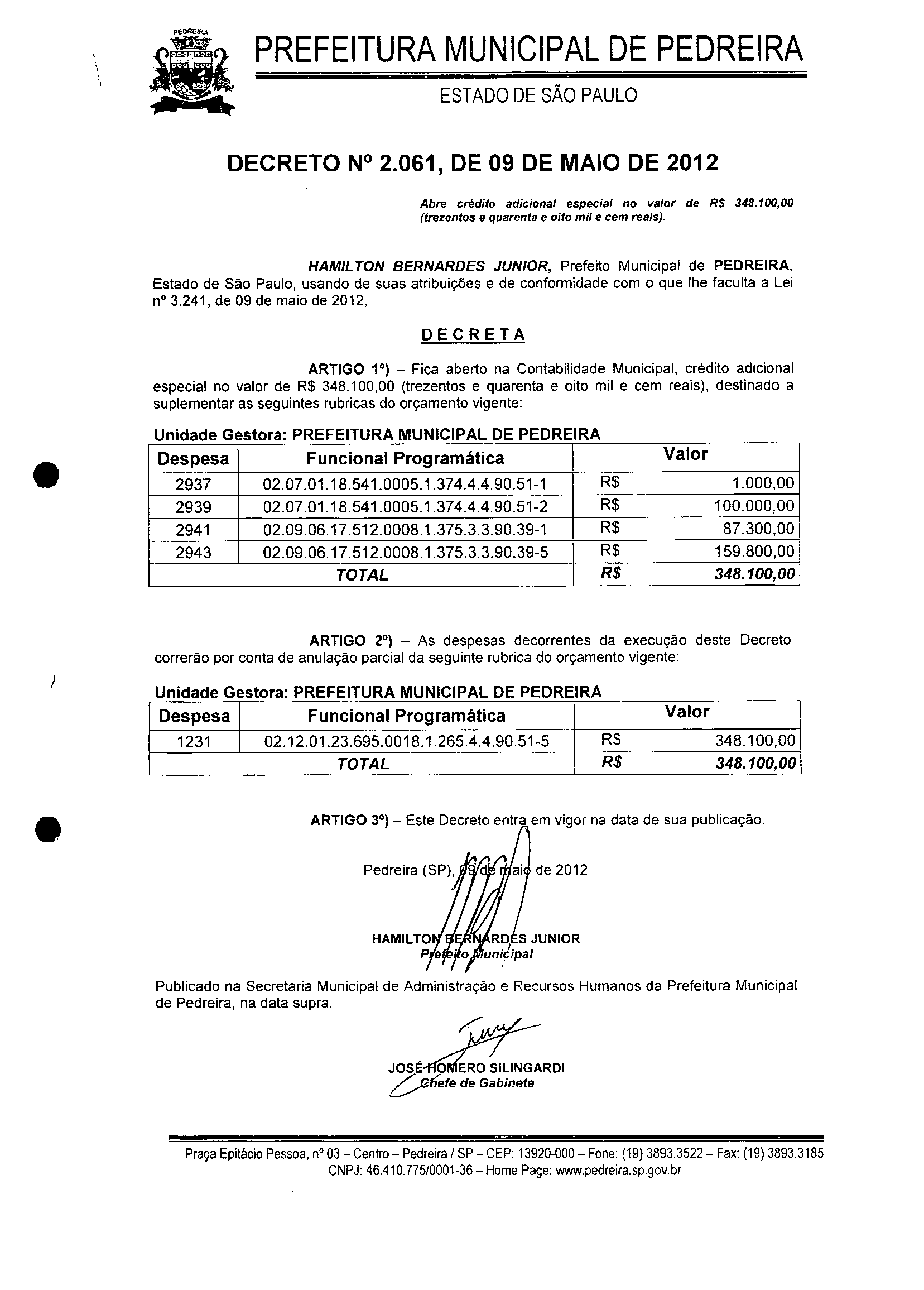 Ementa: Abre crédito adicional especial no valor de R$ 348.100,00 (trezentos e quarenta e oito mil e cem reais).