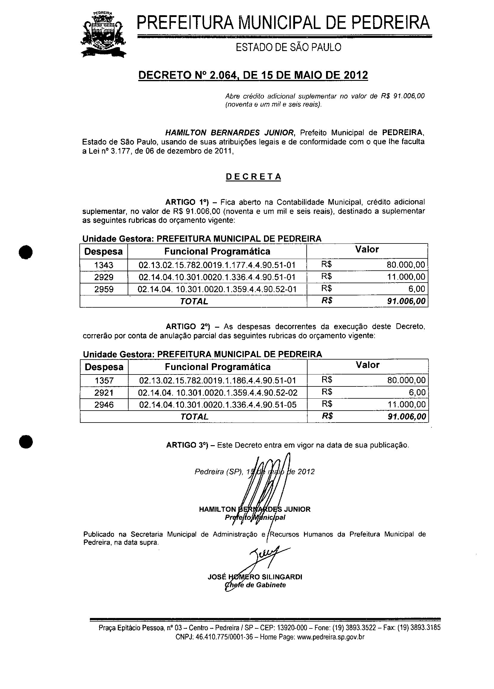 Ementa: Abre crédito adicional suplementar no valor de R$ 91.006,00 (noventa e um mil e seis reais).