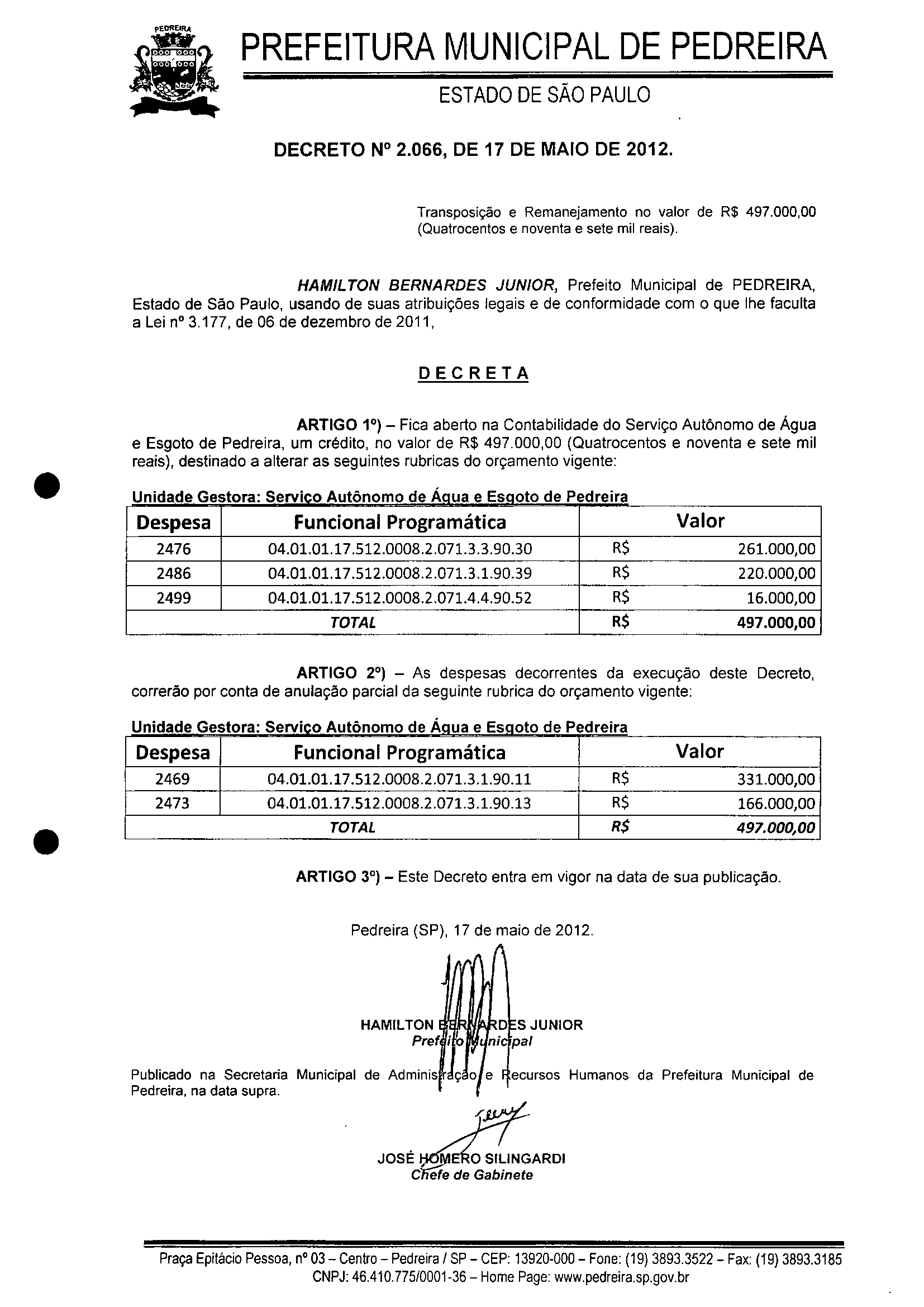 Ementa: Transposição e Remanejamento no valor de R$ 497.000,00 (Quatrocentos e noventa e sete mil reais).