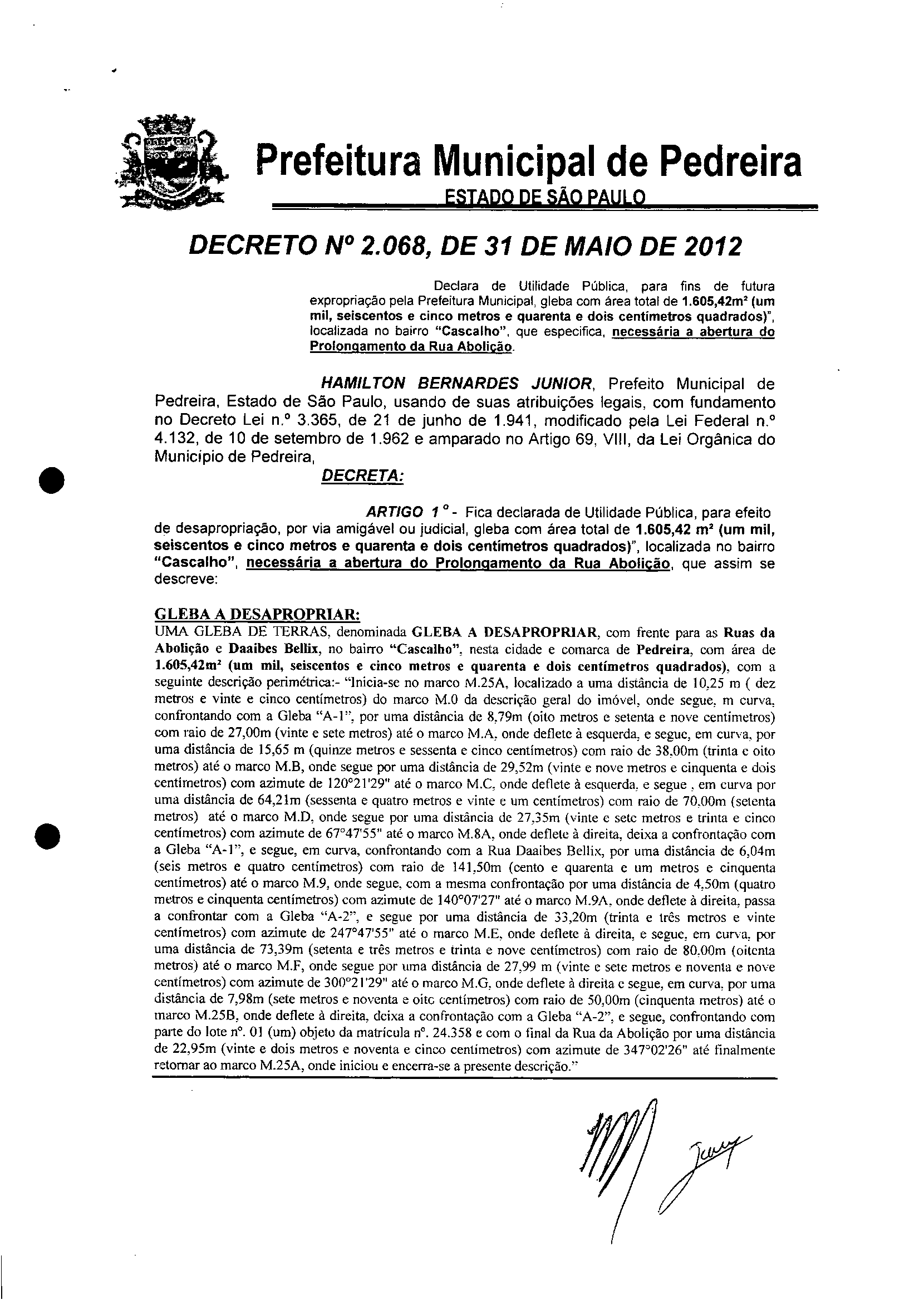 Ementa: Declara de Utilidade Pública, para fins de futura expropriação pela Prefeitura Municipal, gleba com área total de 1.605,42m2 (um mil, seiscentos e cinco metros e quarenta e dois centímetros quadrados)", localizada no bairro "Cascalho", que especifica, necessária a abertura do Prolongamento da Rua Abolição.