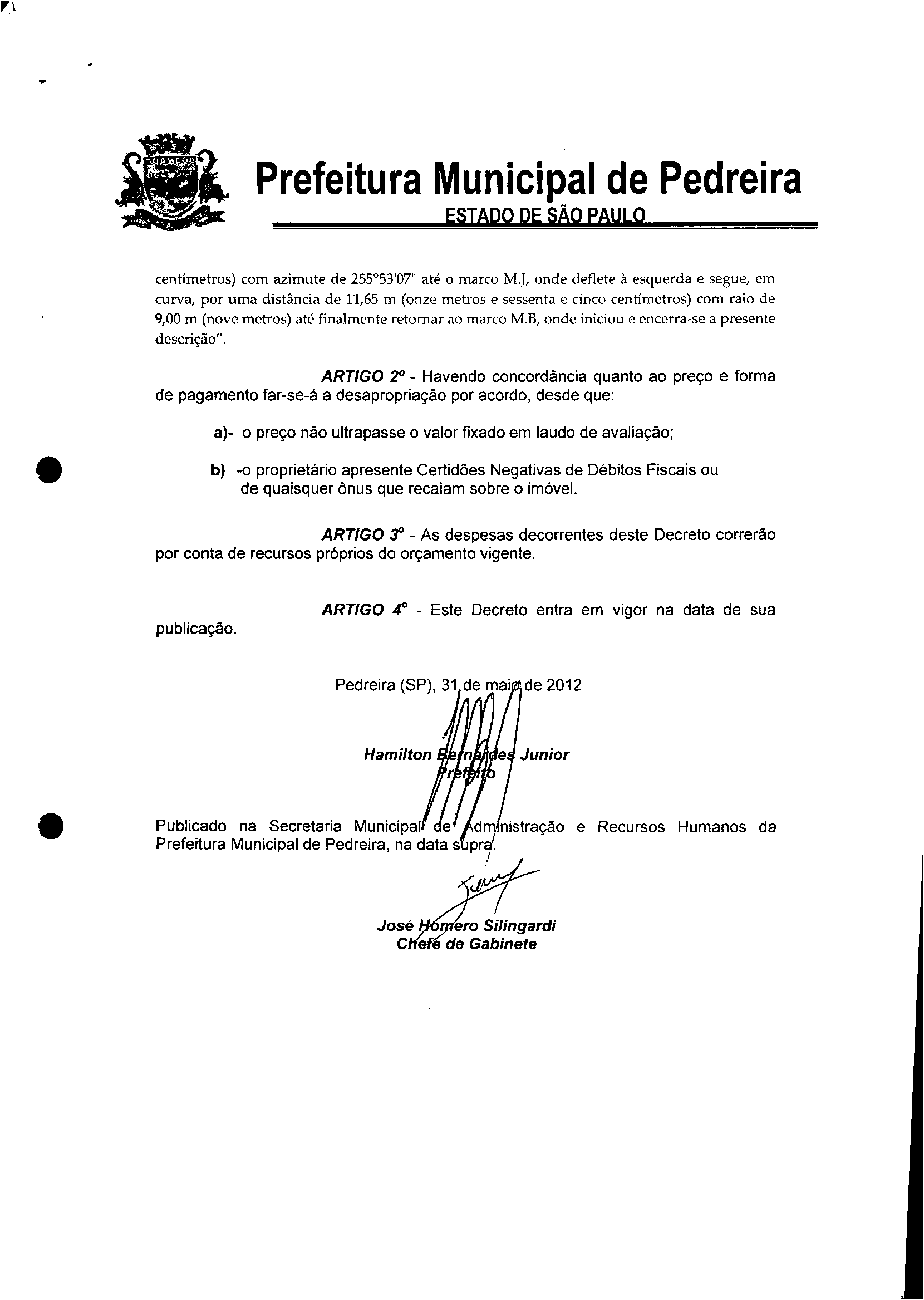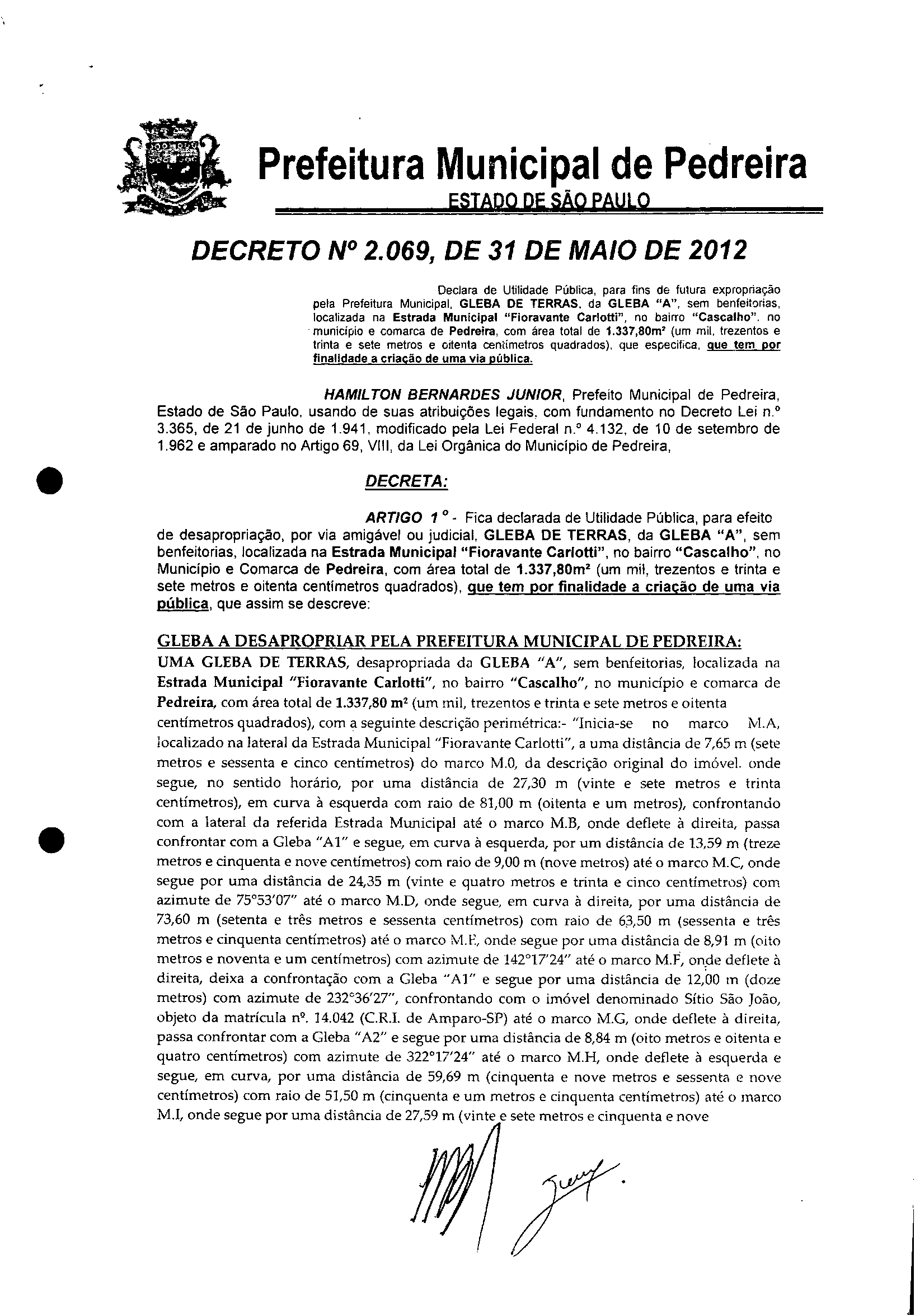 Ementa: Declara de Utilidade Pública, para fins de futura expropriação pela Prefeitura Municipal. GLEBA DE TERRAS da GLEBA "A", sem benfeitorias, localizada na Estrada Municipal "Fioravante Carlotti", no bairro "Cascalho", no município e comarca de Pedreira, com área total de 1.337,80m² (um mil. trezentos e trinta e sete metros e oitenta centimetros quadrados). que especifica, que tem por finalidade a criação de uma via pública.
