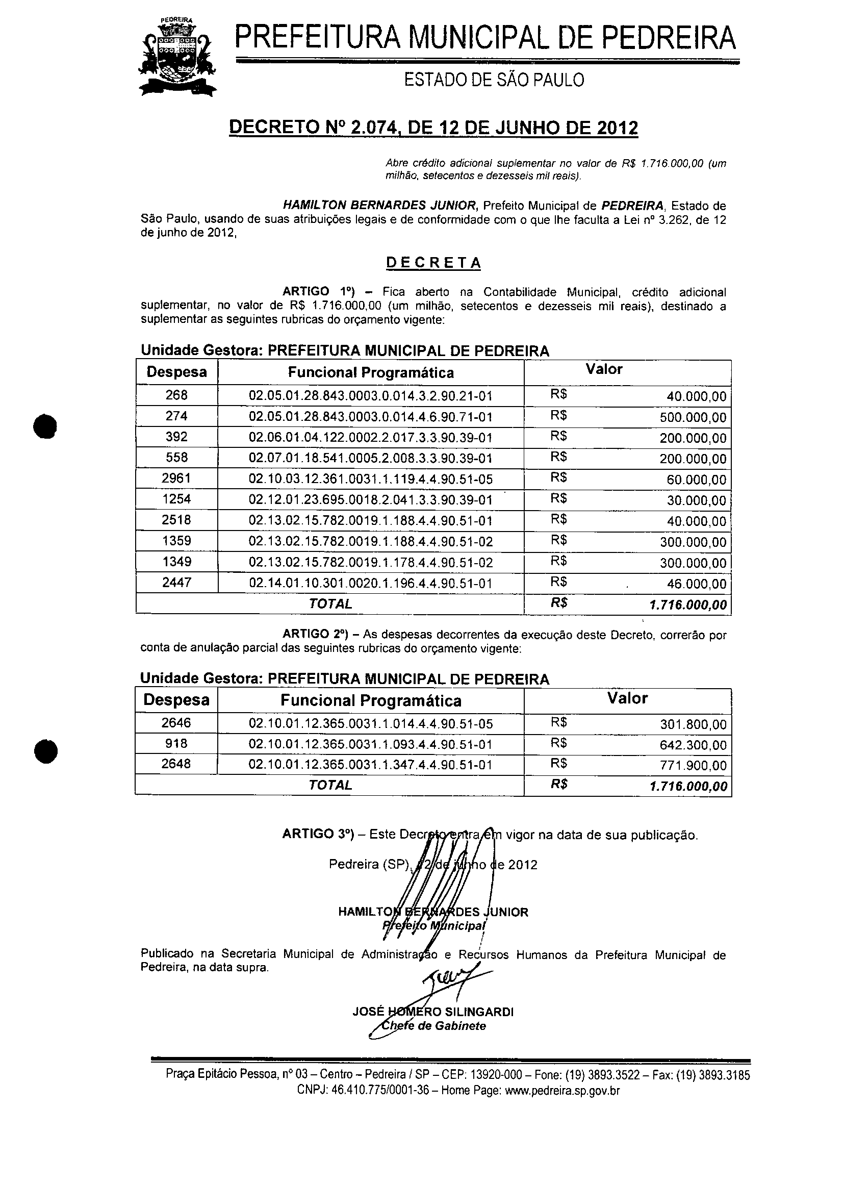Ementa: Abre crédito adícional suplementar no valor de R$ 1.716.000,00 (um milhão, setecentos e dezesseis mil reais).