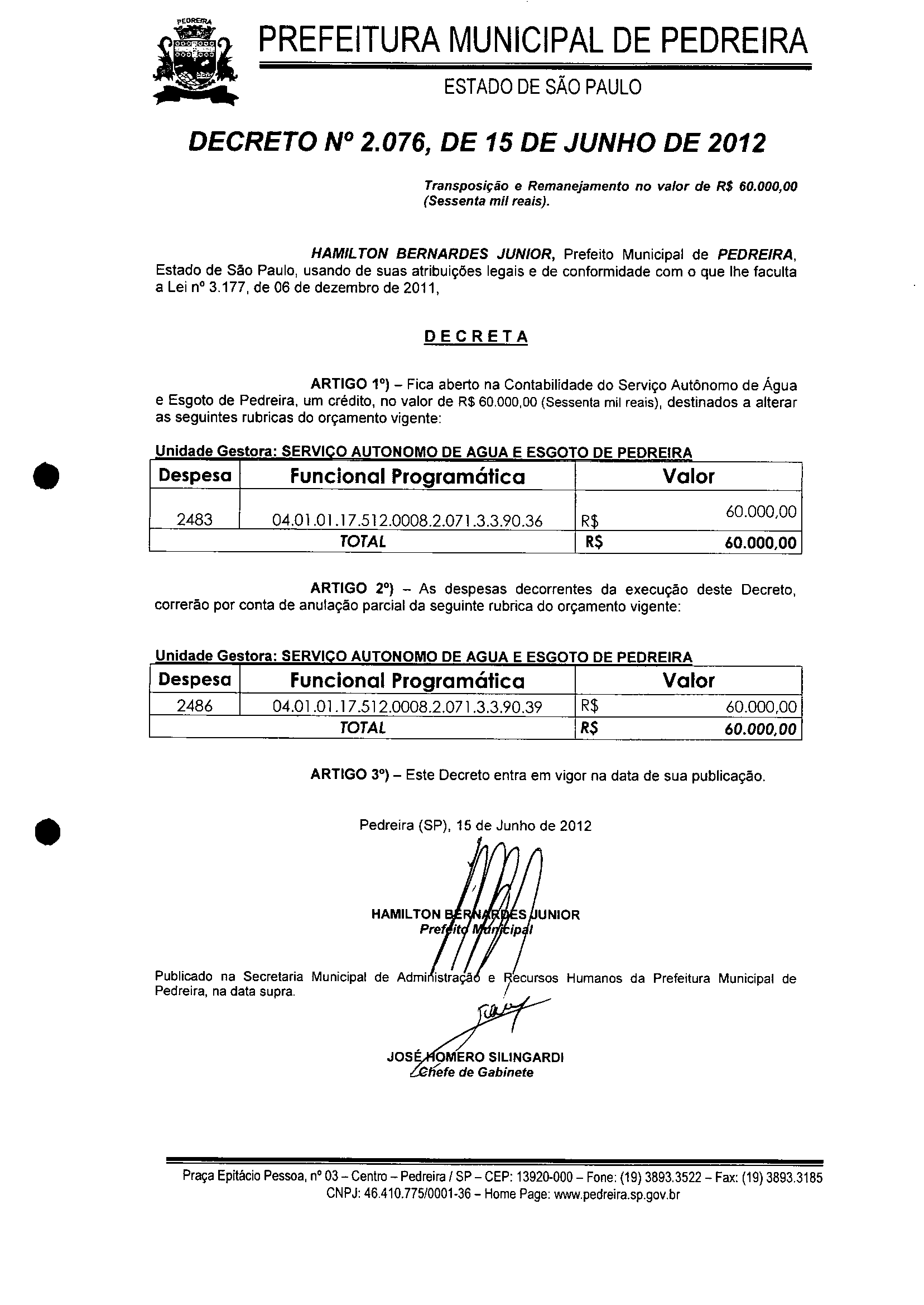 Ementa: Transposição e Remanejamento no valor de R$ 60.000,00 (Sessenta mil reais).
