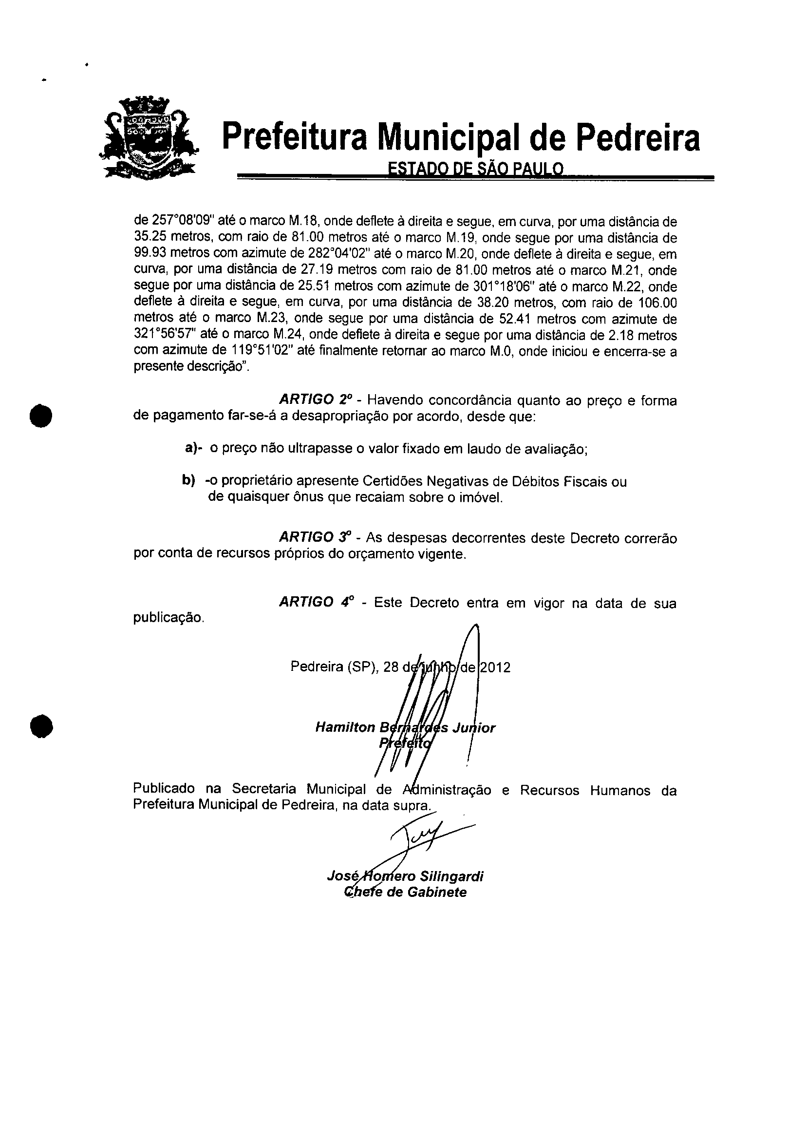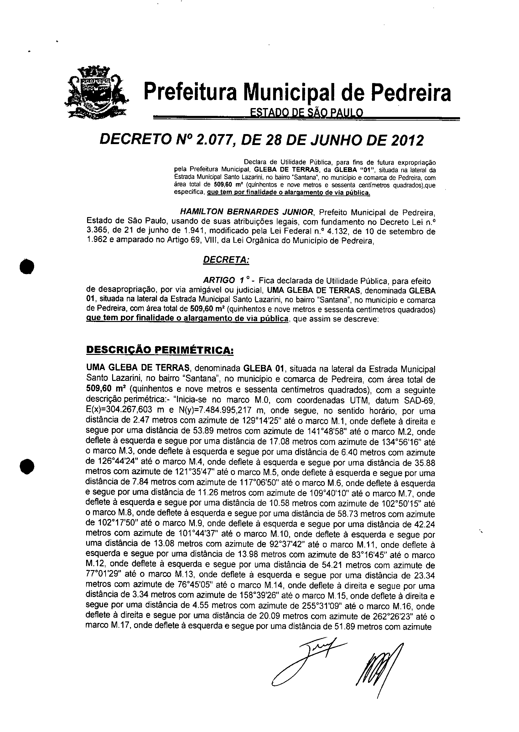 Ementa: Declara de Utilidade Pública, para fins de futura expropriação pela Prefeitura Municipal. GLEBA DE TERRAS, da GLEBA "01", situada na lateral da Estrada Municipal Santo Lazarini, no bairro 'Santana', no município e comarca de Pedreira, com área total de 509,60 m2 (quinhentos e nove metros e sessenta centímetros quadrados),que especifica, que tem por finalidade o alargamento de via pública.