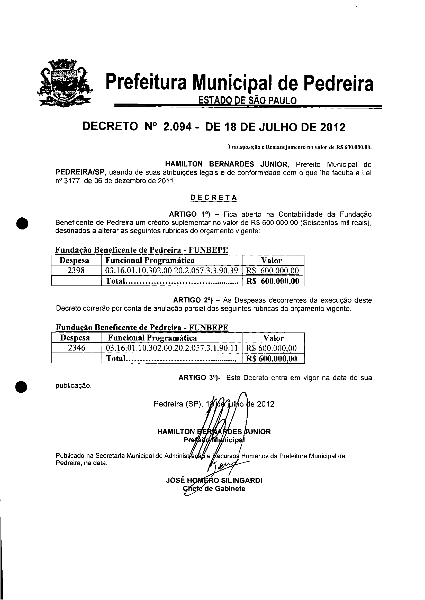 Ementa: Transposição e Remanejamento no valor de R$ 600.000.00.
