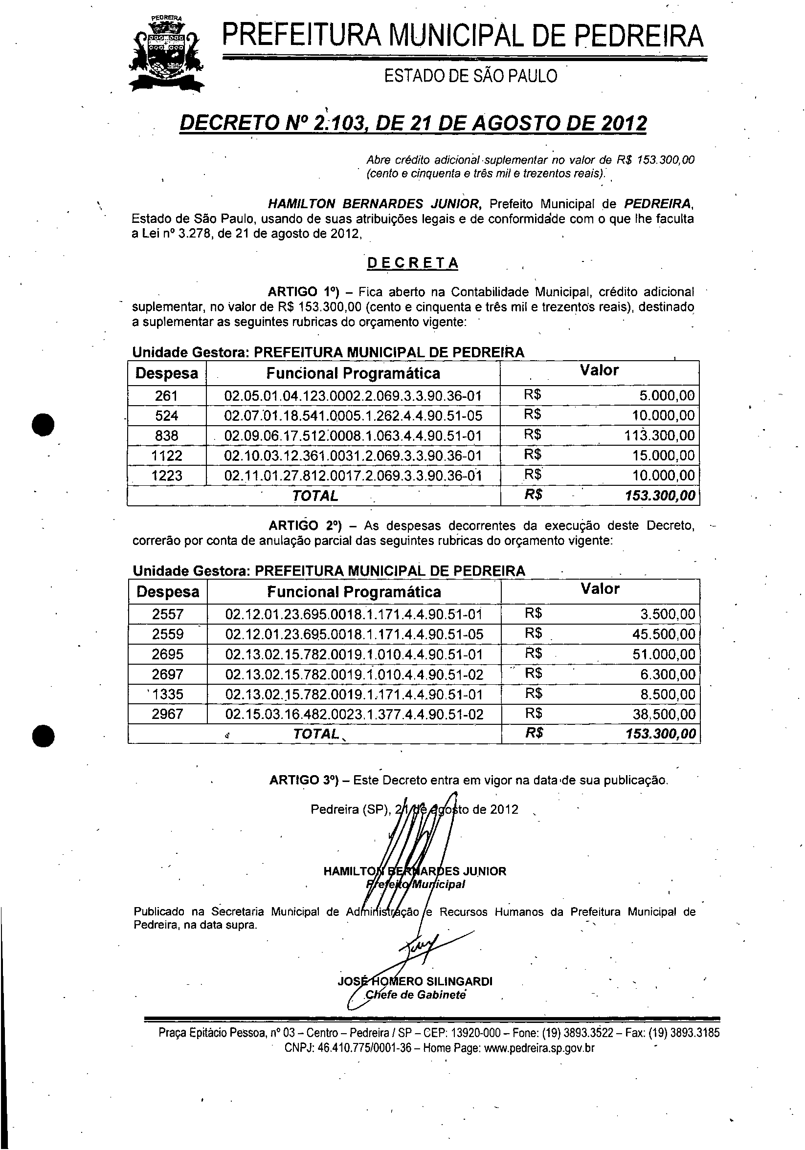 Ementa: Abre crédito adicional suplementar no valor de R$ 153.300,00 (cento e cinquenta e três mil e trezentos reais).