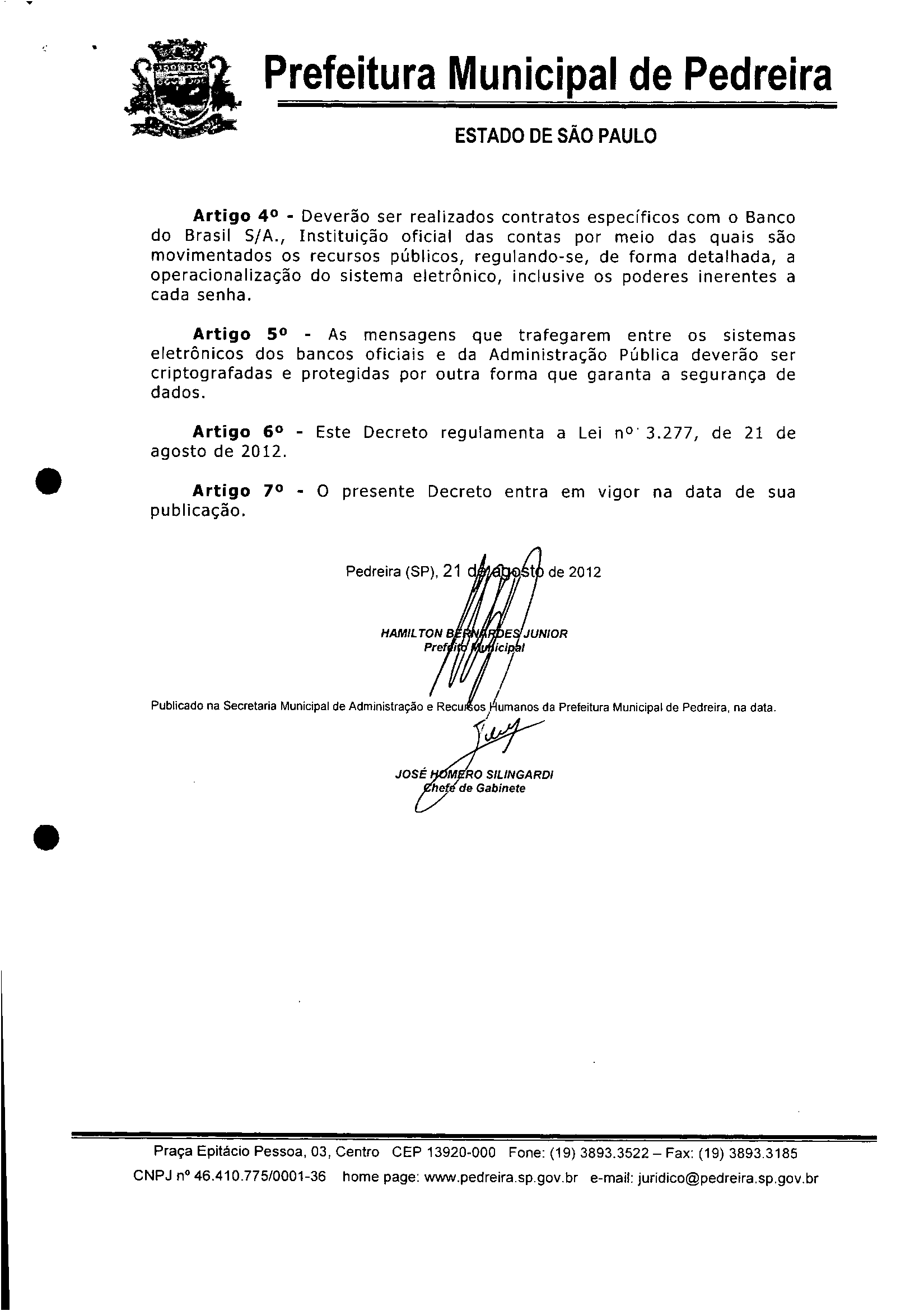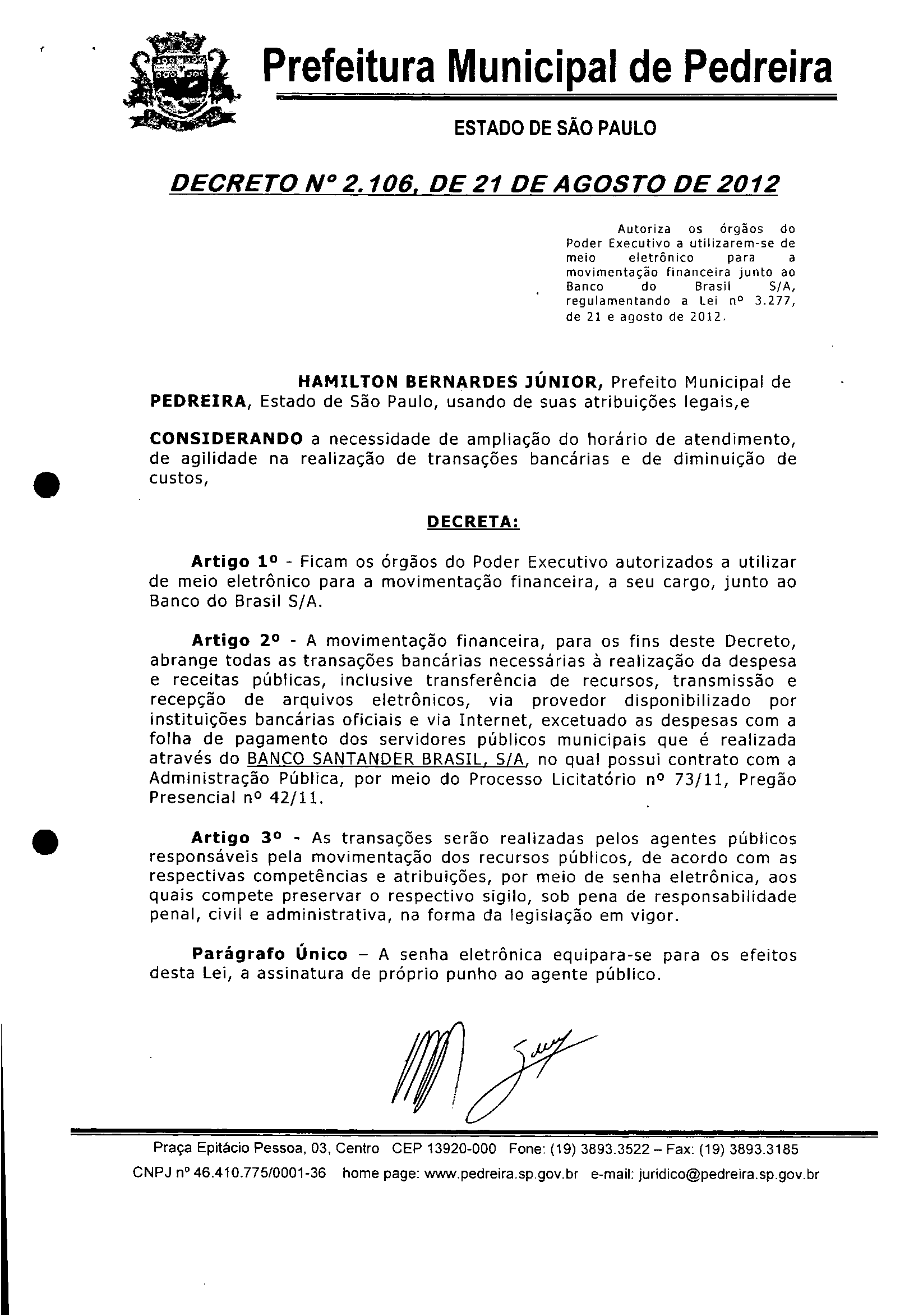 Ementa: Autoriza os órgãos do Poder Executivo a utilizarem-se de meio eletrônico para a movimentação financeira junto ao Banco do Brasil S/A, regulamentando a Lei nº 3.277, de 21 e agosto de 2012.