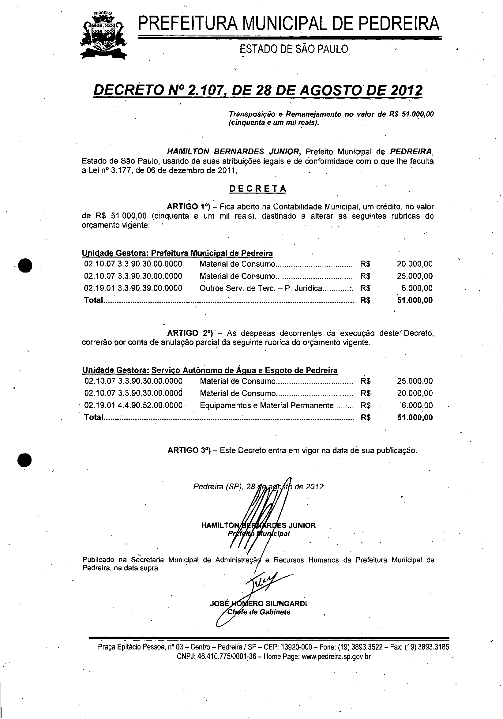 Ementa: Transposição e Remanejamento no valor de R$ 51.000,00 (cinquenta e um mil reais).
