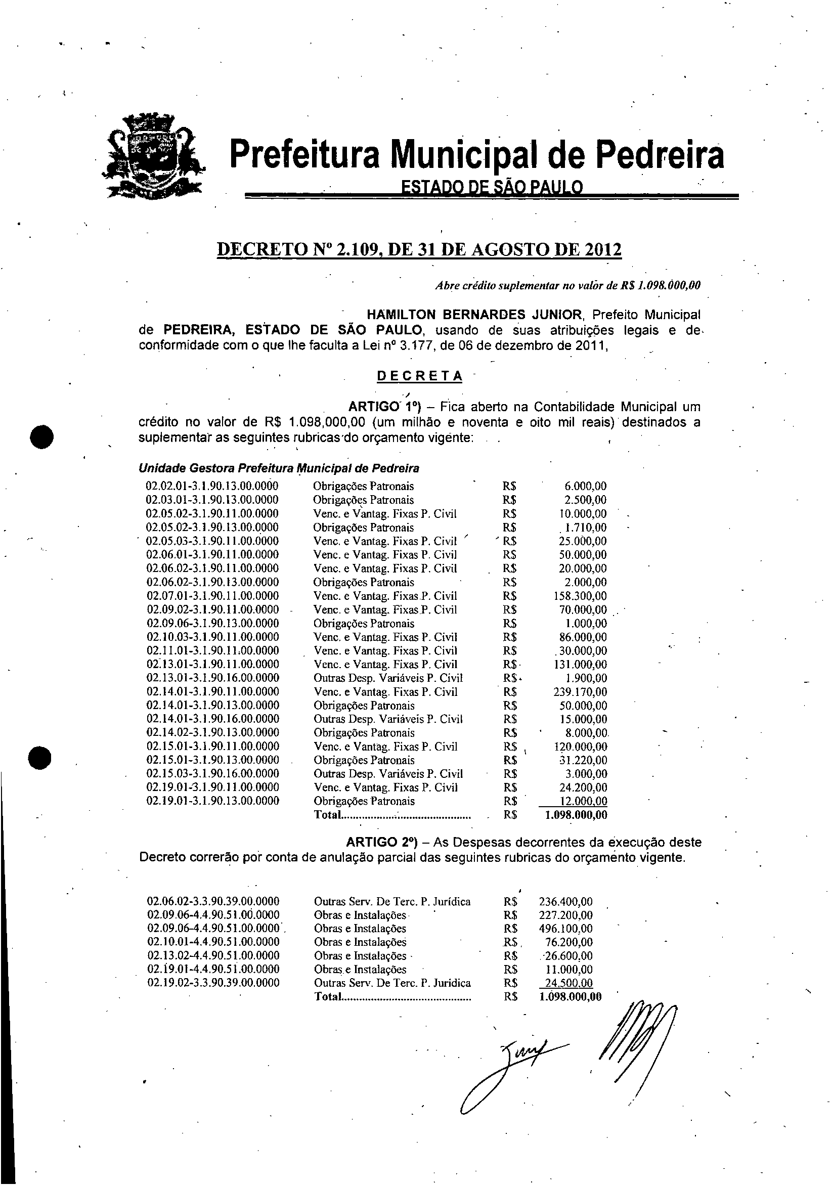 Ementa: Abre crédito suplementar no valor de RS 1.098.000,00