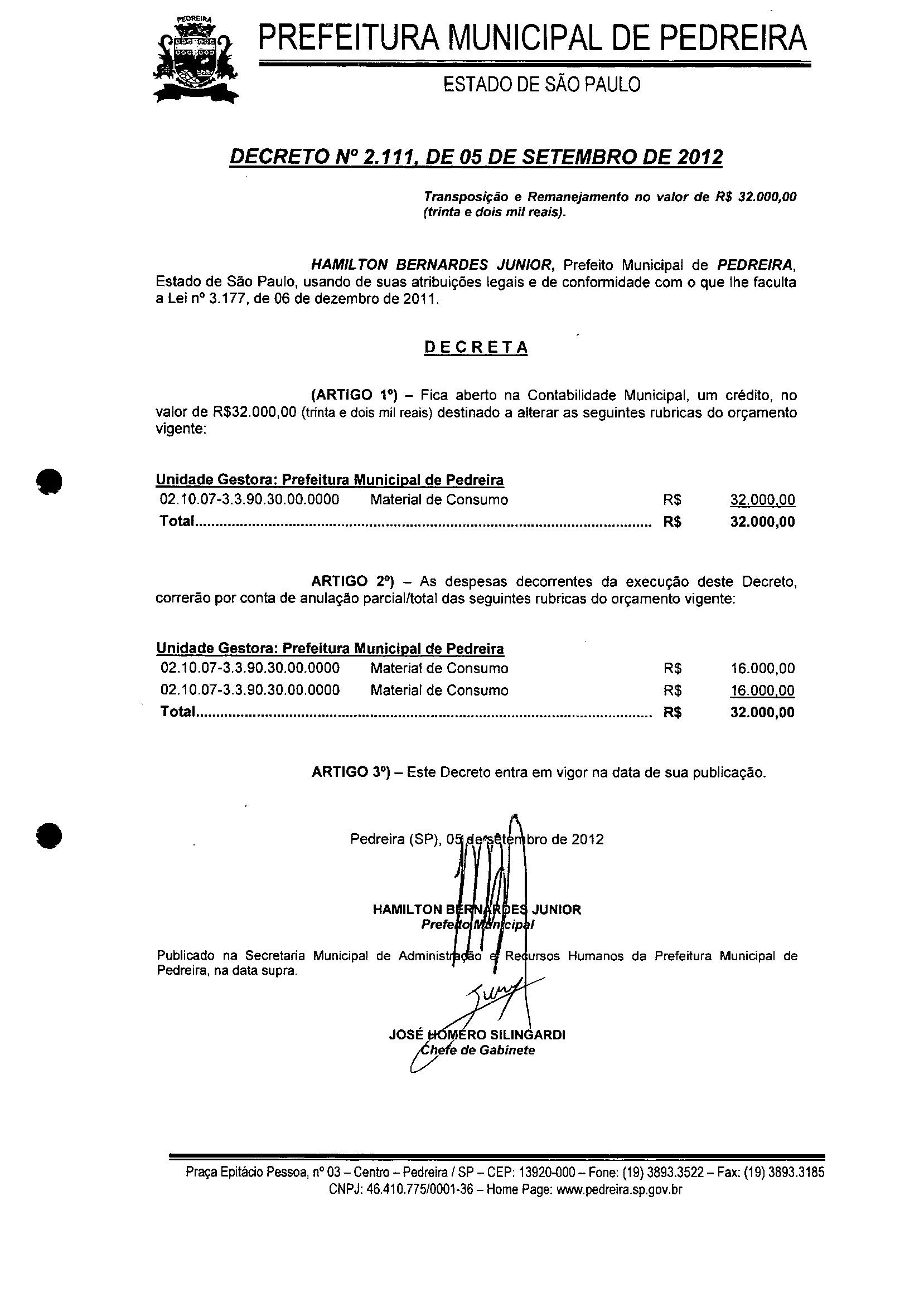 Ementa: Transposição e Remanejamento no valor de R$ 32.000,00 (trinta e dois mil reais).