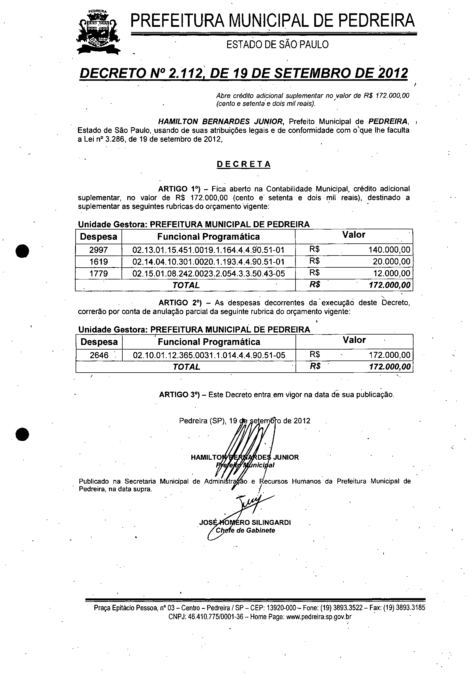 Ementa: Abre crédito adicional suplementar no valor de R$ 172.000,00, (cento e setenta e dois mil reais)