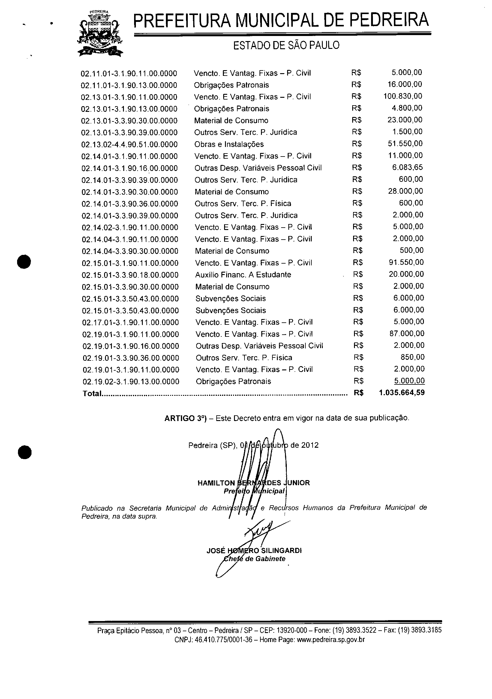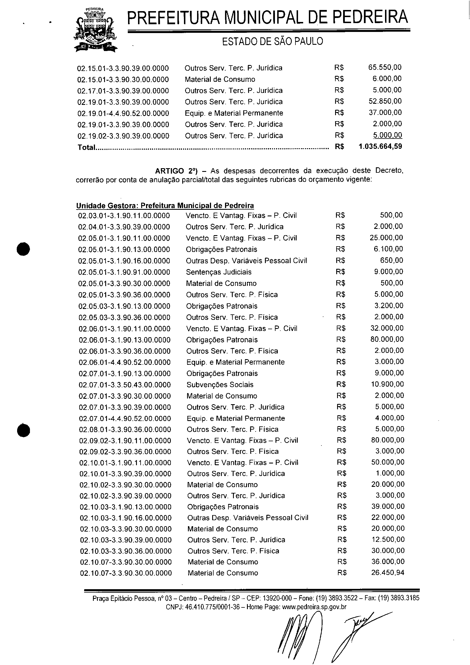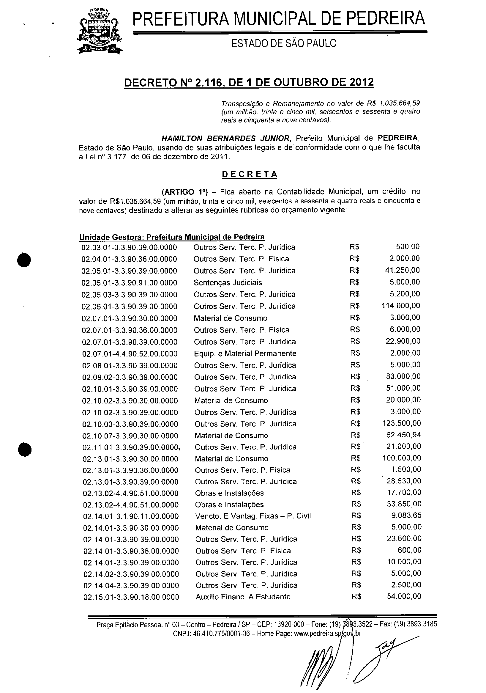 Ementa: Transposição e Remanejamento no valor de R$ 1.035.664,59 (um milhão, trinta e cinco mil, seiscentos e sessenta e quatro reais e cinquenta e nove centavos).