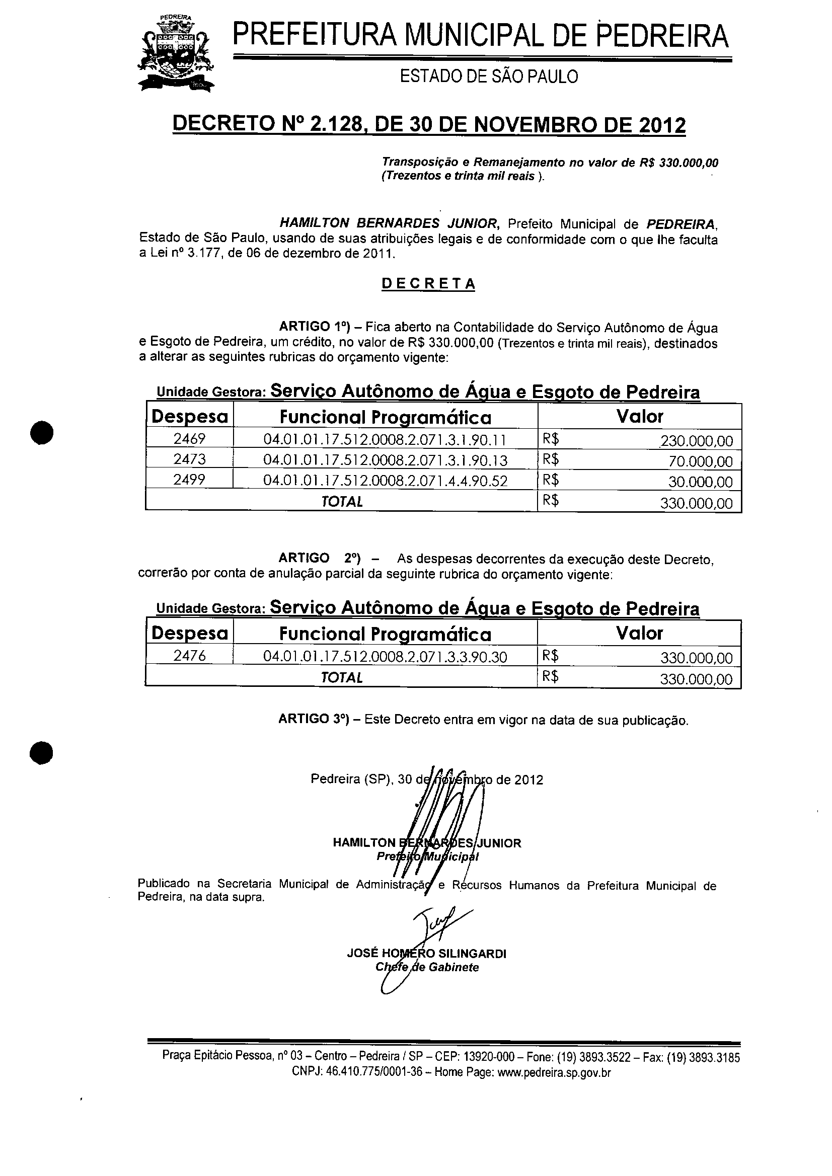 Ementa: Transposição e Remanejamento no valor de R$ 330.000,00 (Trezentos e trinta mil reais ).