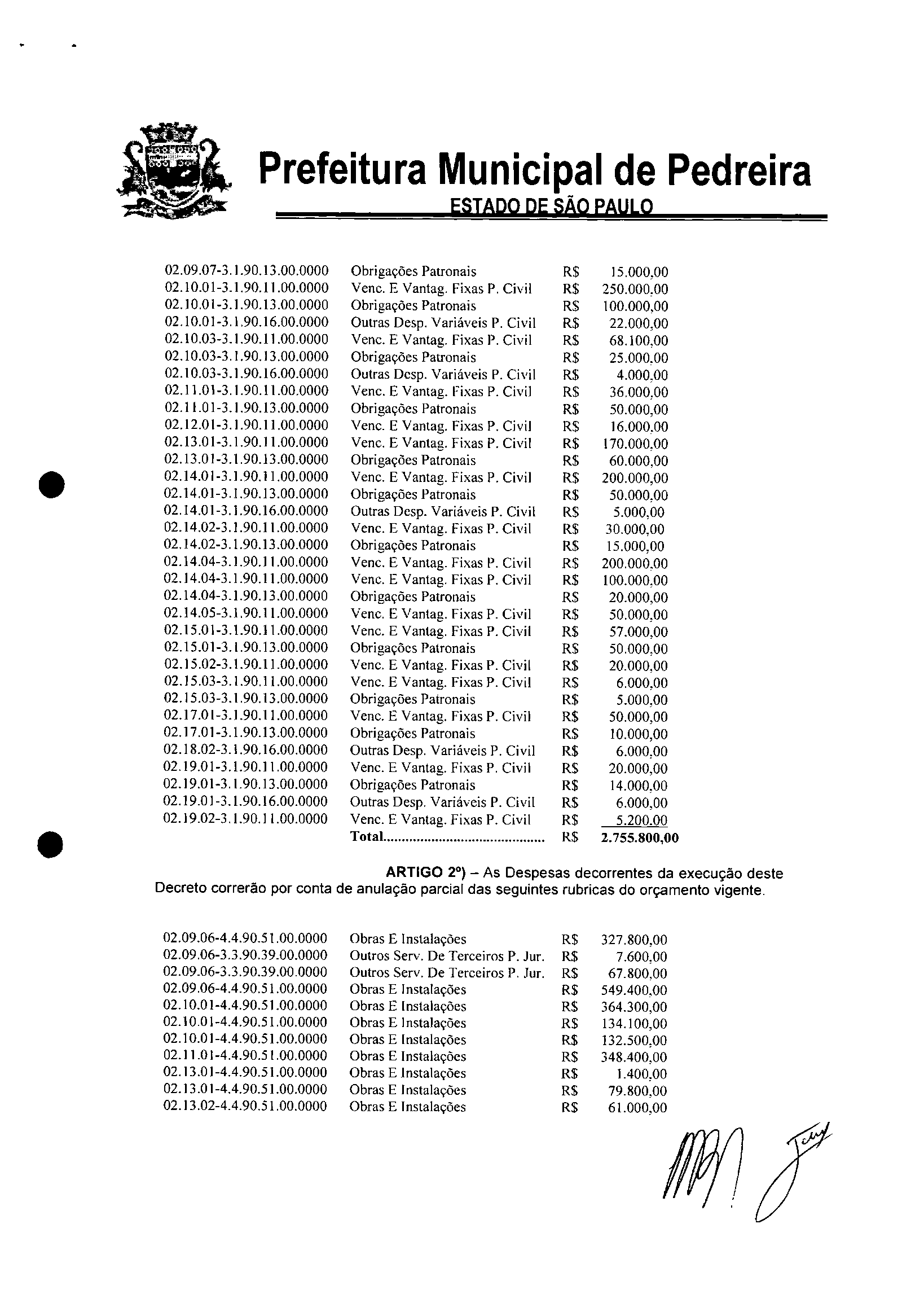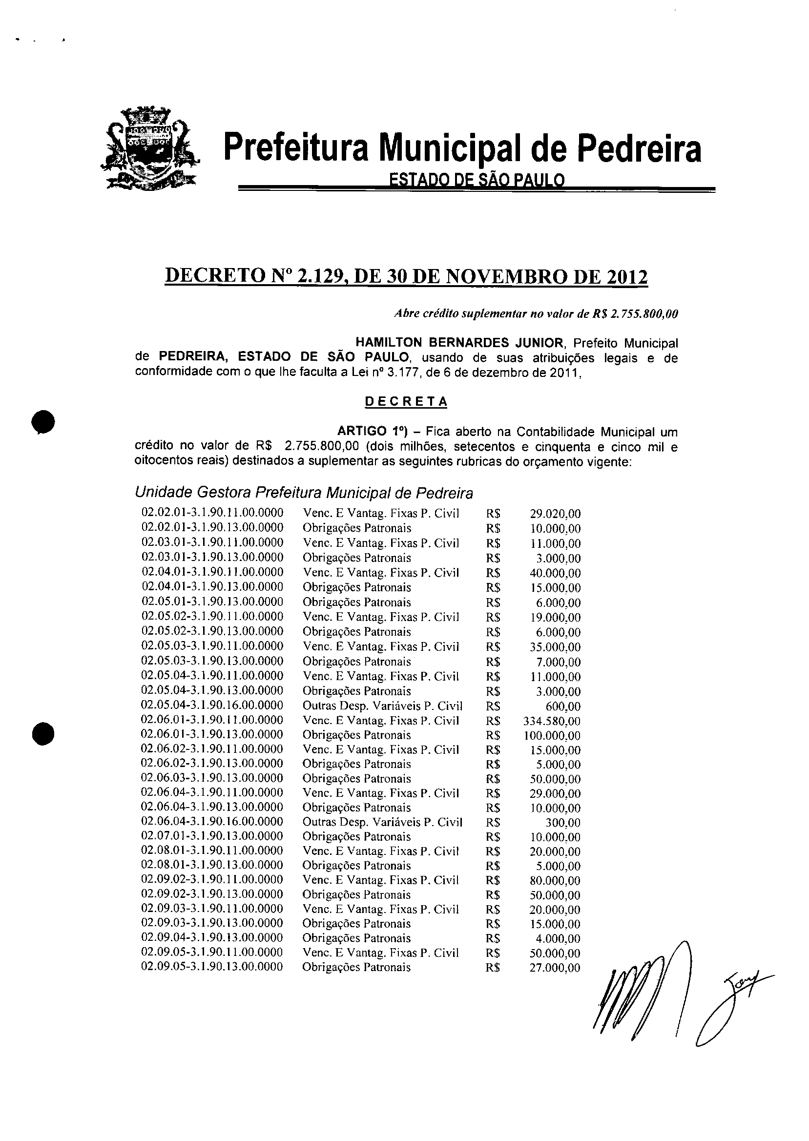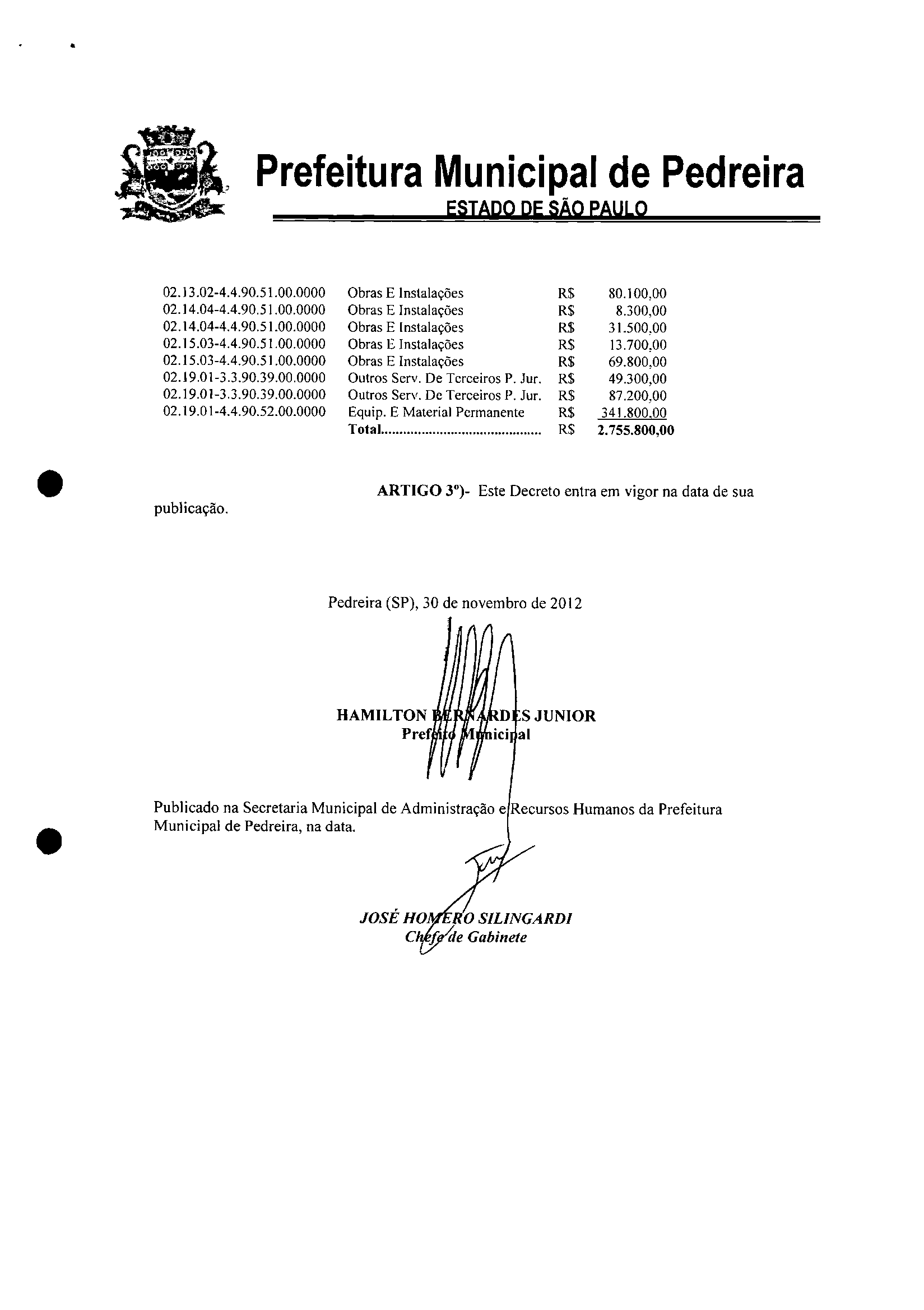Ementa: Abre crédito suplementar no valor de R$ 2.755.800,00