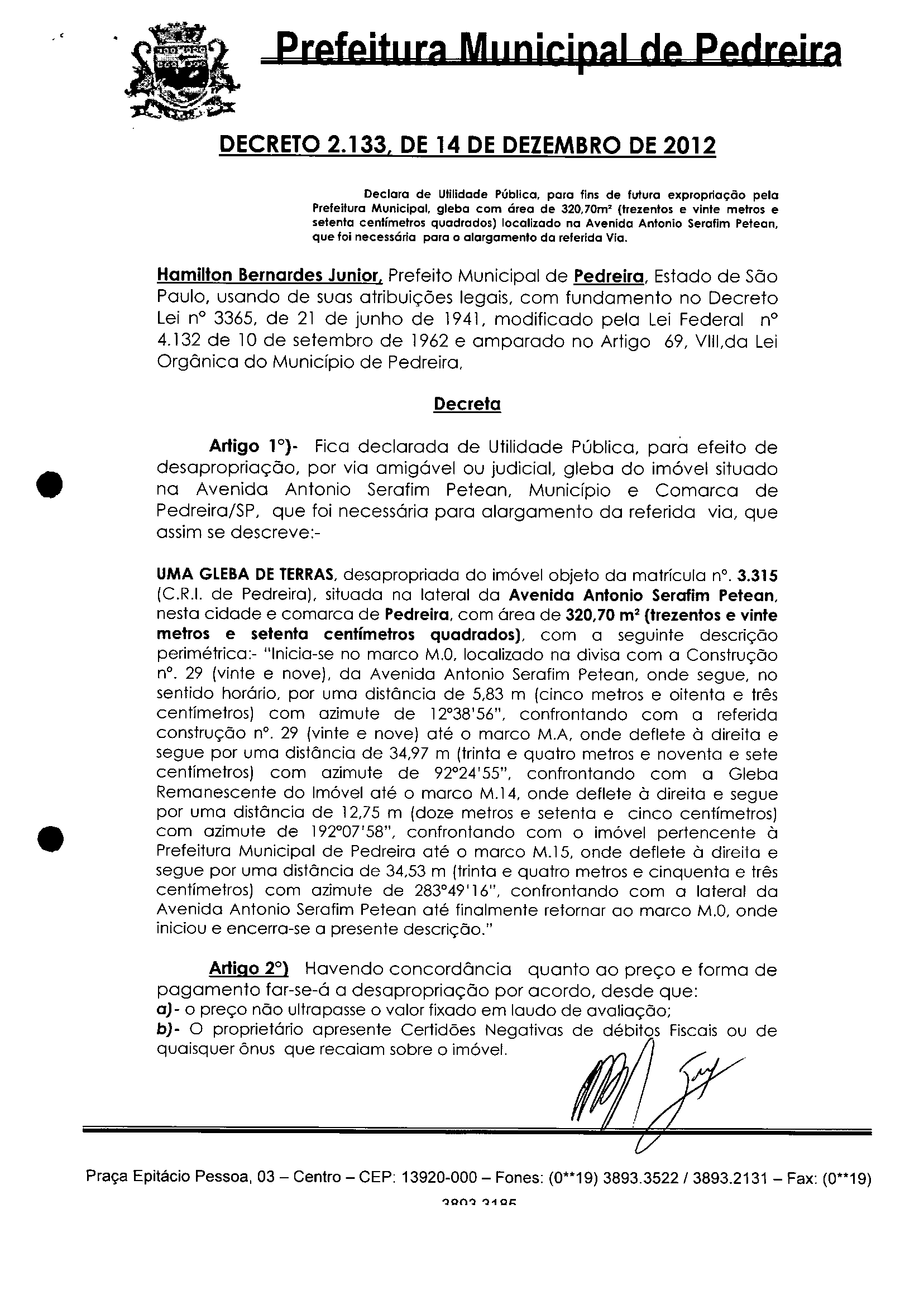Ementa: Declara de Utilidade Pública, para fins de futura expropriação pela Prefeitura Municipal, gleba com área de 320,70m" (trezentos e vinte metros e setenta centímetros quadrados) localizado na Avenida Antonio Serafim Peleon, que foi necessária para o alargamento da referida Via.