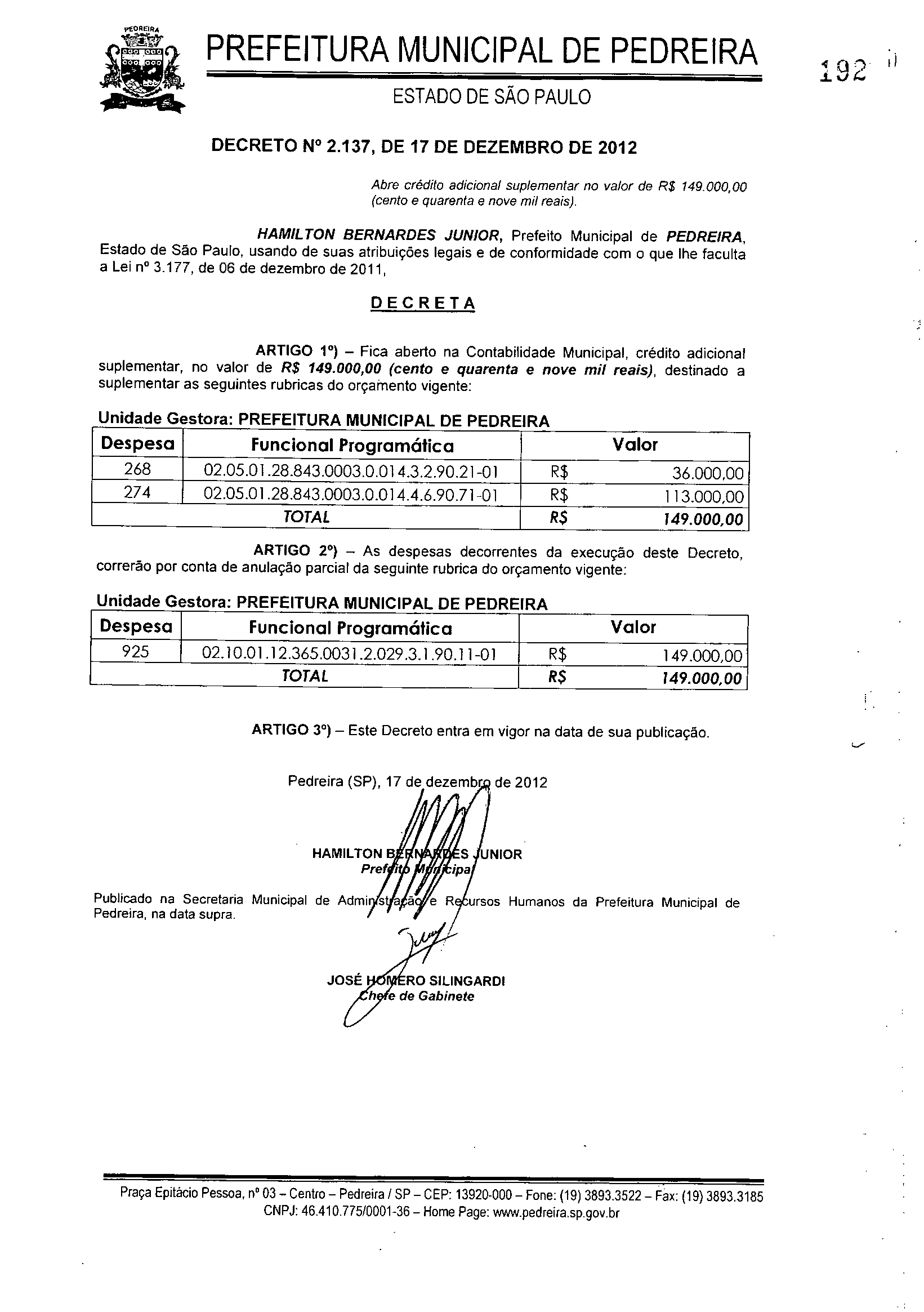 Ementa: Abre crédito adicional suplementar no valor de R$ 149.000,00 (cento e quarenta e nove mil reais)