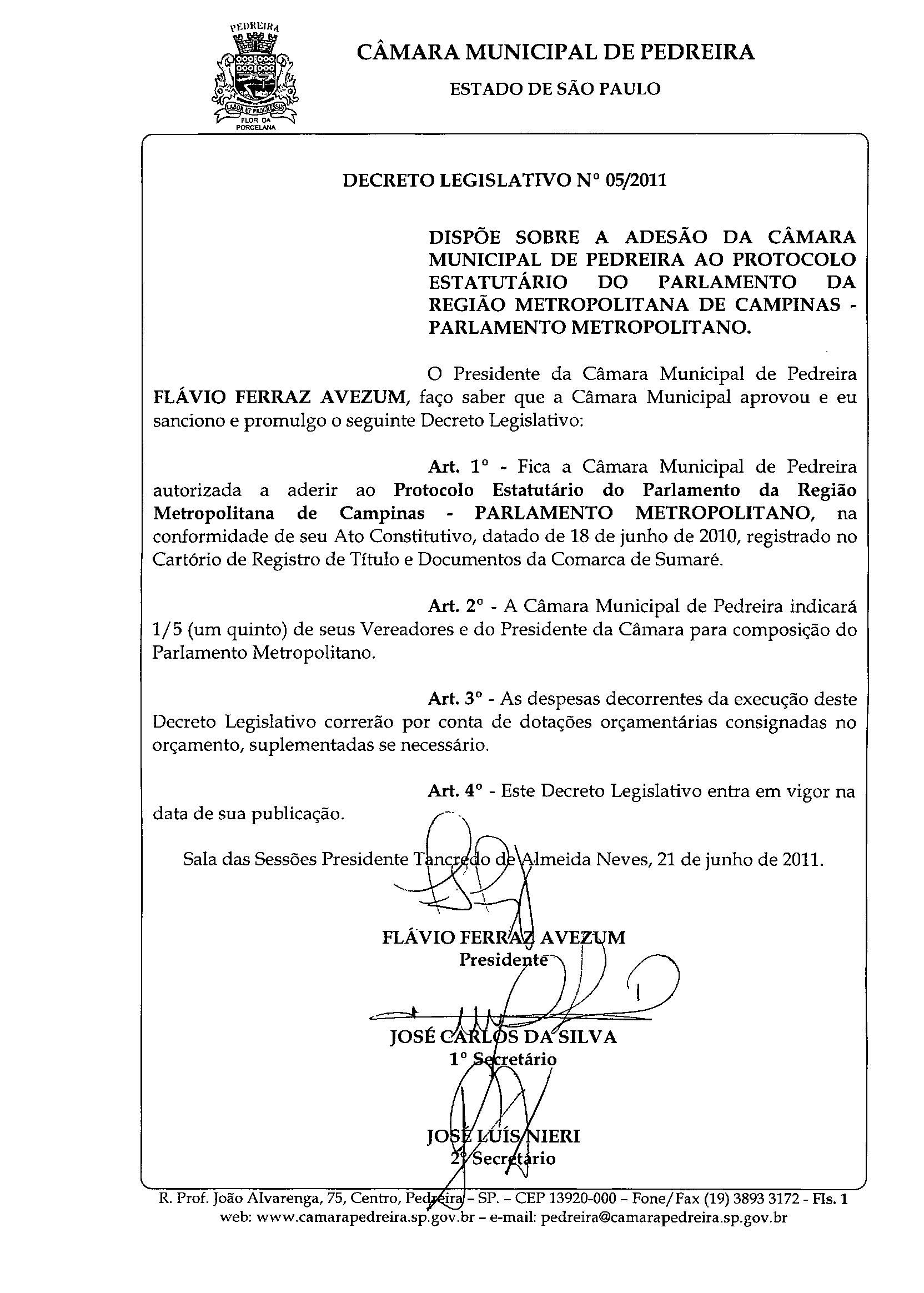 Ementa: DISPÕE SOBRE A ADESÃO DA CÂMARA MUNICIPAL DE PEDREIRA AO PROTOCOLO ESTATUTÁRIO DO PARLAMENTO DA -REGIAO METROPOLITANA DE CAMPINAS -PARLAMENTO METROPOLITANO.