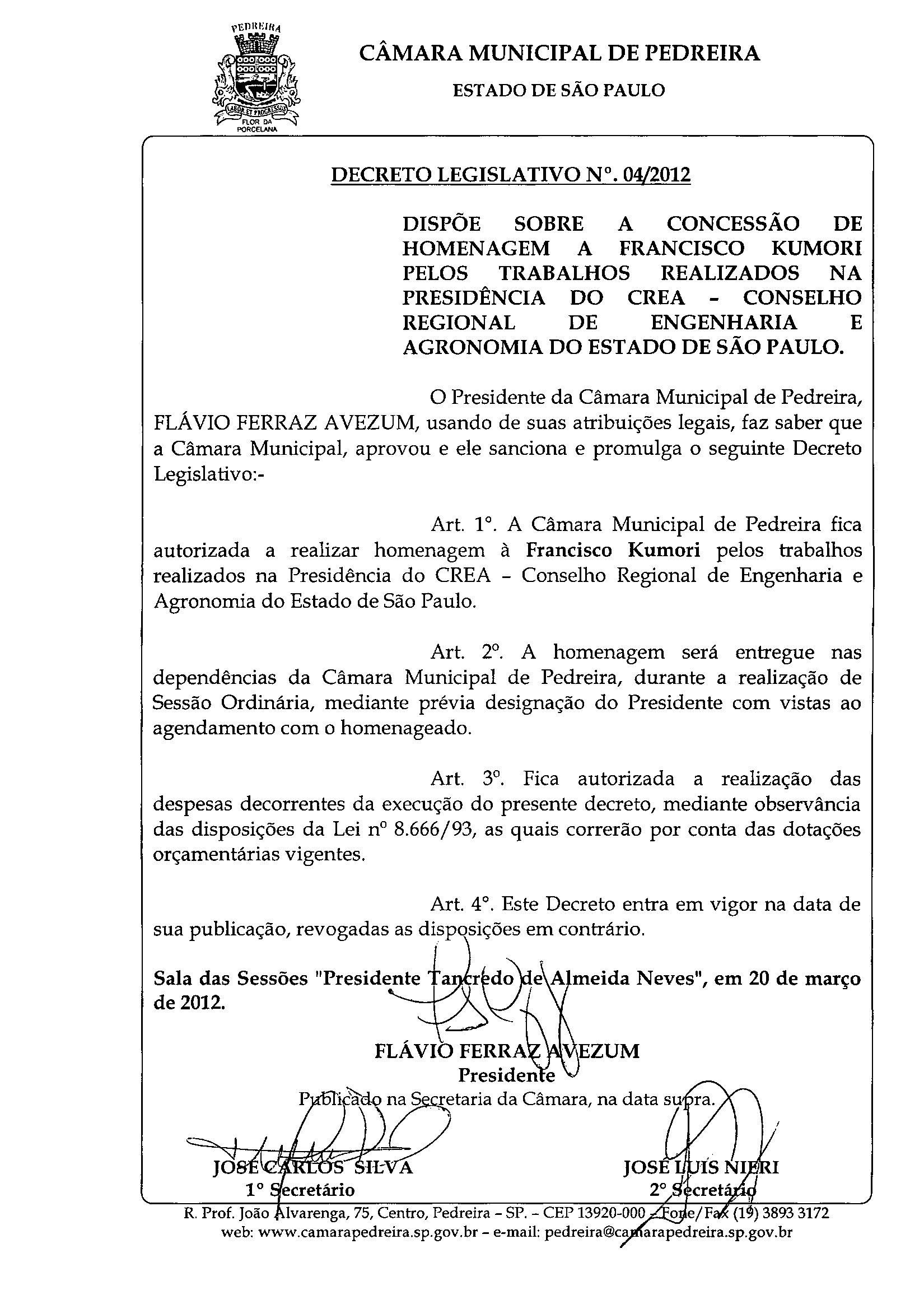 Ementa: DlSPOE SOBRE A CONCESSAO DE HOMENAGEM A FRANCISCO KUMORI PELOS TRABALHOS REALIZADOS NA PRESIDÊNCIA DO CREA -CONSELHO REGIONAL DE ENGENHARIA E AGRONOMIA DO ESTADO DE SAO PAULO.