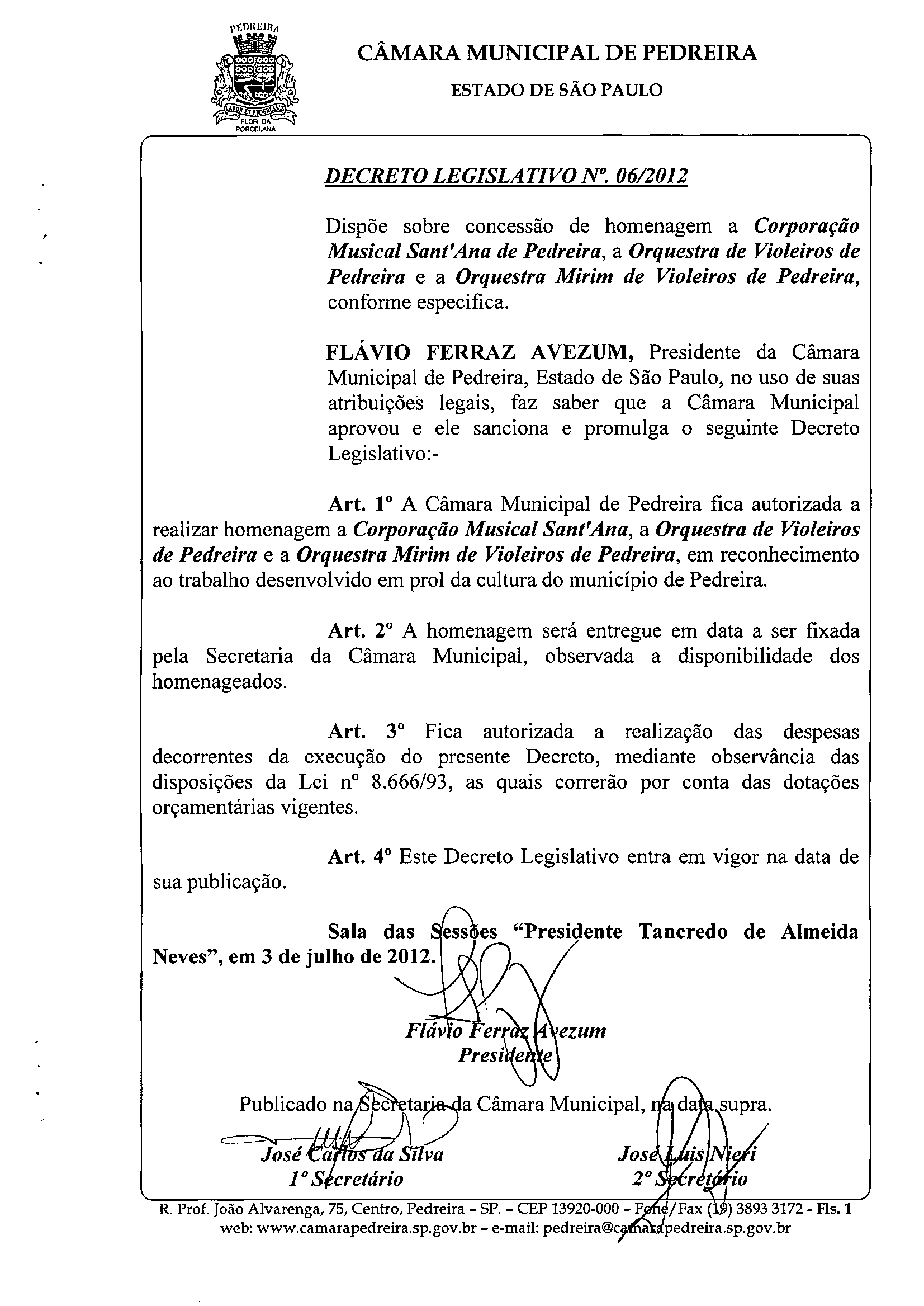 Ementa: Dispõe sobre concessão de homenagem a Corporação Musical Sant'Ana de Pedreira, a Orquestra de Violeiros de Pedreira e a Orquestra Mirim de Violeiros de Pedreira, conforme especifica.