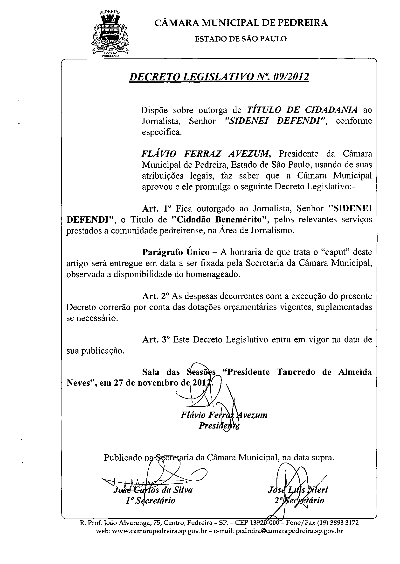 Ementa: Dispõe sobre outorga de TÍTULO DE CIDADANIA ao Jornalista, Senhor "SIDENEI DEFENDI", conforme especifica.