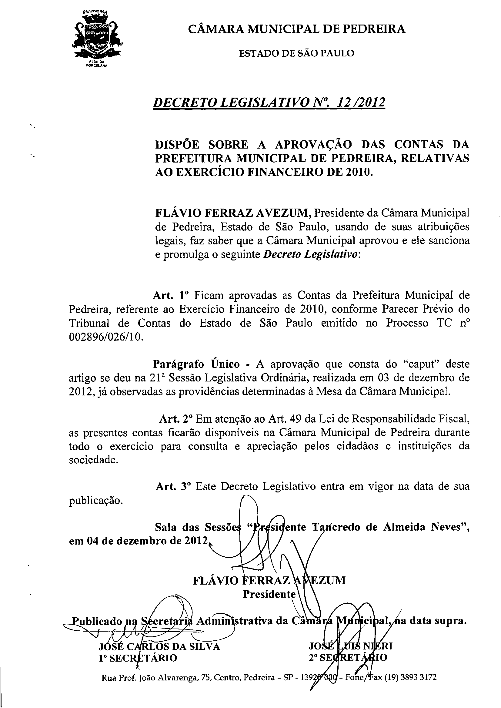 Ementa: DISPÕE SOBRE A APROVAÇÃO DAS CONTAS DA PREFEITURA MUNICIPAL DE PEDREIRA, RELATIVAS AO EXERCÍCIO FINANCEIRO DE 2010.