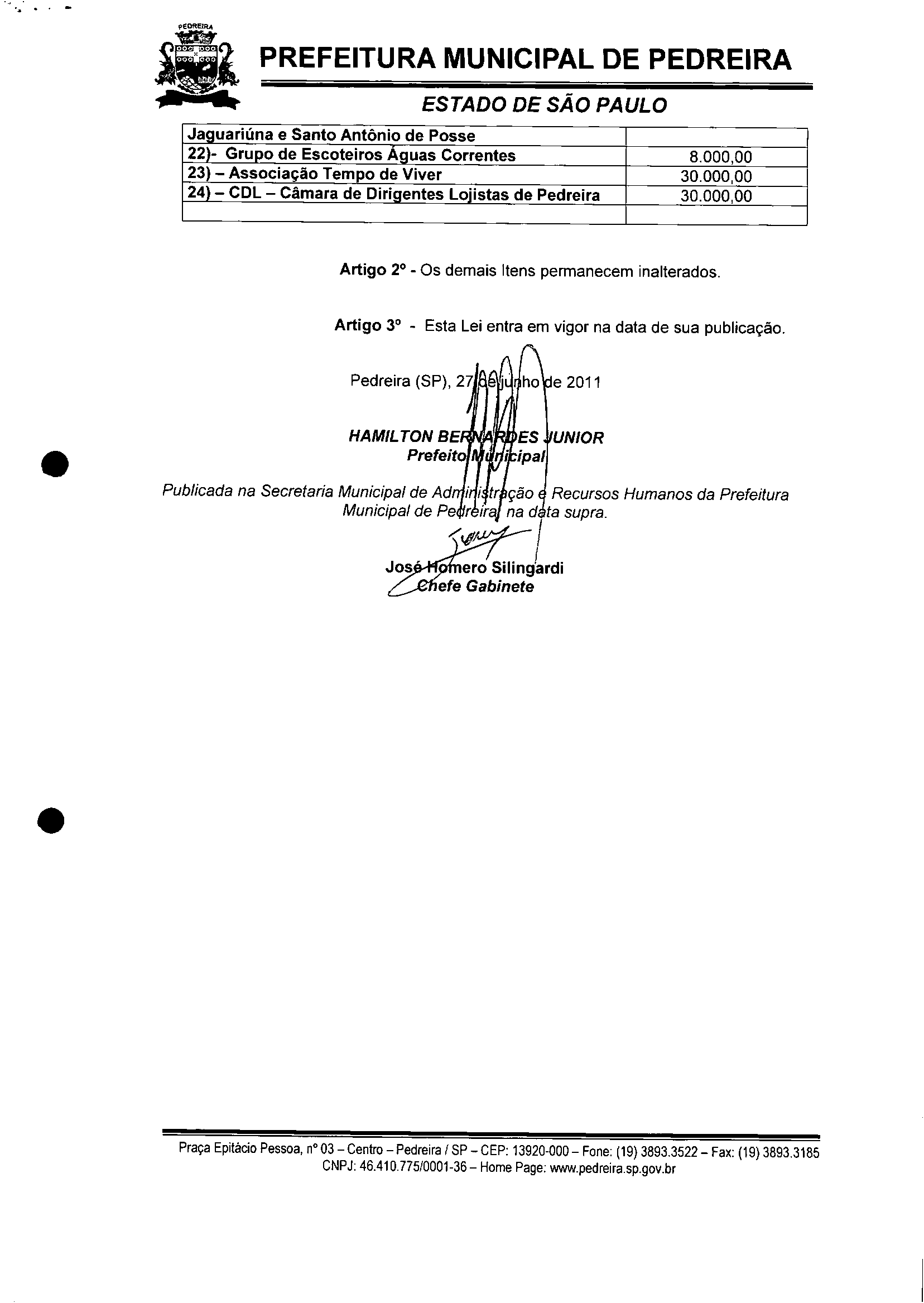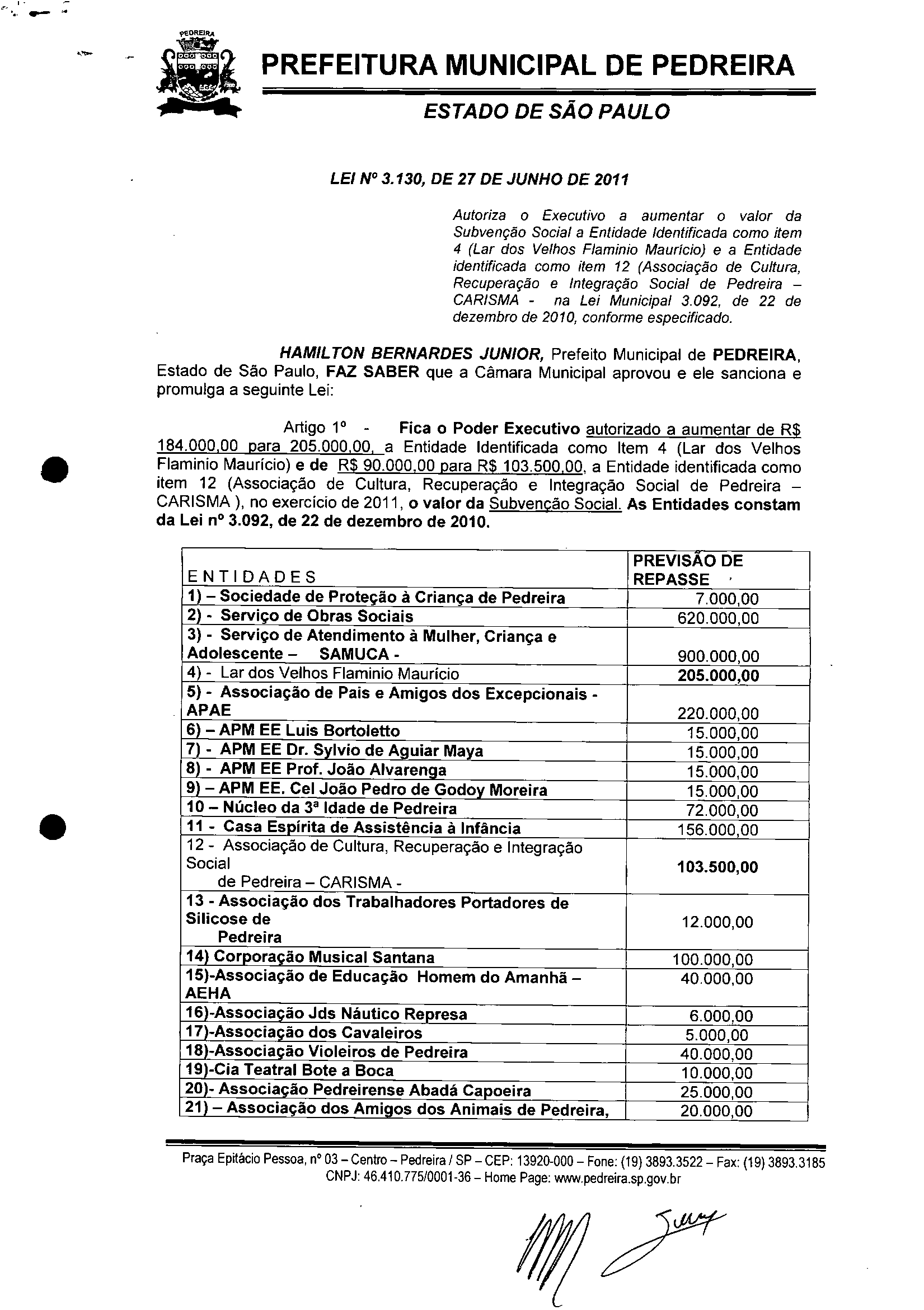 Ementa: Autoriza o Executivo a aumentar o valor da Subvenção Social a Entidade Identificada como item 4 (Lar dos Velhos Flaminio Maurício) e a Entidade identificada como item 12 (Associação de Cultura, Recuperação e Integração Social de Pedreira -CARISMA -na Lei Municipal 3.092, de 22 de dezembro de 2010, conforme especificado.
