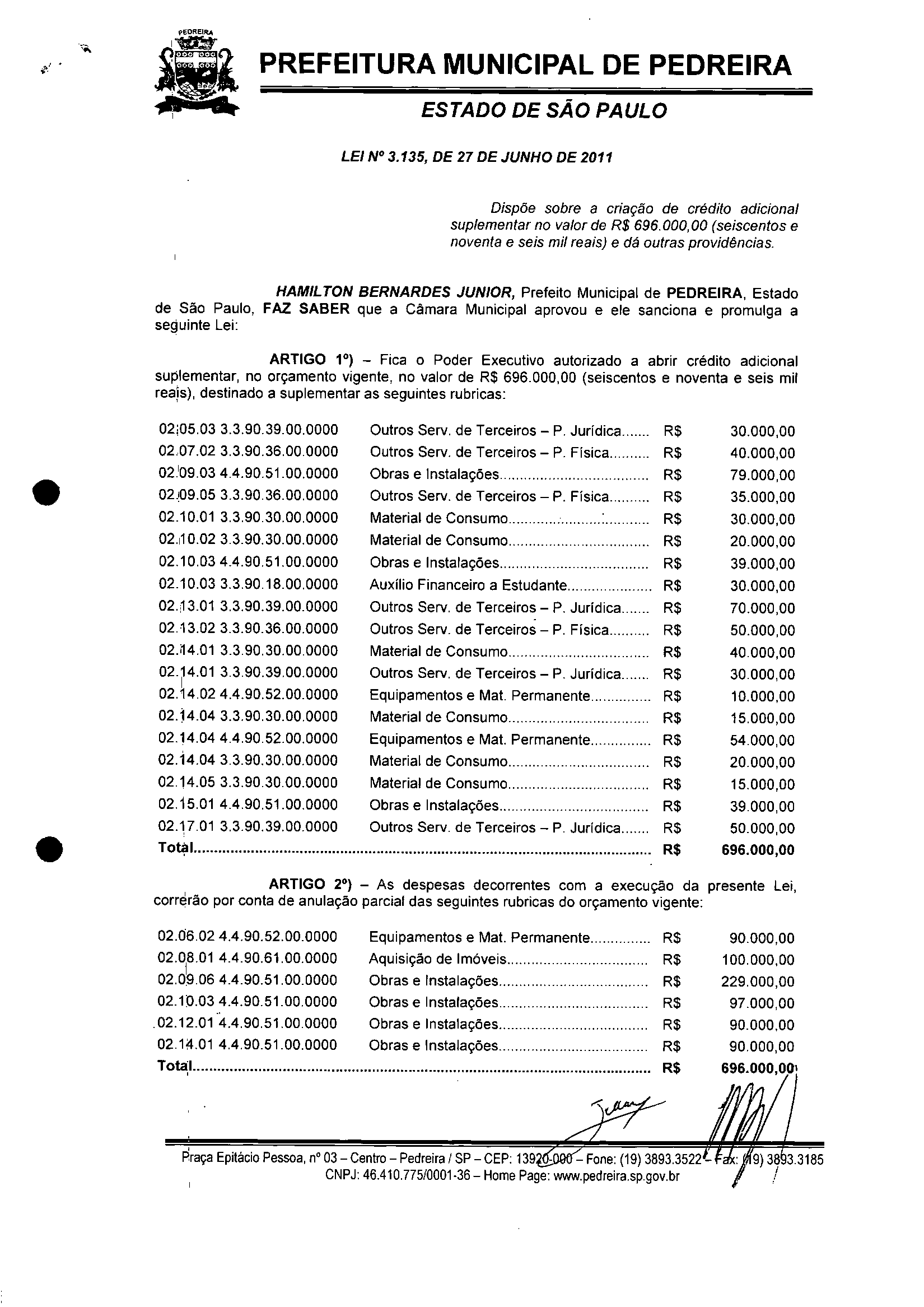 Ementa: Dispõe sobre a criação de crédito adicional suplementar no valor de R$ 696.000,00 (seiscentos e noventa e seis mil reais) e dá outras providências.
