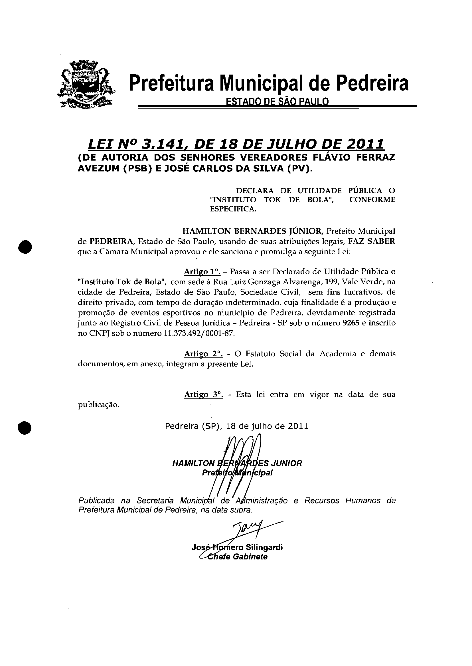 Lei Municipal - N° 3141 de 18/07/2011