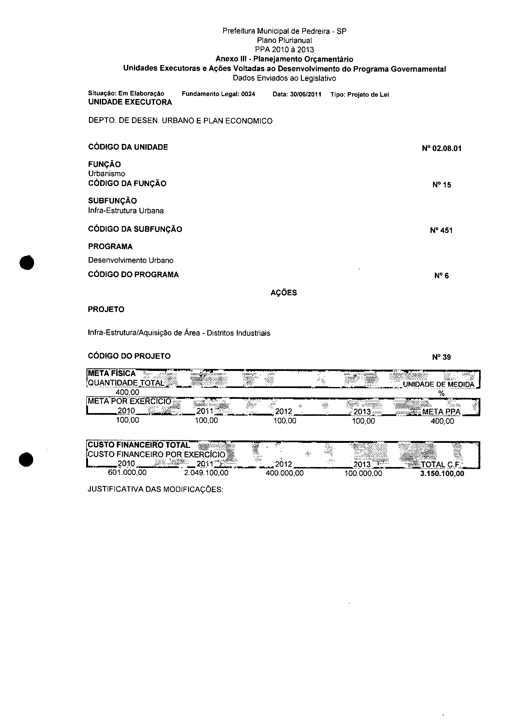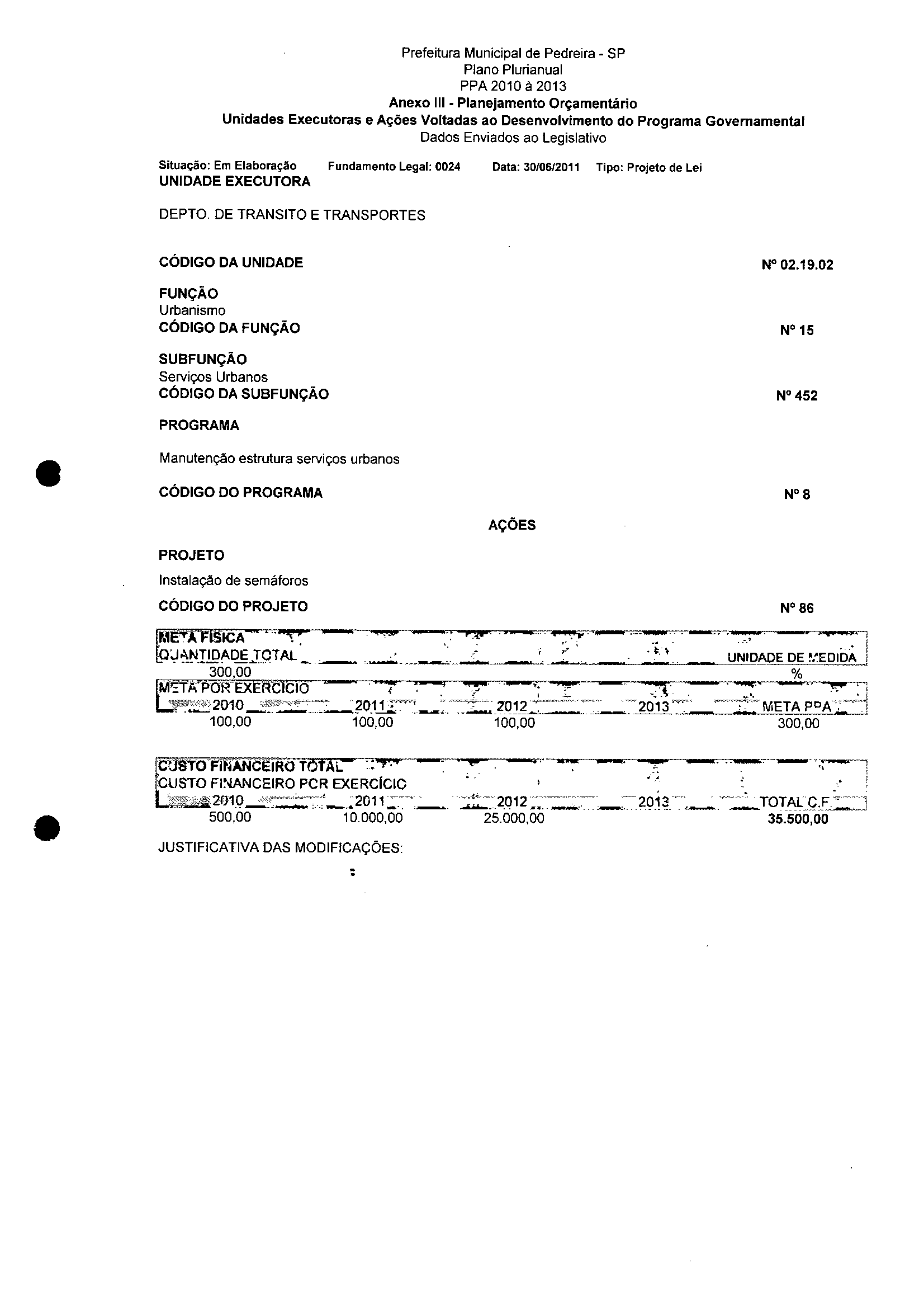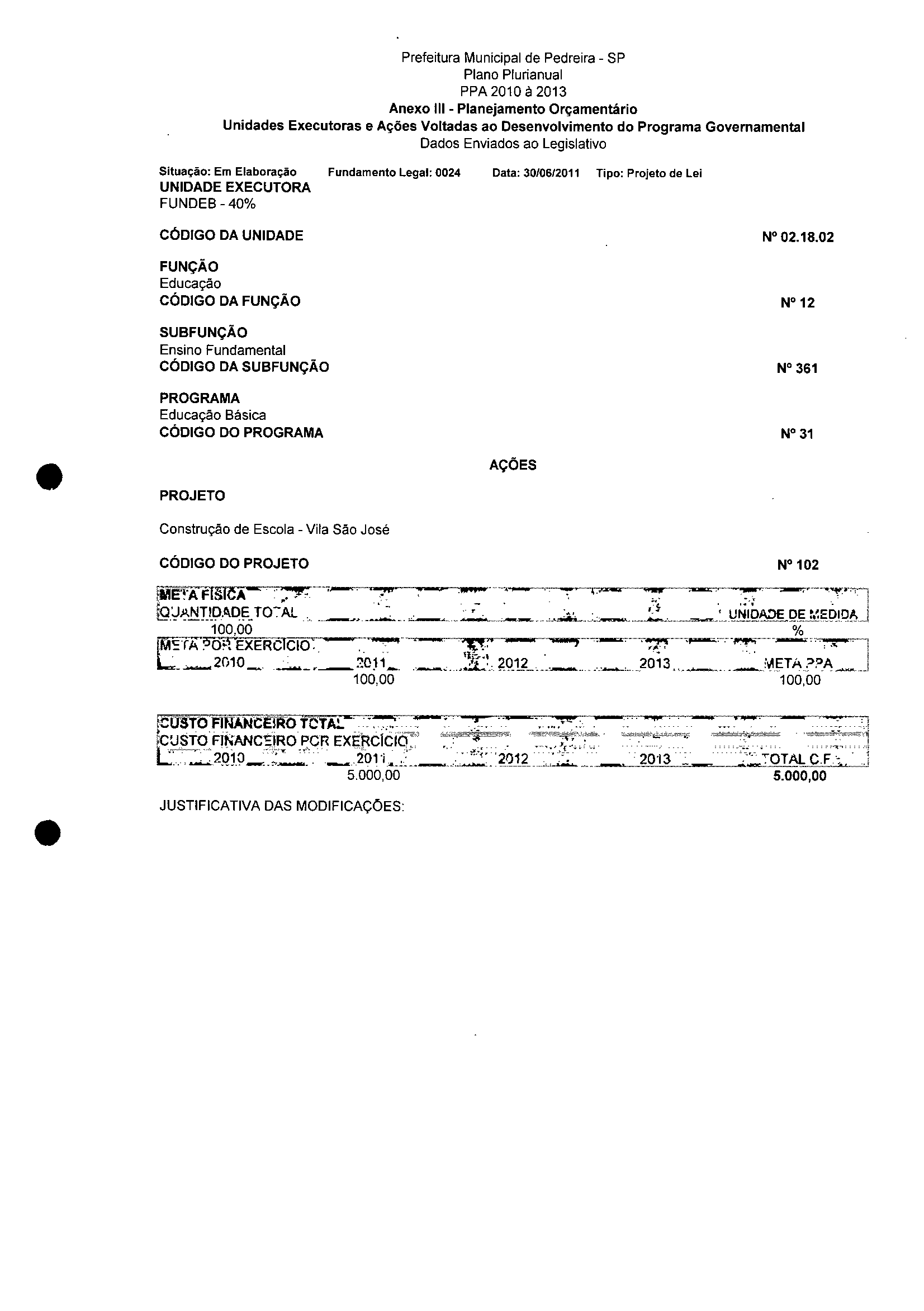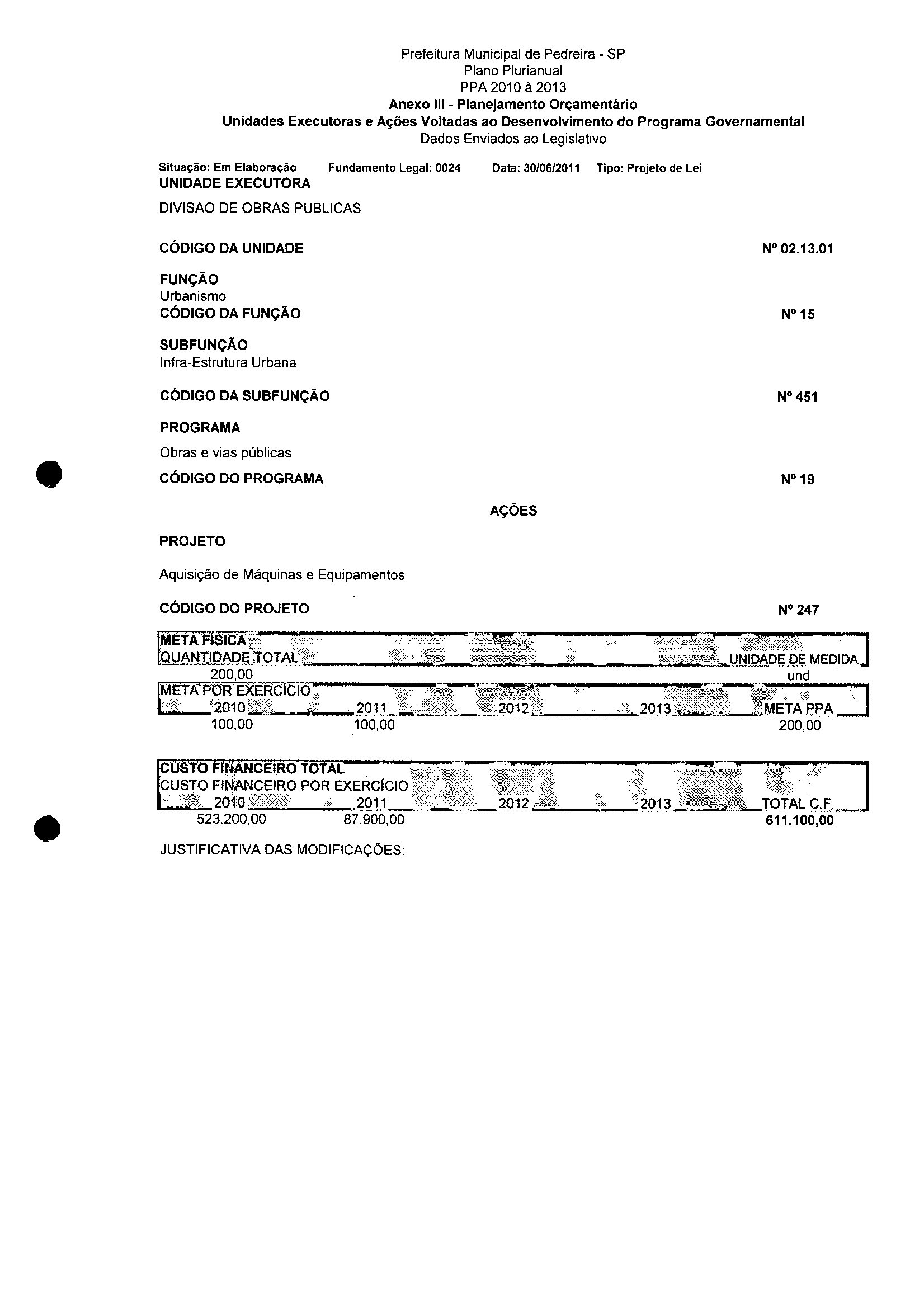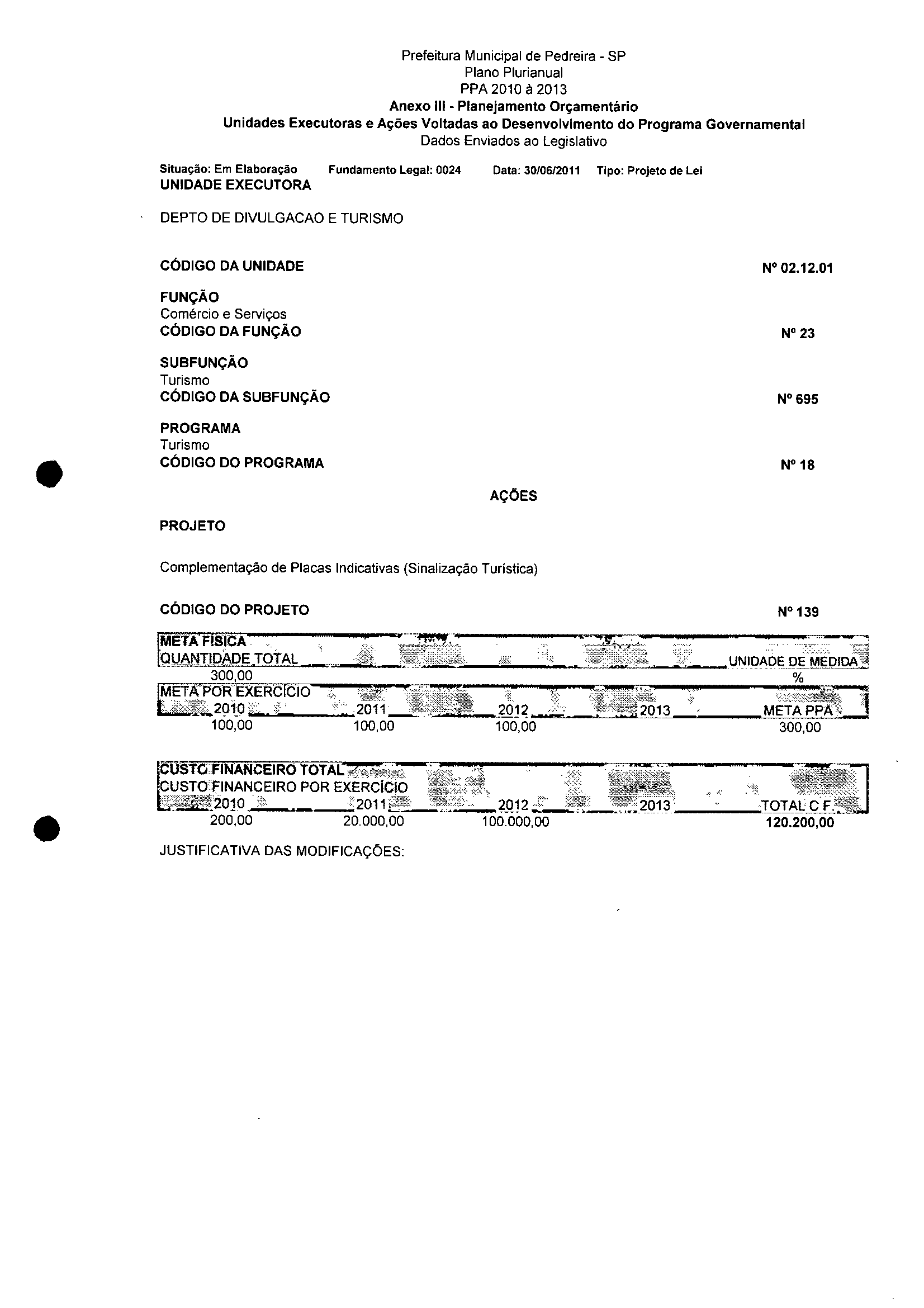 Ementa: Dispõe sobre a alteração dos anexos II e III - da Lei nº 2977, de 5 de novembro de 2009 - Plano Plurianual para o Quadriênio de 2010/2013 e a alteração dos anexos Ve VI -da Lei n° 3040, de 10 de junho de 2010 -Lei de Diretrizes Orçamentárias para o exercício de 2011.