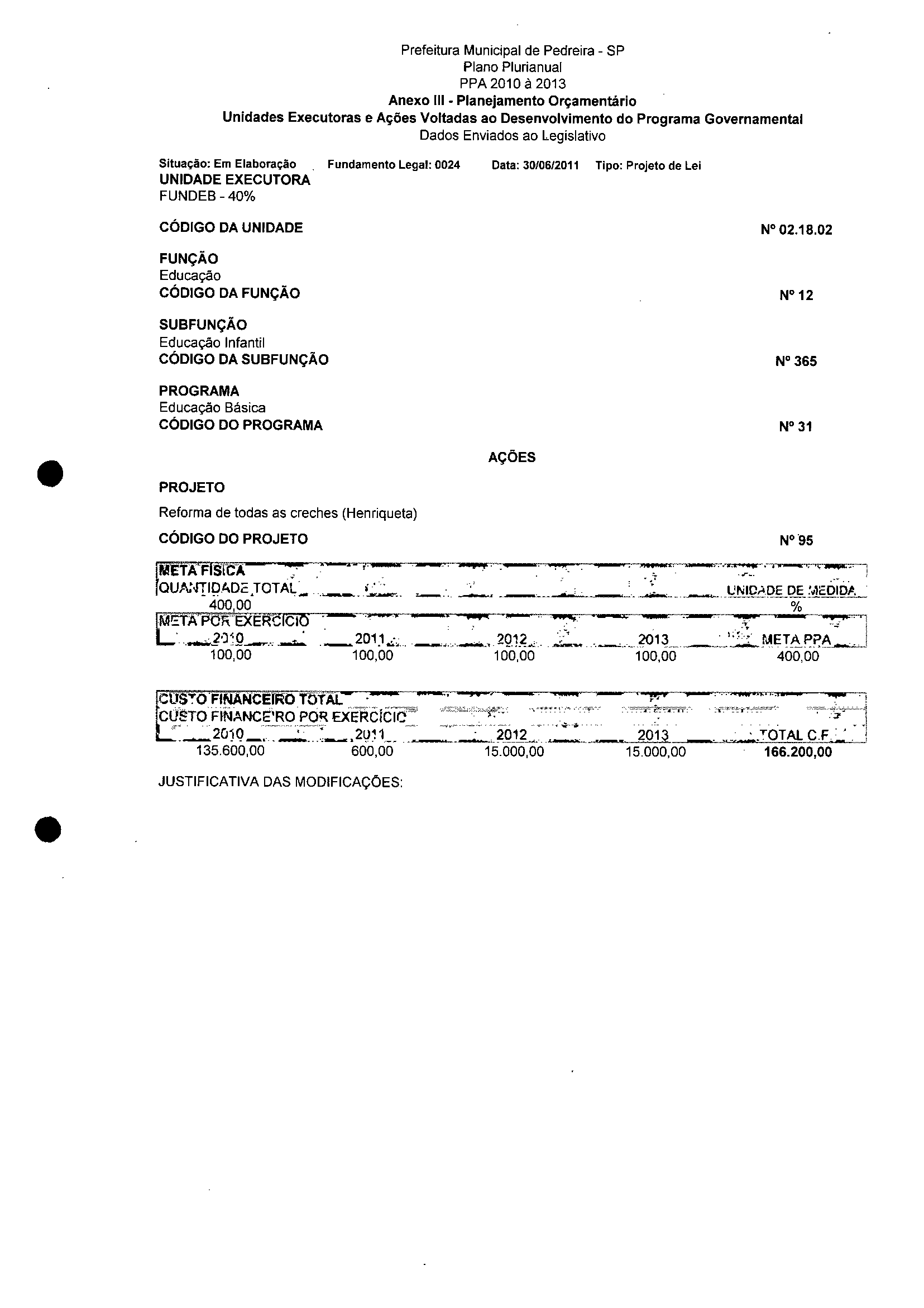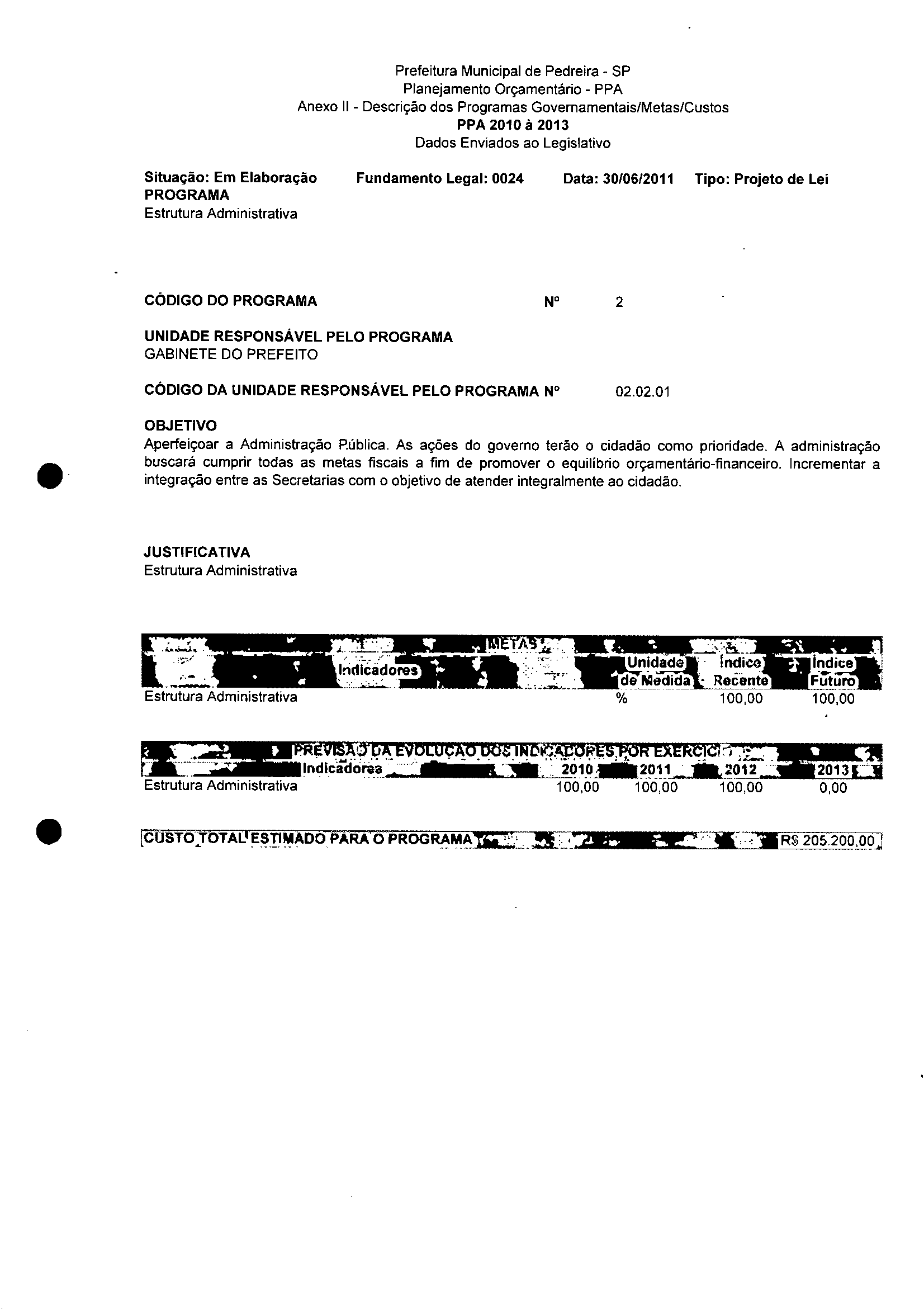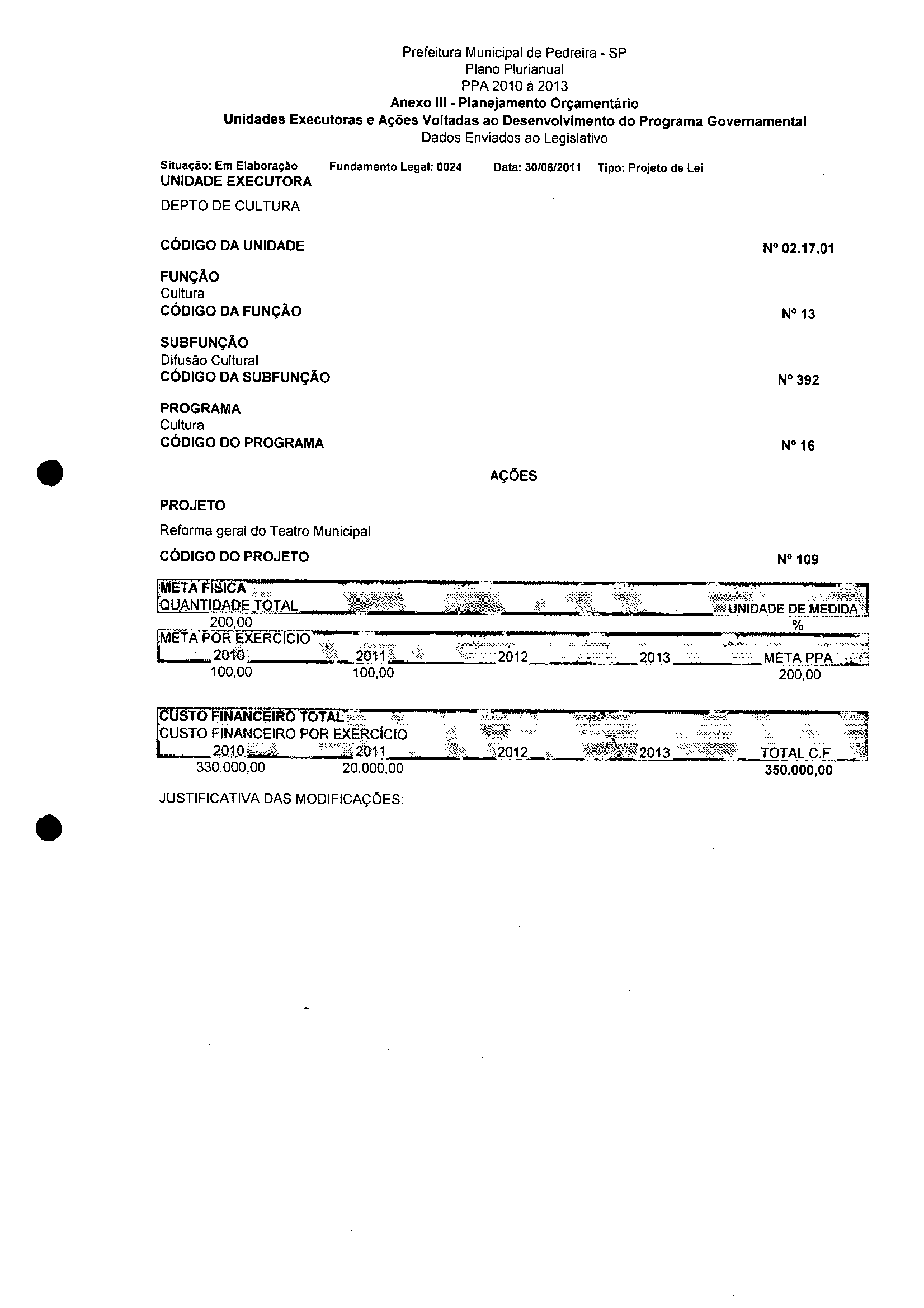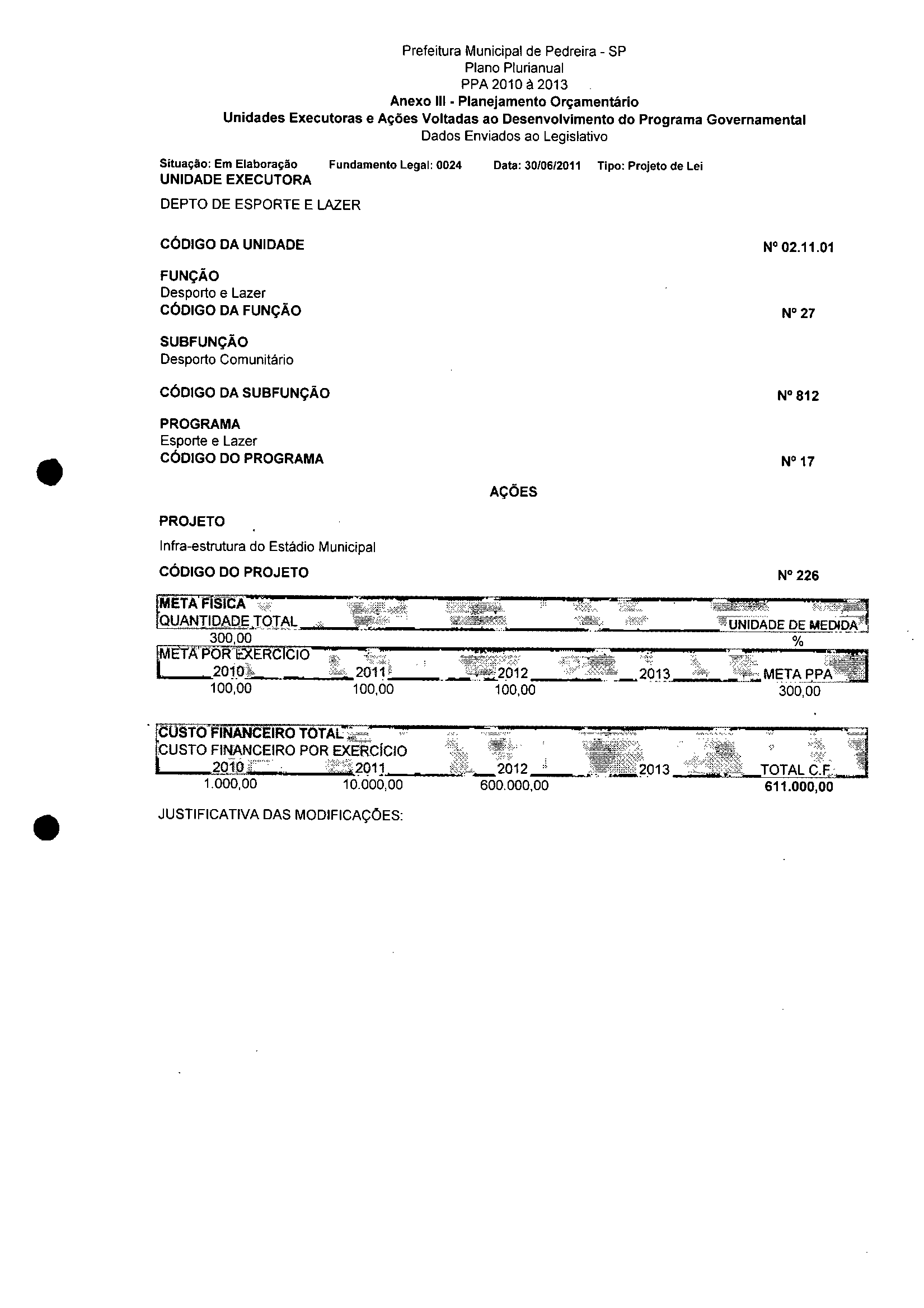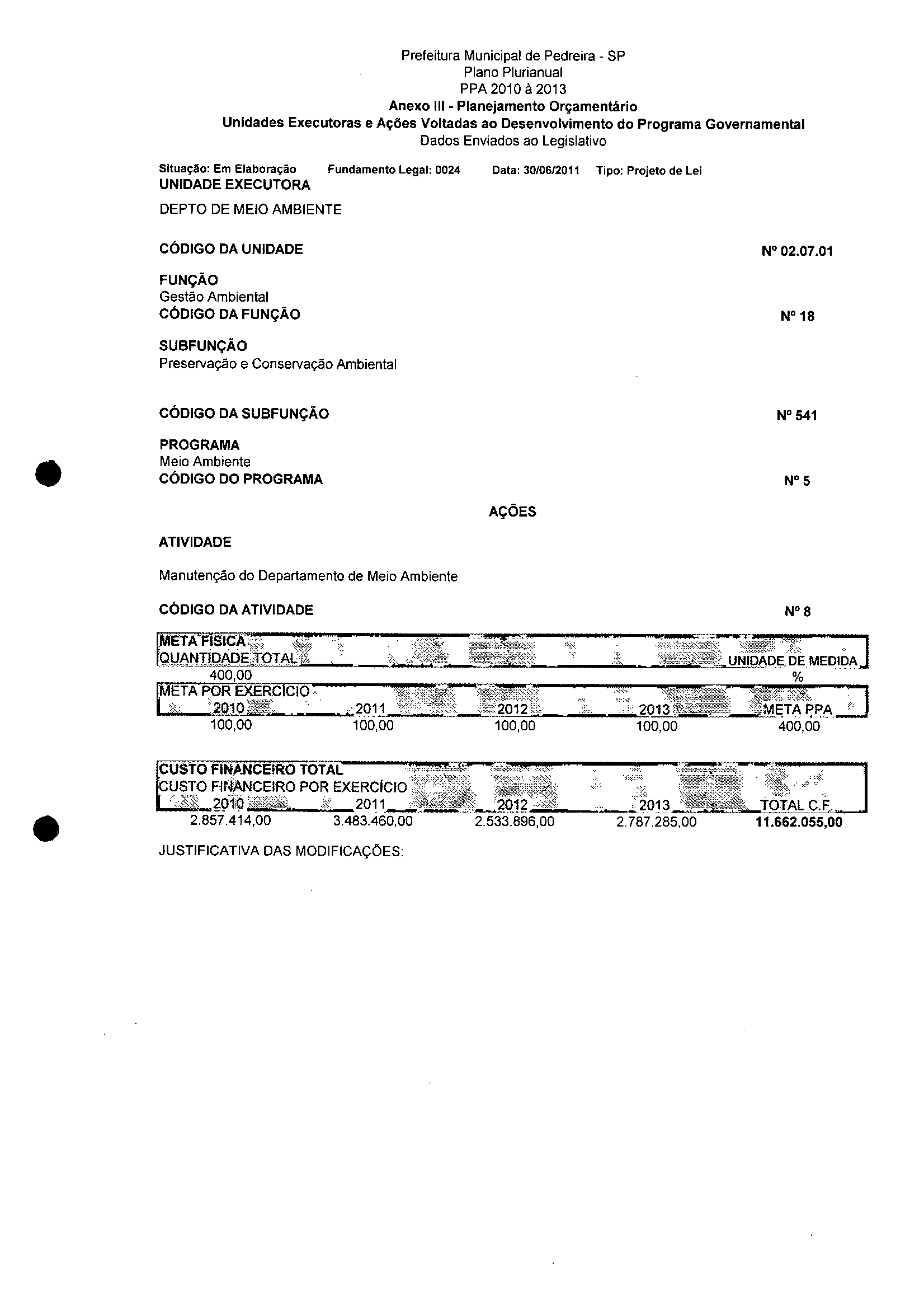 Ementa: Dispõe sobre a alteração dos anexos II e III - da Lei nº 2977, de 5 de novembro de 2009 - Plano Plurianual para o Quadriênio de 2010/2013 e a alteração dos anexos Ve VI -da Lei n° 3040, de 10 de junho de 2010 -Lei de Diretrizes Orçamentárias para o exercício de 2011.